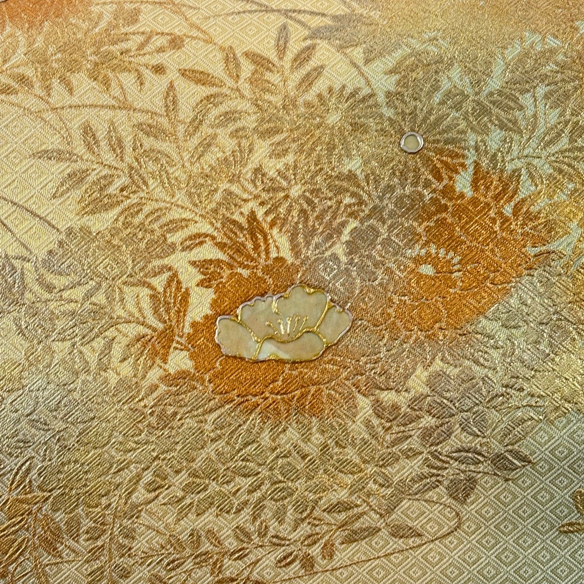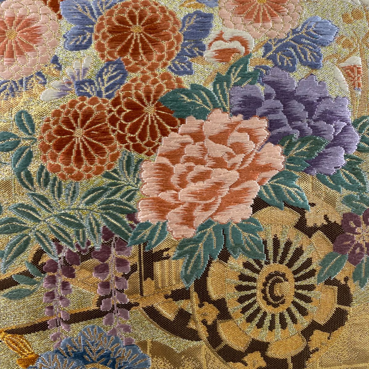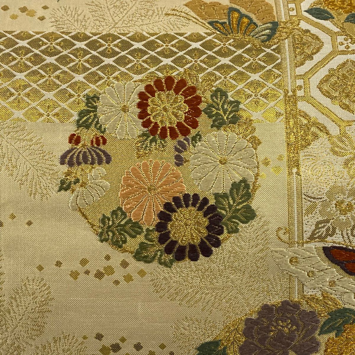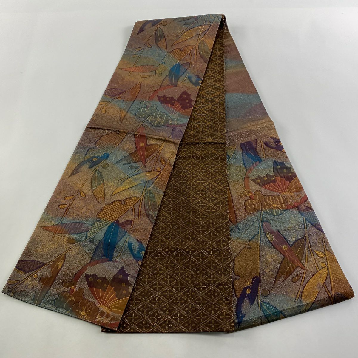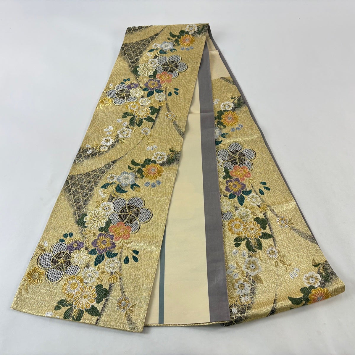 【在庫一掃】 袋帯 秀品 扇面 草花 金銀糸 箔 金色 六通 正絹