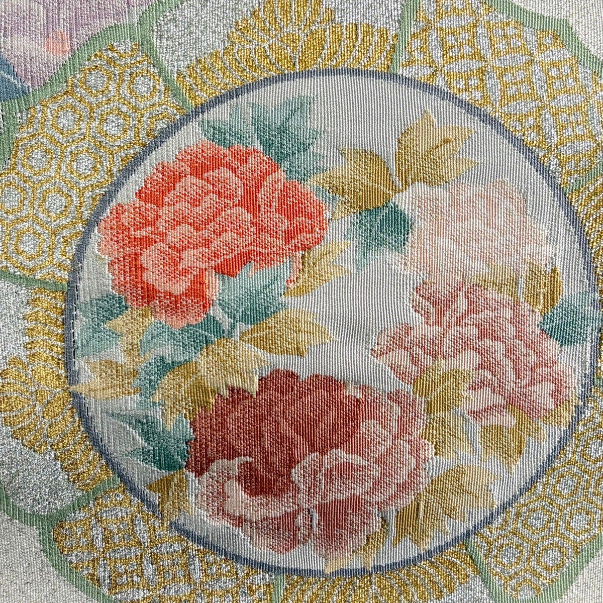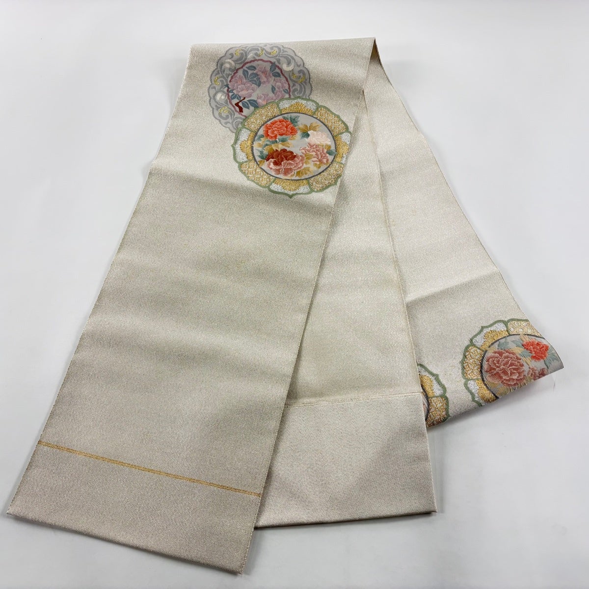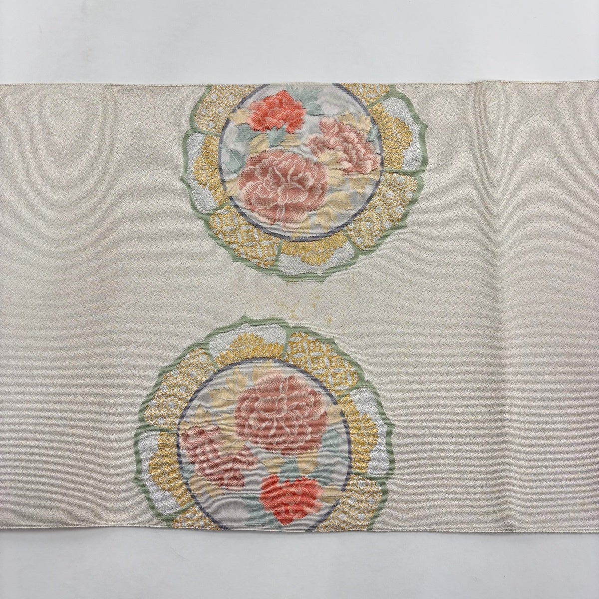 名古屋帯 秀品 八寸名古屋帯 松葉仕立て 椿 牡丹 銀糸 クリーム 正絹