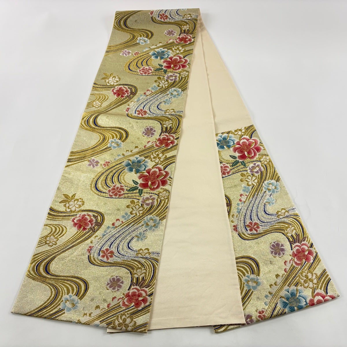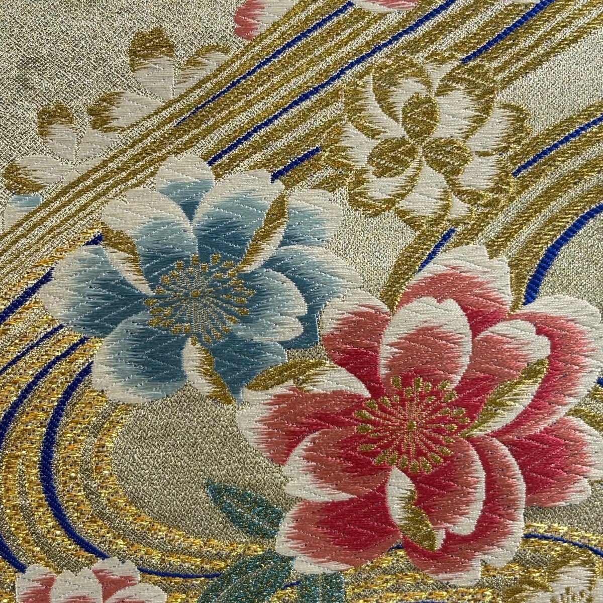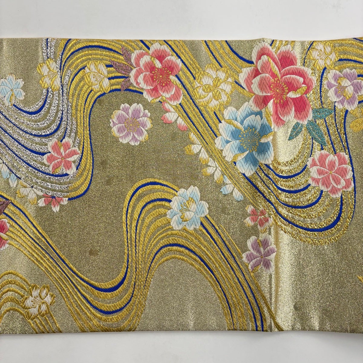 【美品】 袋帯 秀品 振袖向き 桜 流水 金糸 箔 金色 六通 正絹