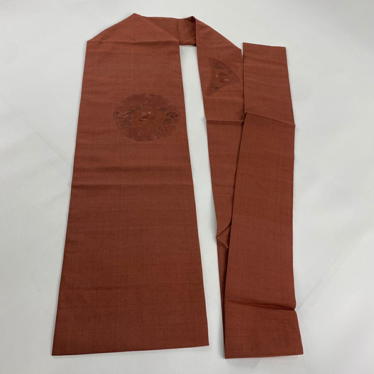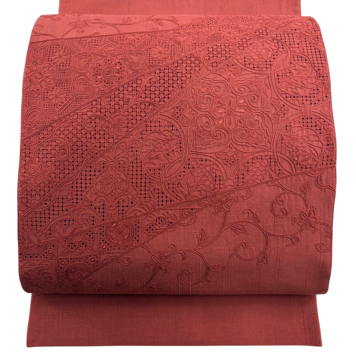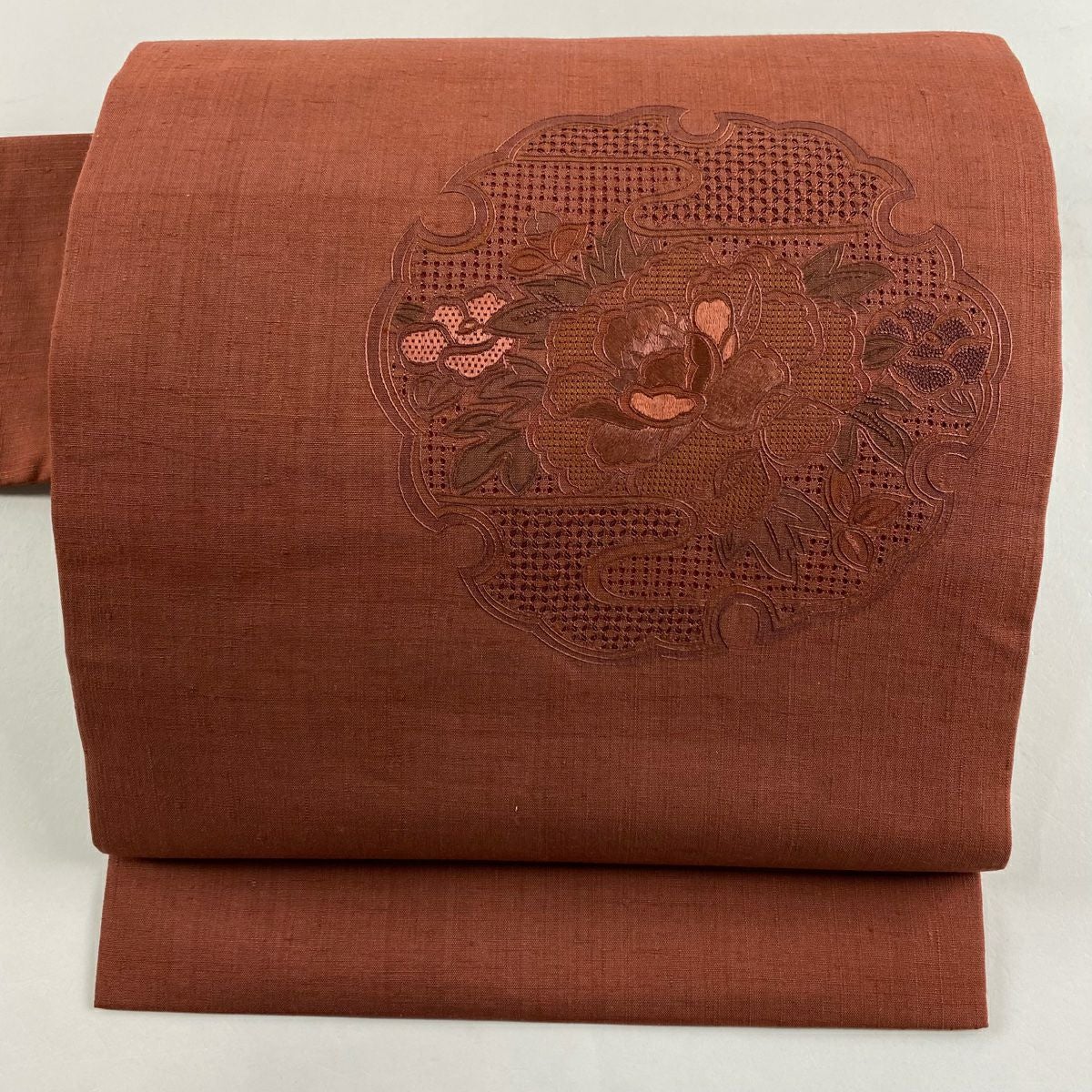 【美品】 袋帯 秀品 華文 花唐草 汕頭刺繍 赤茶 お太鼓柄 正絹