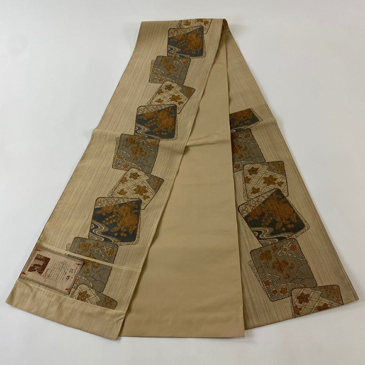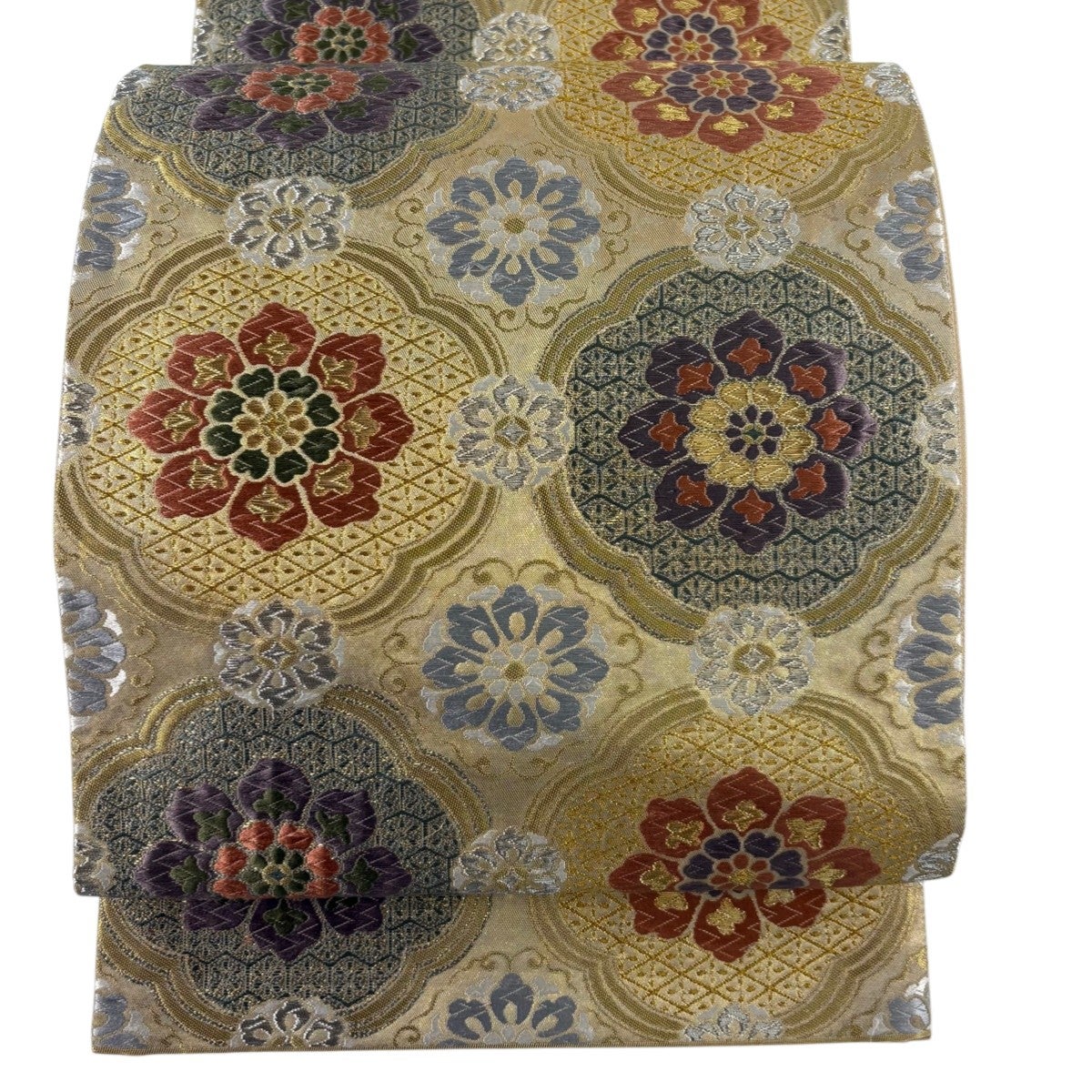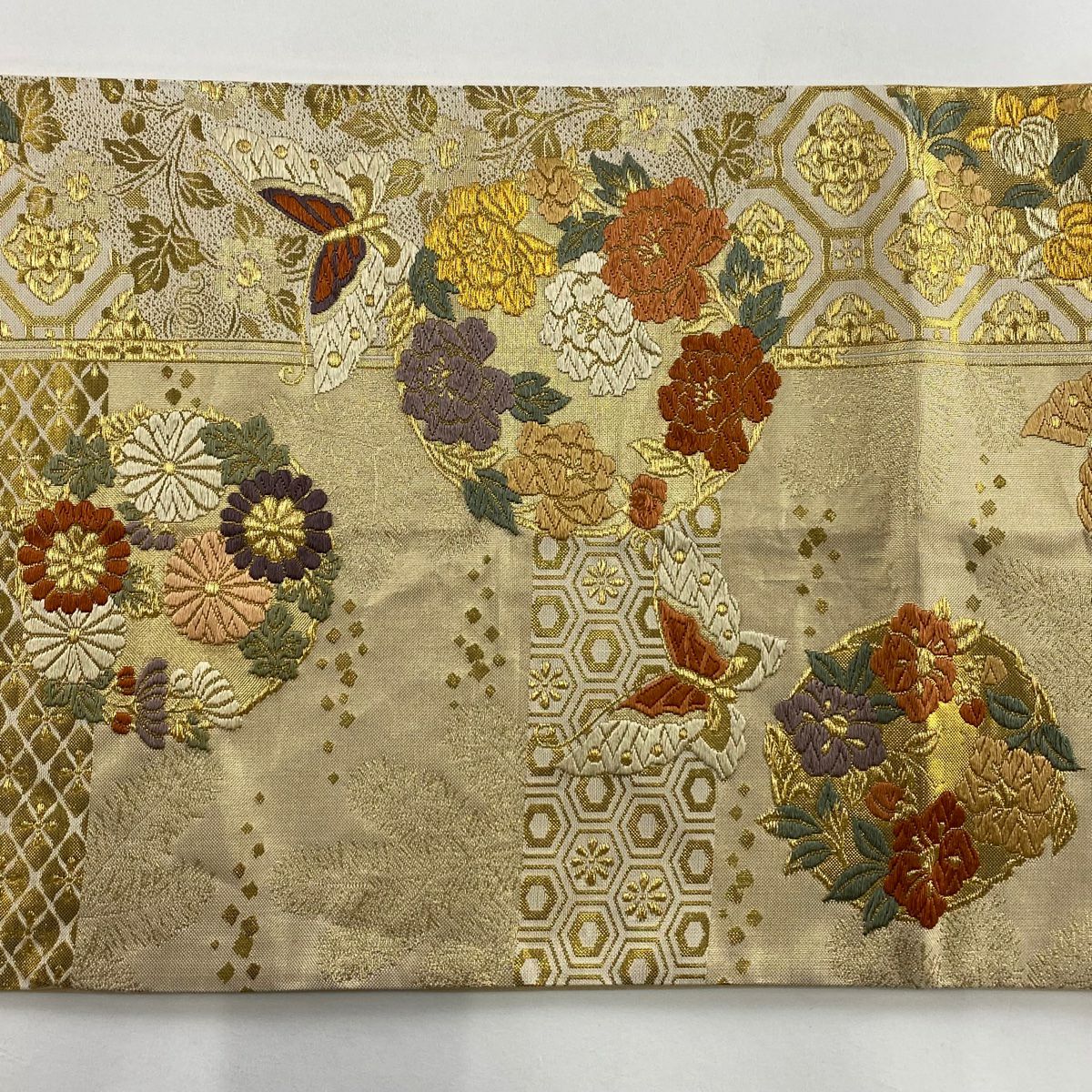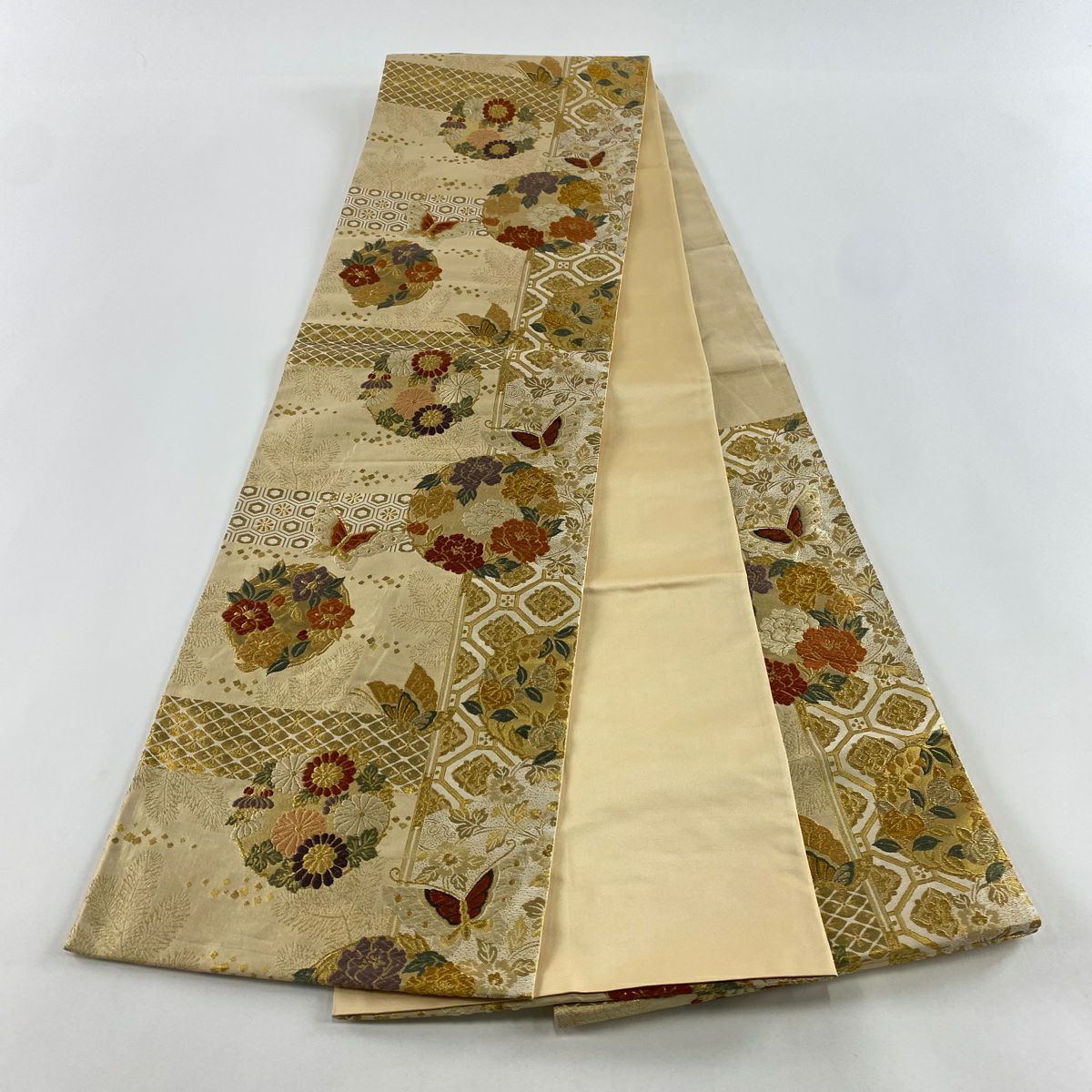 【美品】 袋帯 秀品 華文 菱格子 金糸 ベージュ 六通 正絹