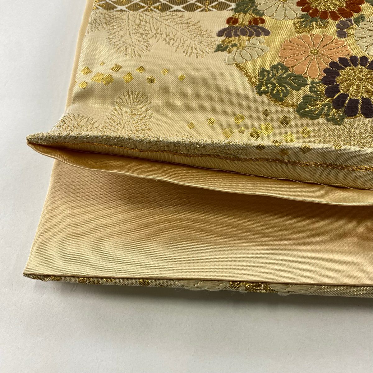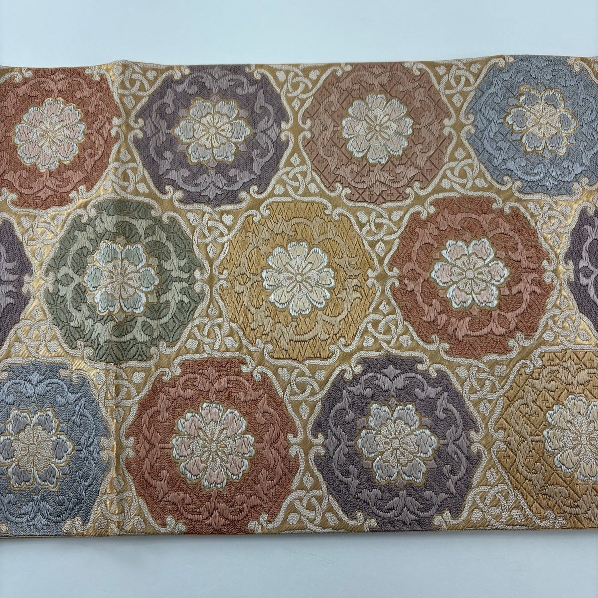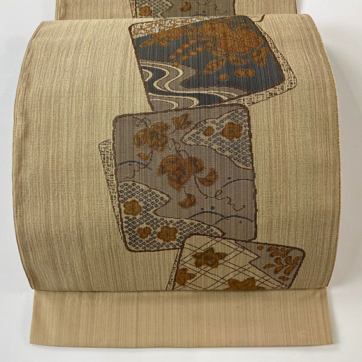 【美品】 袋帯 秀品 華文 菱格子 金糸 ベージュ 六通 正絹