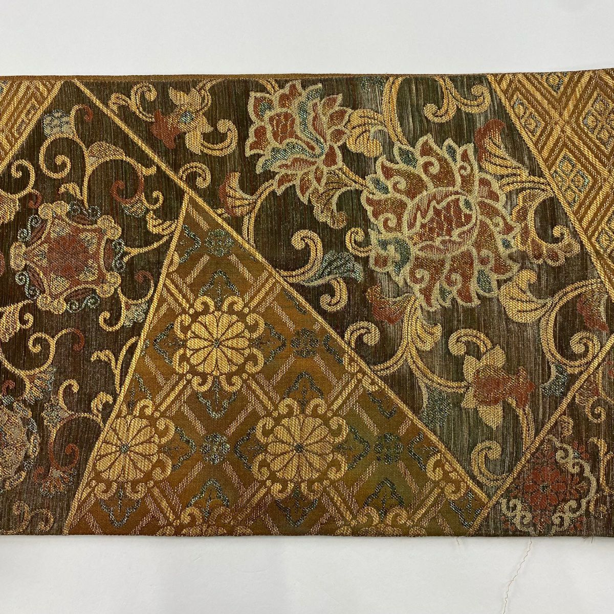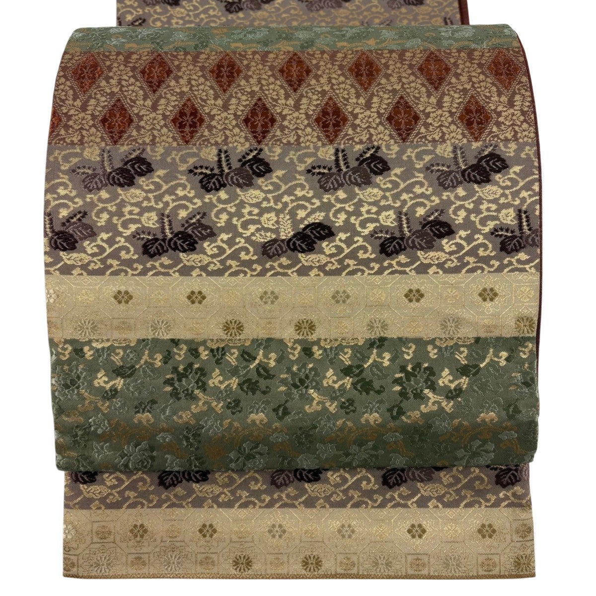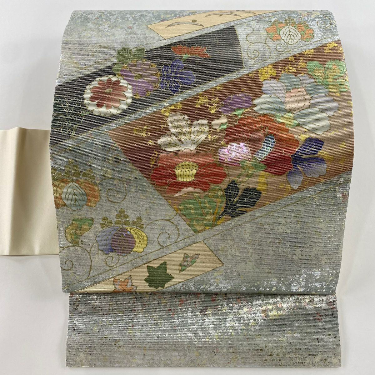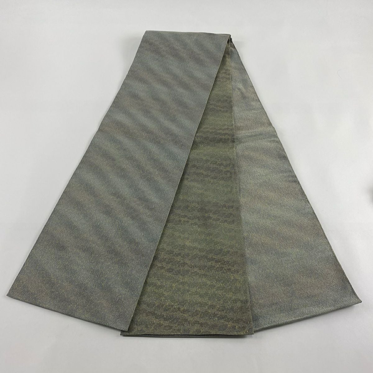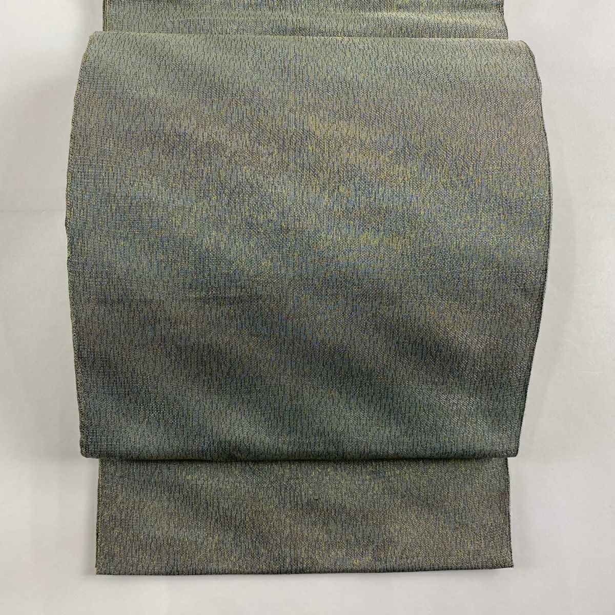 【在庫一掃】 袋帯 美品 秀品 幾何学 箔 灰緑 お太鼓柄 正絹