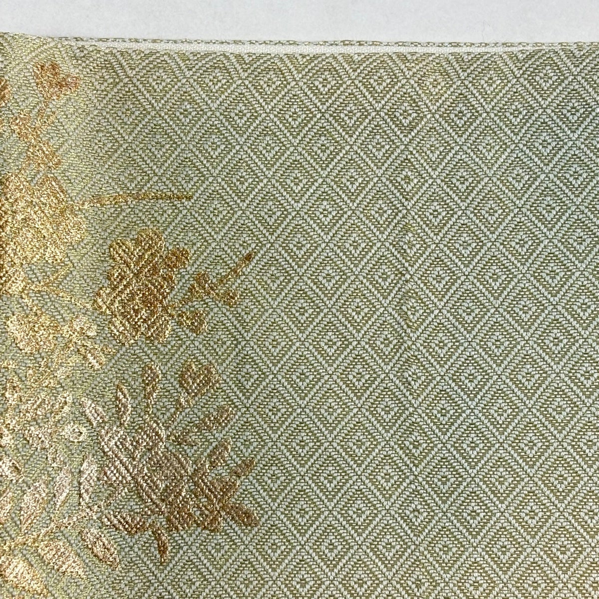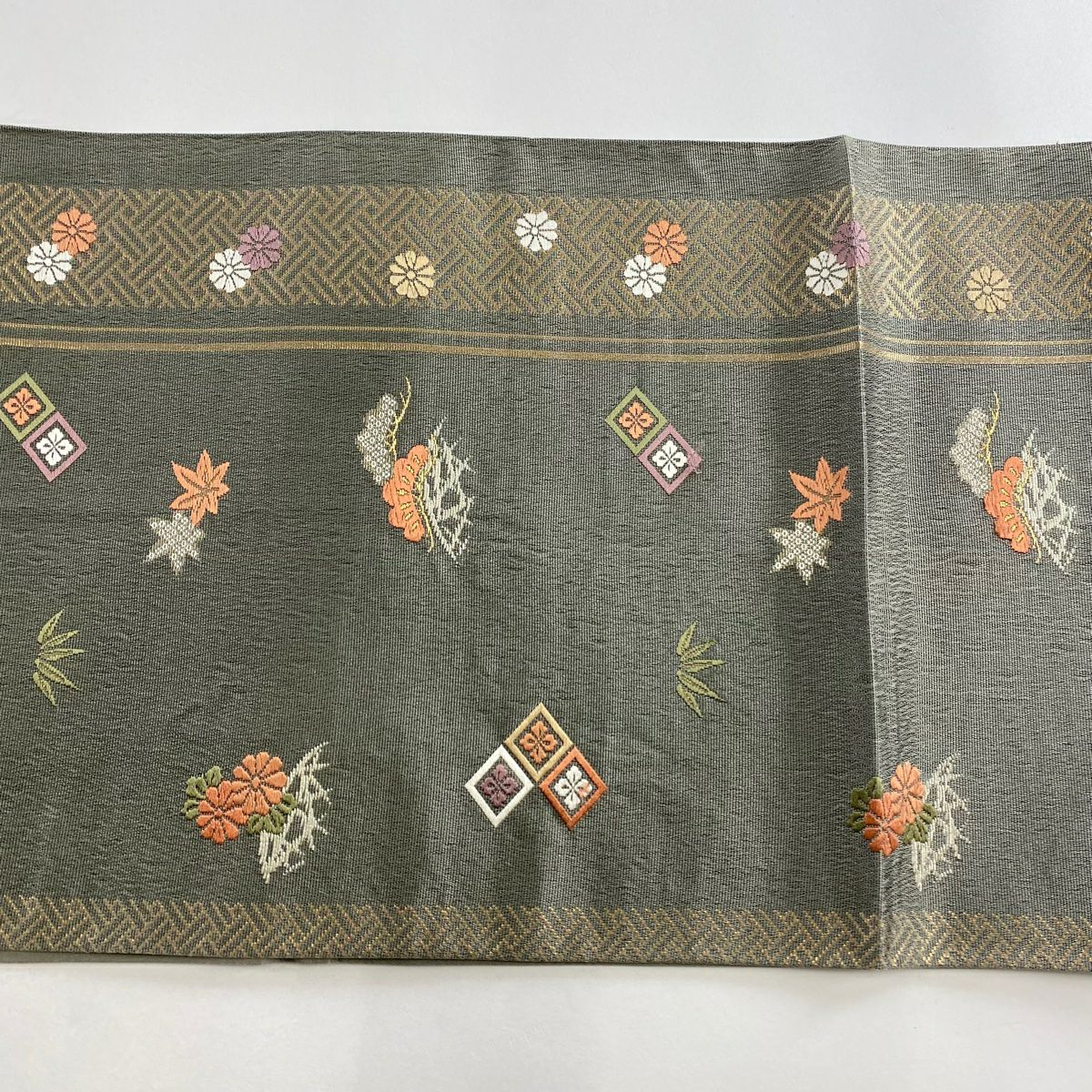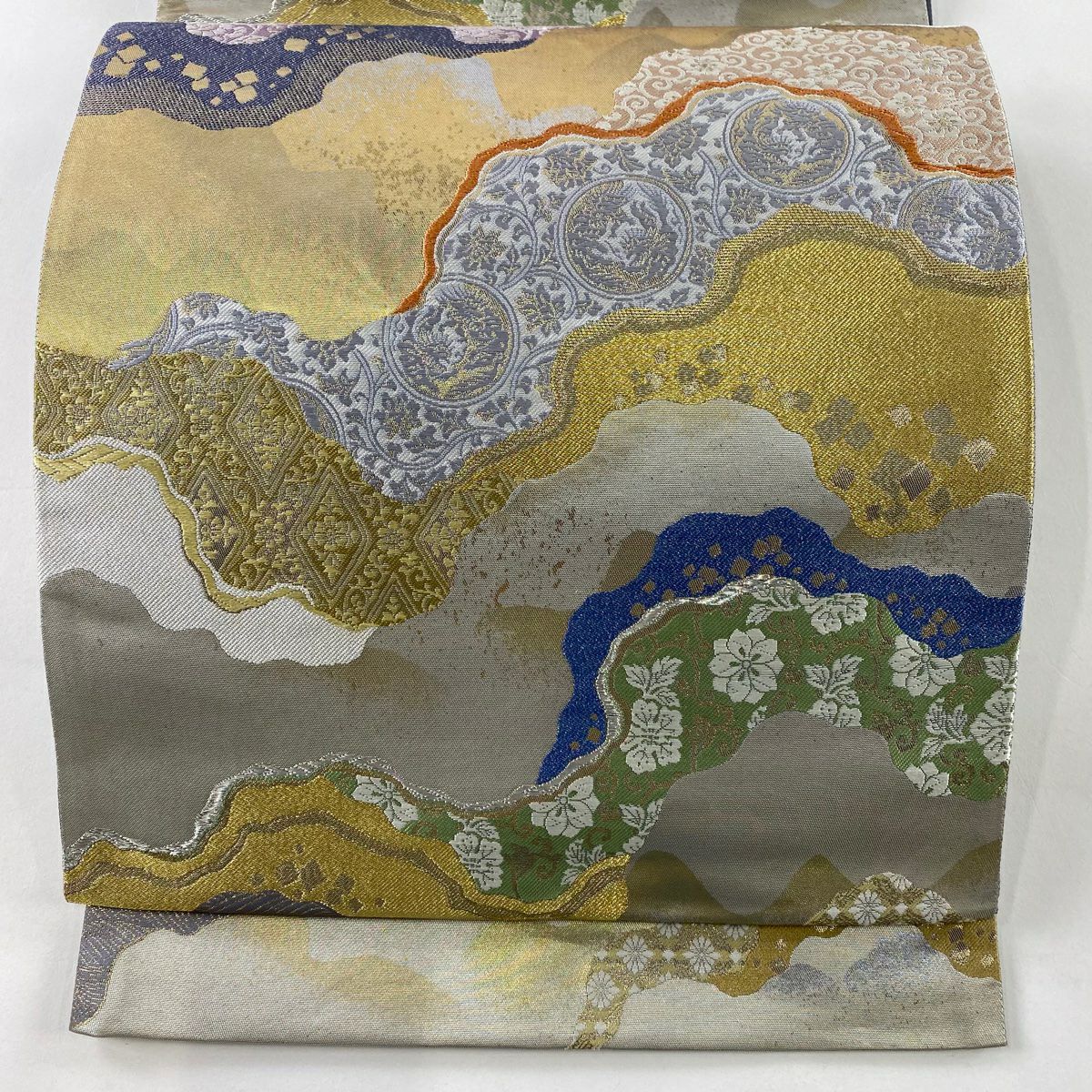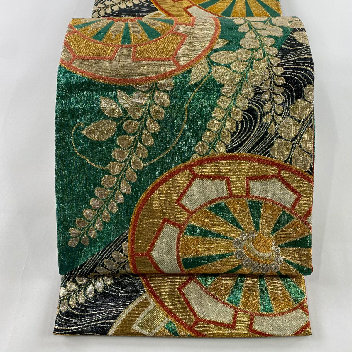 【在庫一掃】 袋帯 美品 秀品 幾何学 箔 灰緑 お太鼓柄 正絹