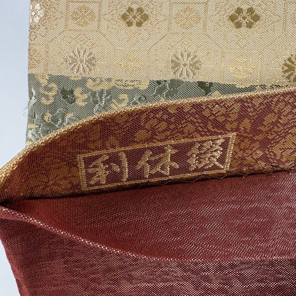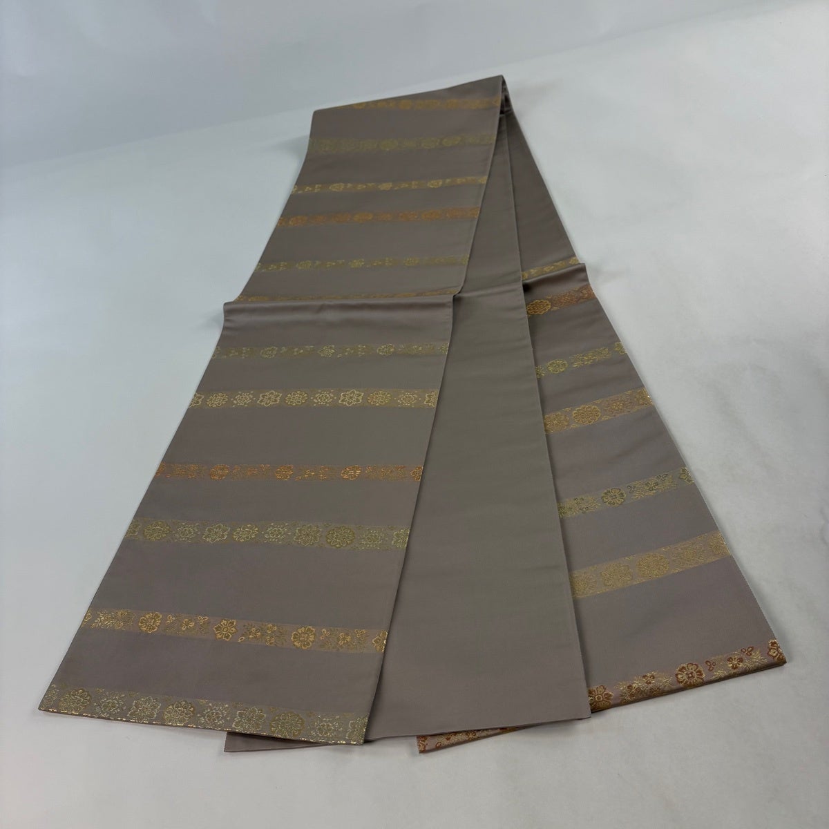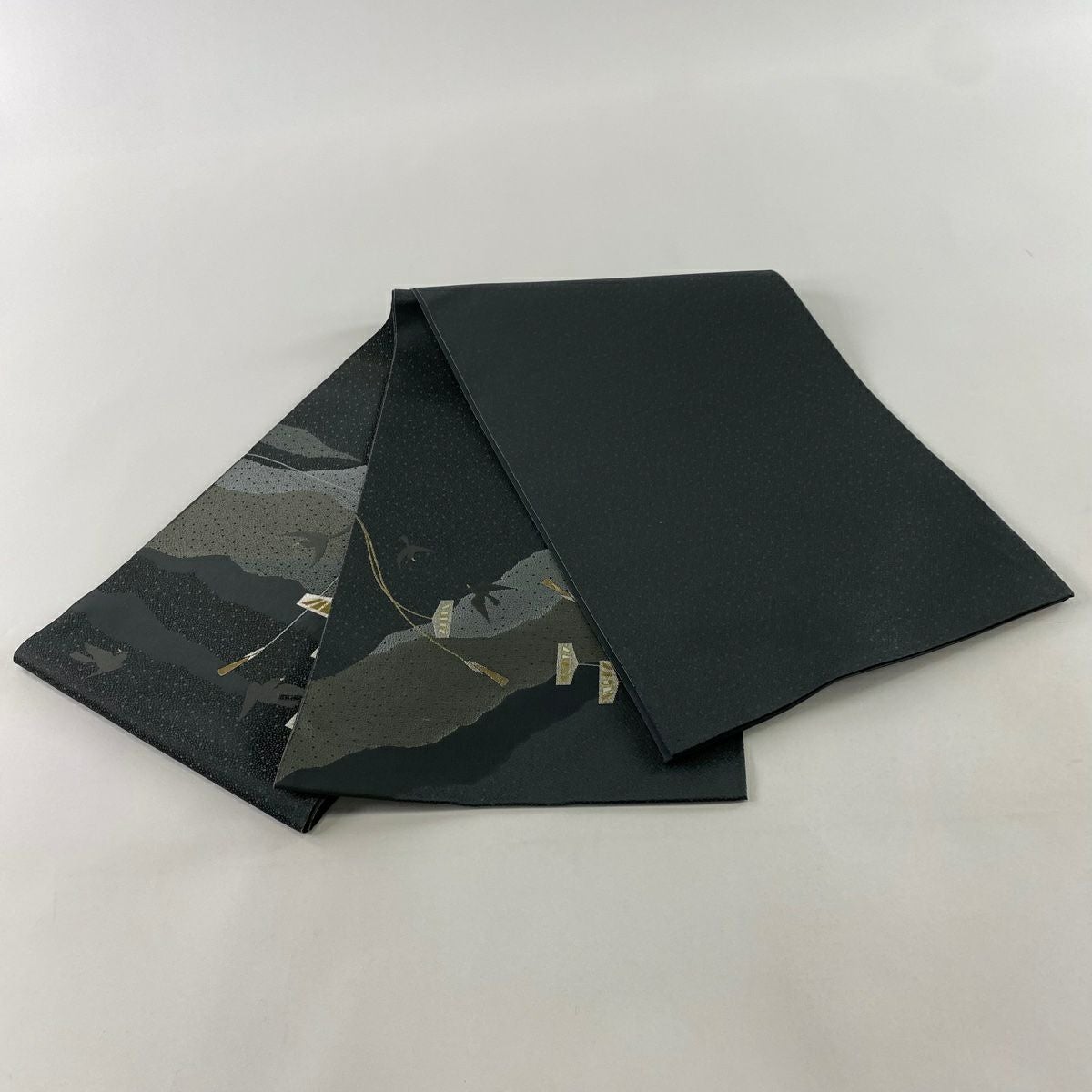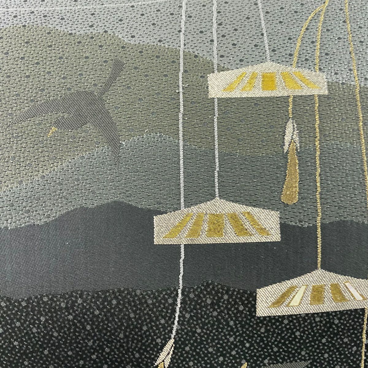 【在庫一掃】 袋帯 美品 秀品 幾何学 箔 灰緑 お太鼓柄 正絹