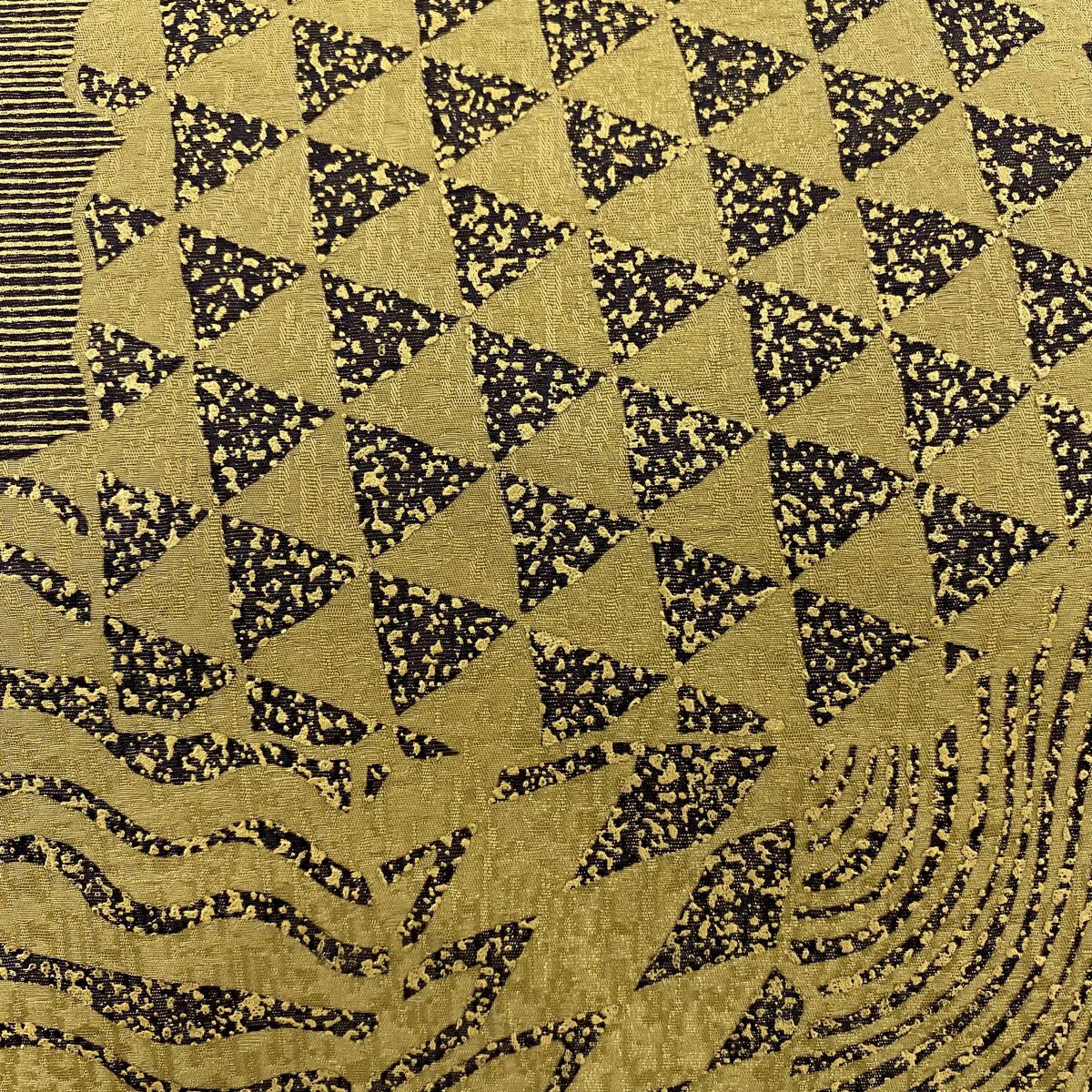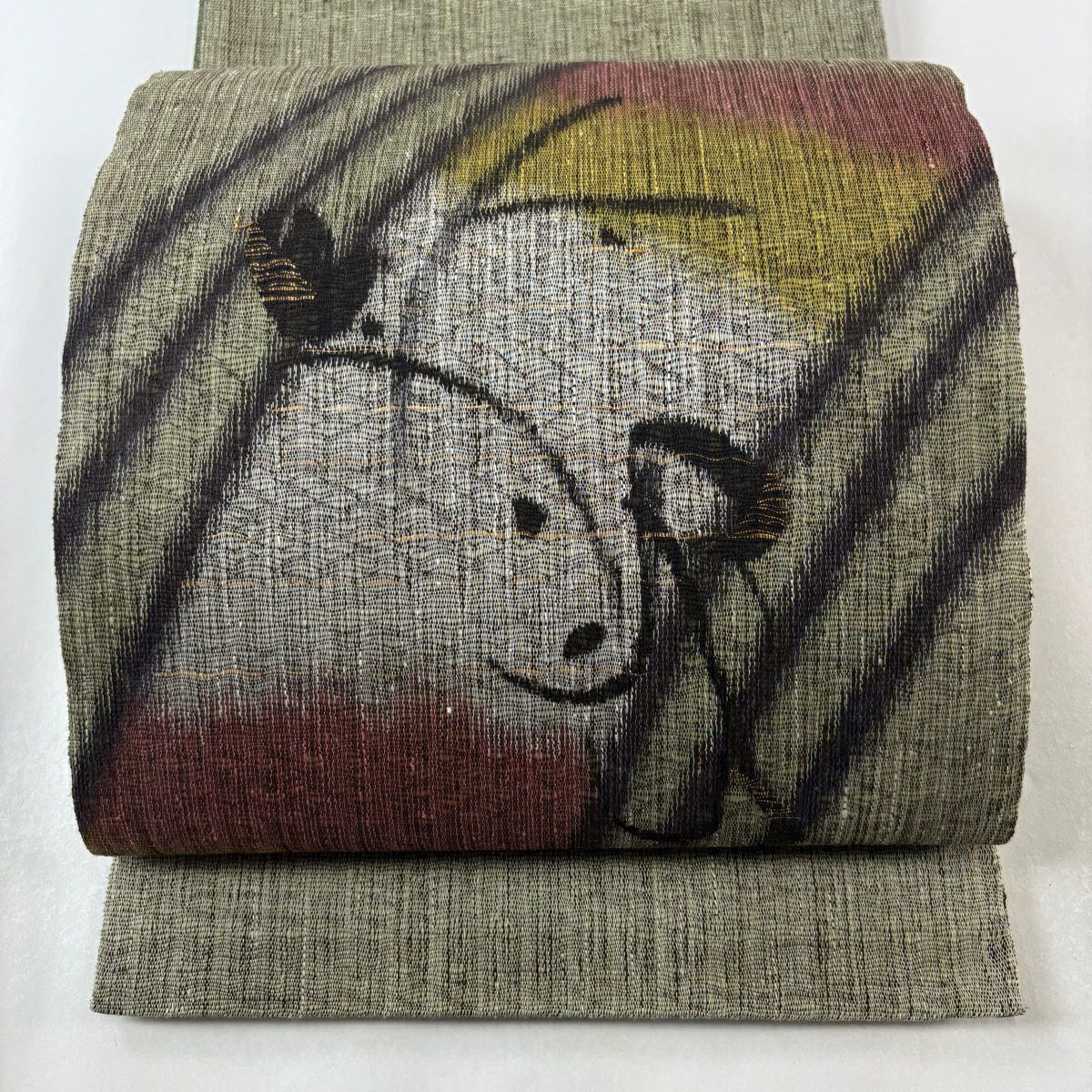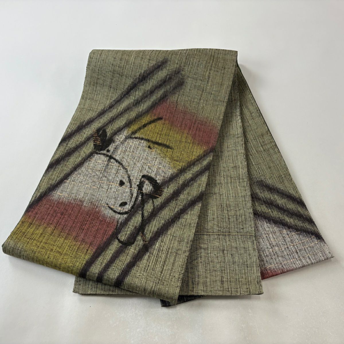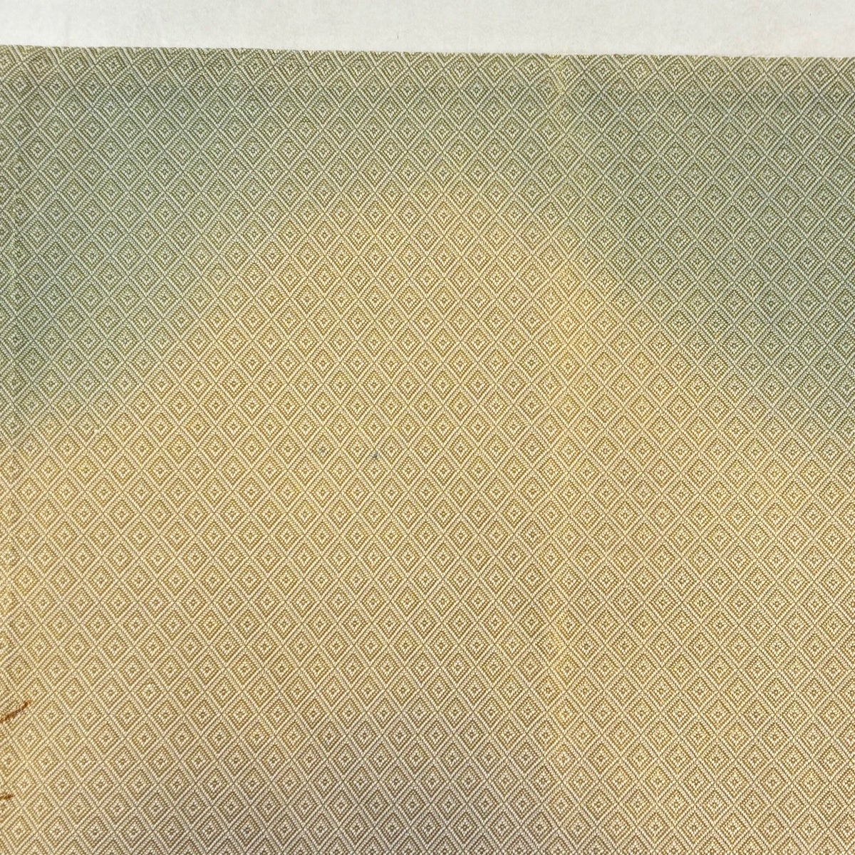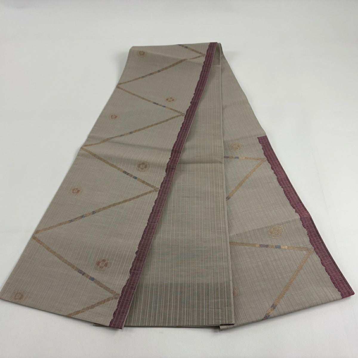 【在庫一掃】 袋帯 美品 秀品 幾何学 箔 灰緑 お太鼓柄 正絹