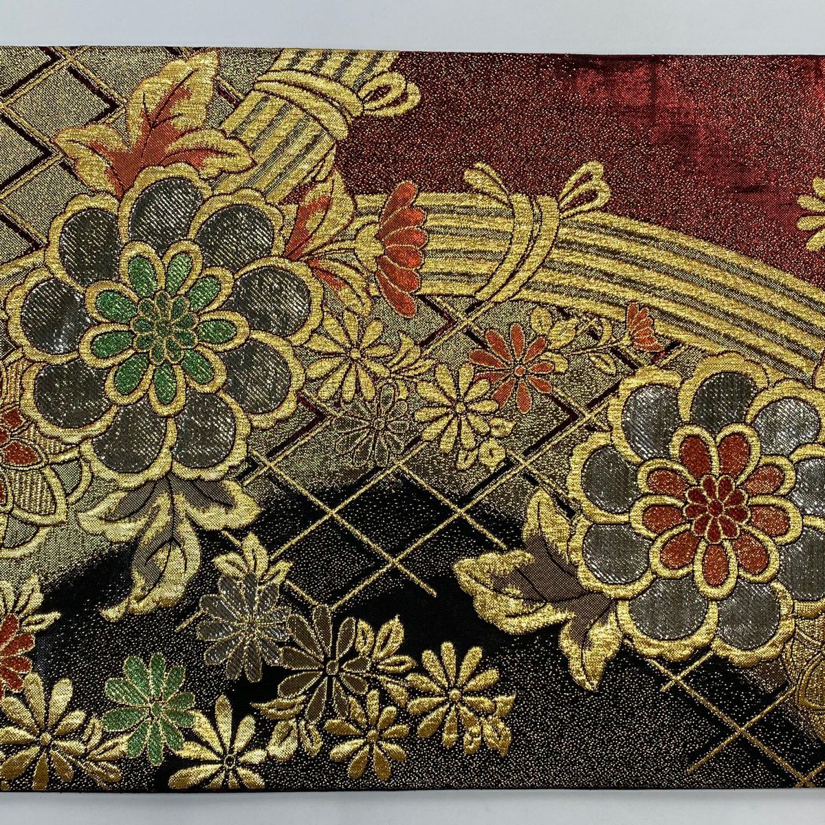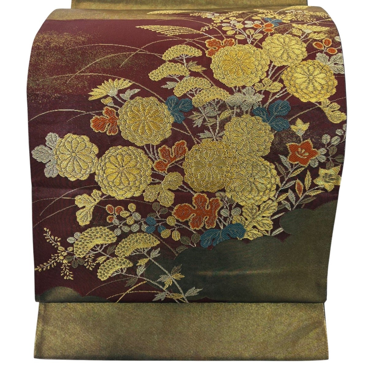袋帯 秀品 鈴乃屋 秋草 雲文 金糸 箔 えんじ色 お太鼓柄 正絹