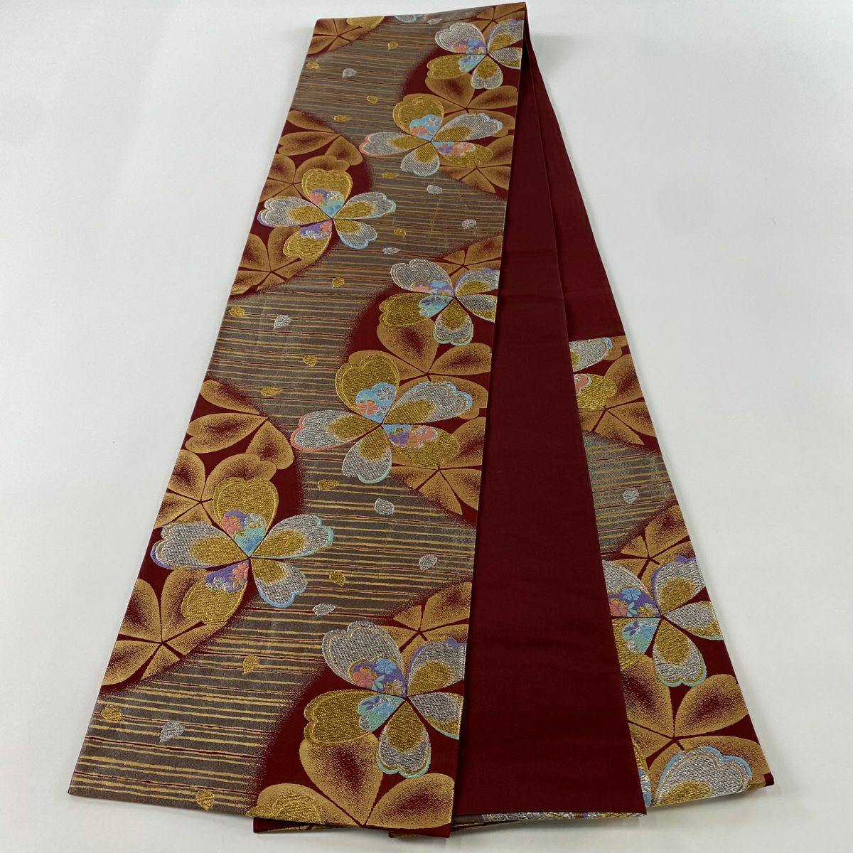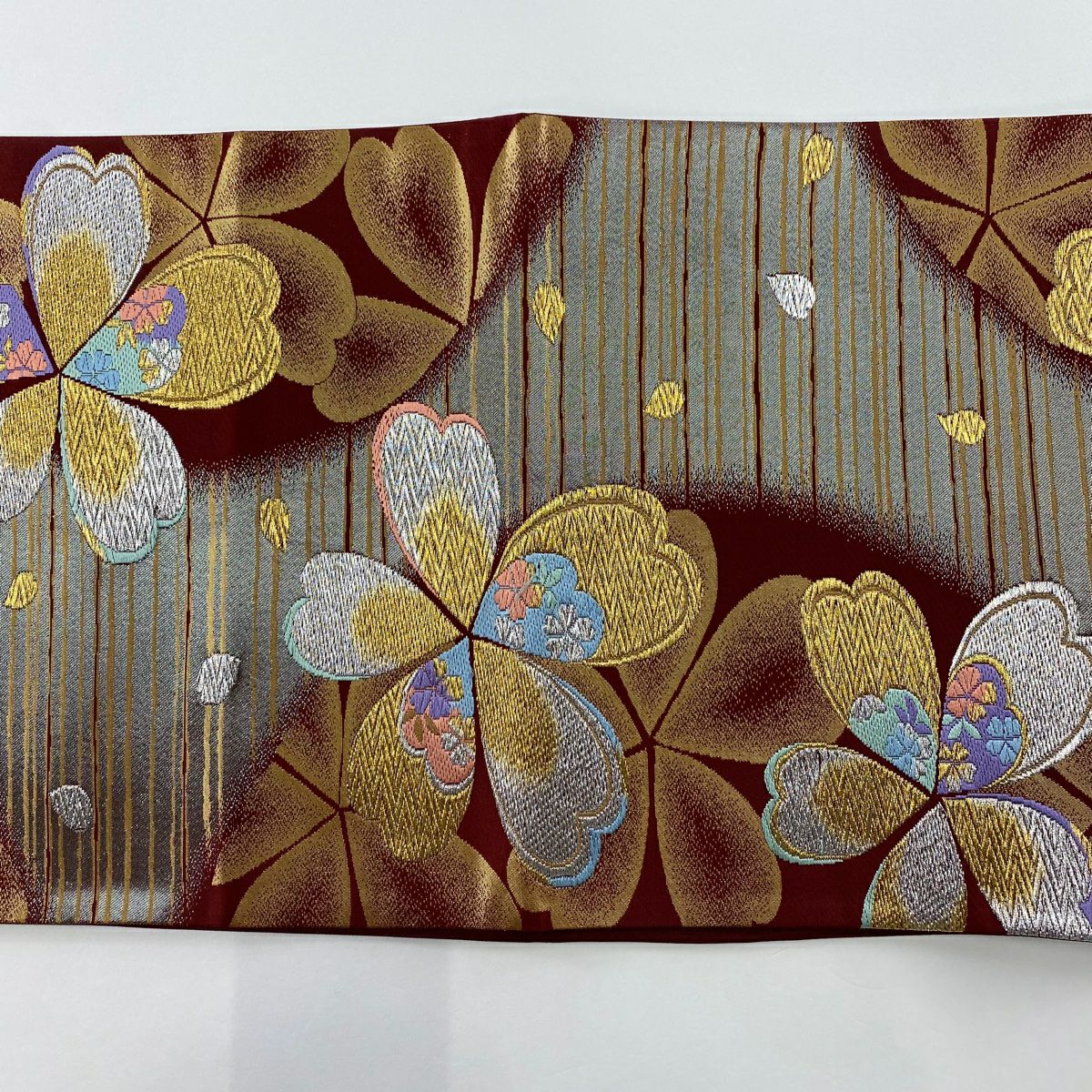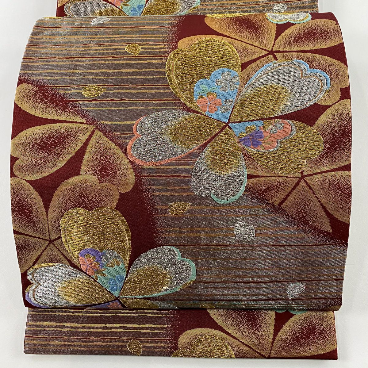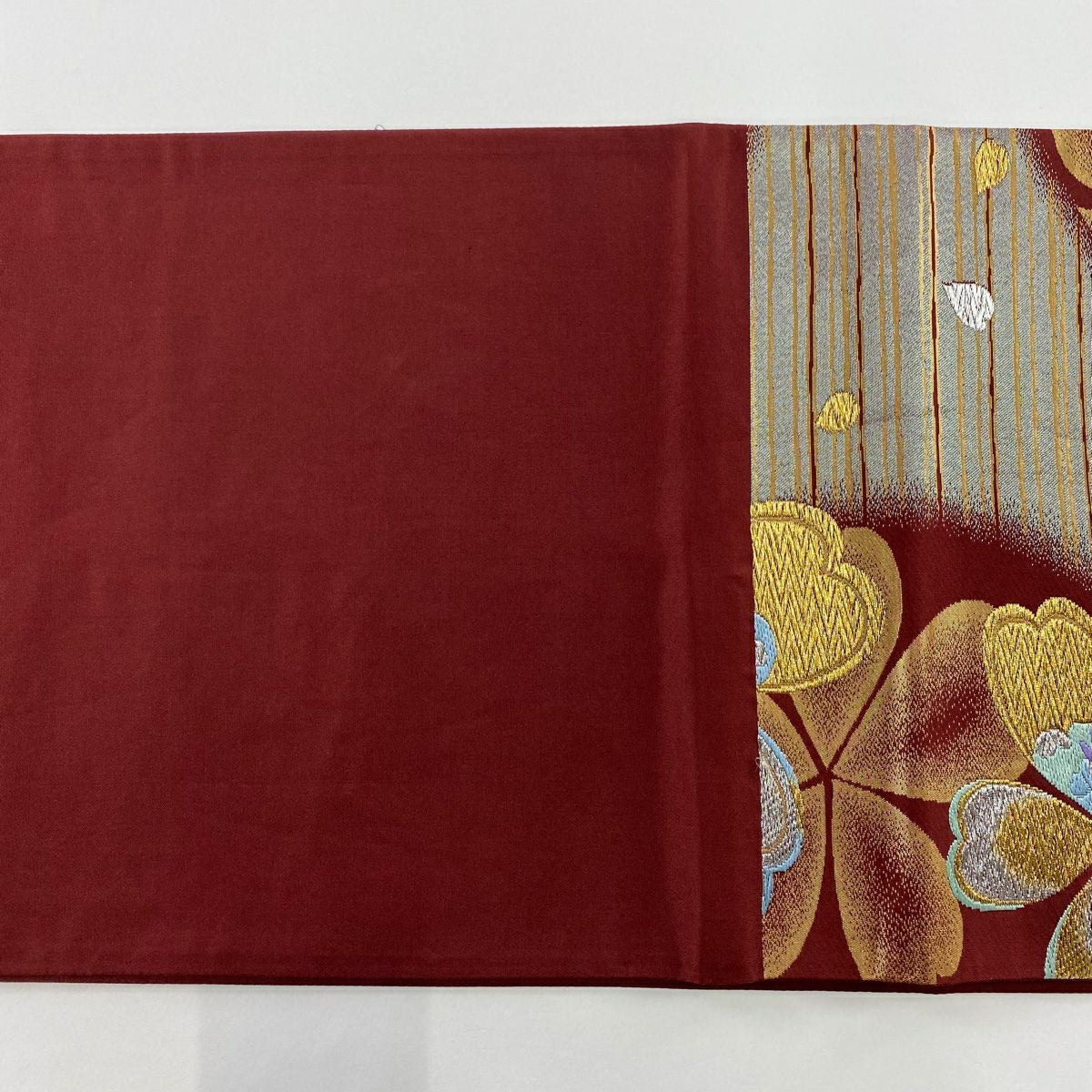 【在庫一掃】 袋帯 秀品 桜 縞 唐織 箔 えんじ色 六通 正絹