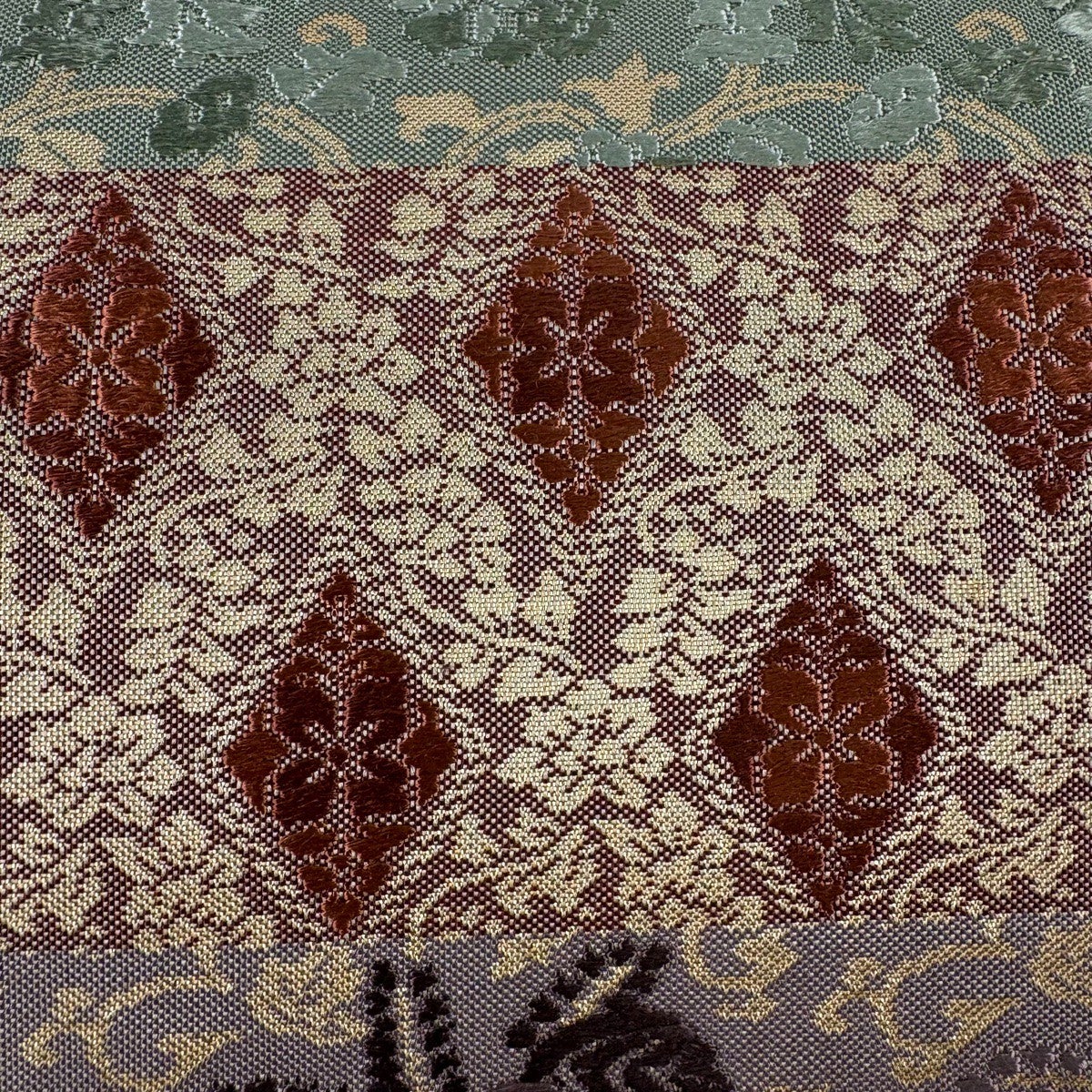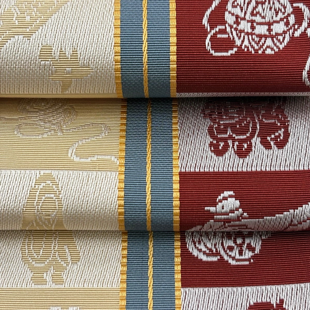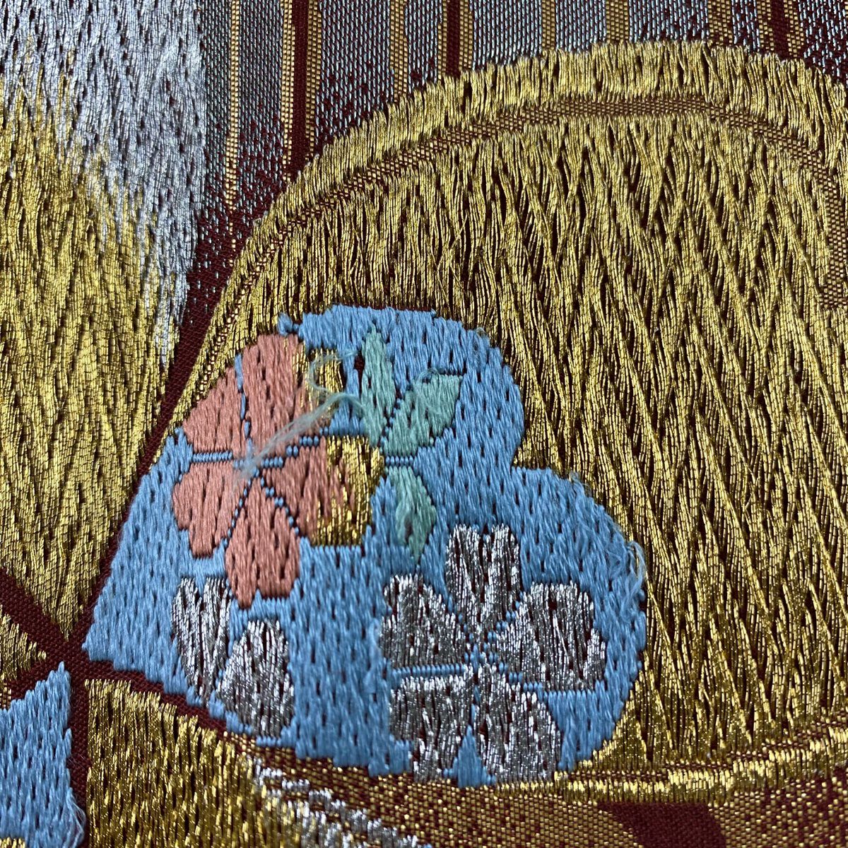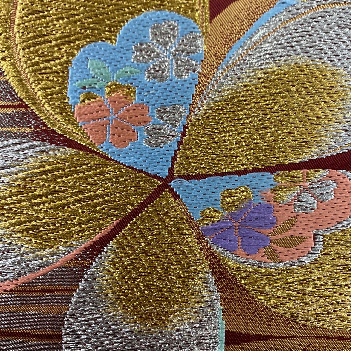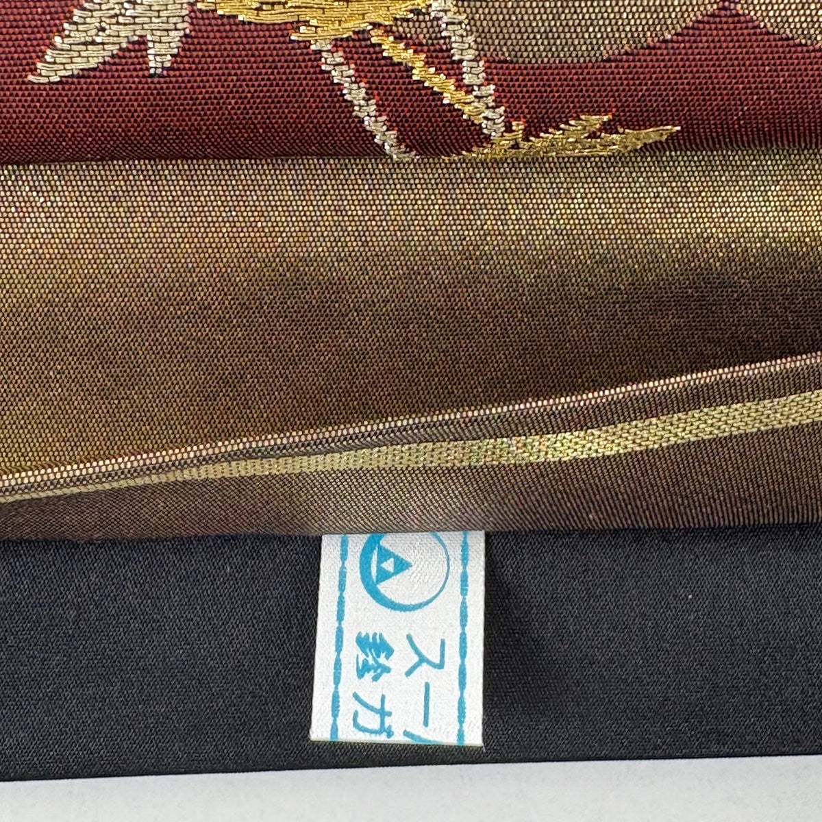 【在庫一掃】 袋帯 秀品 桜 縞 唐織 箔 えんじ色 六通 正絹