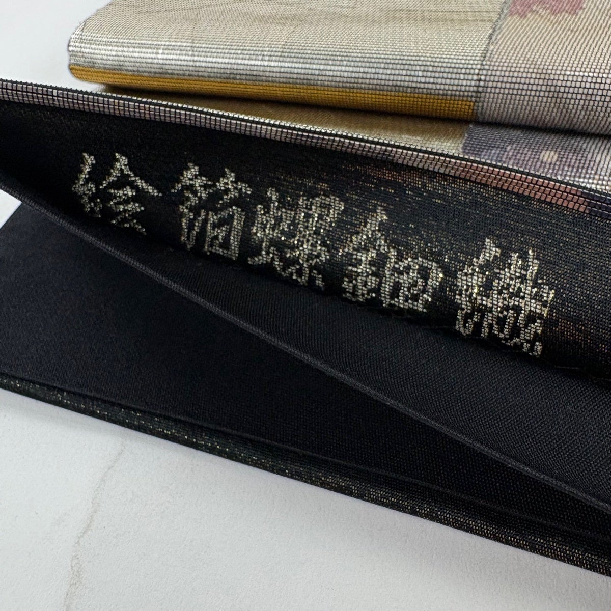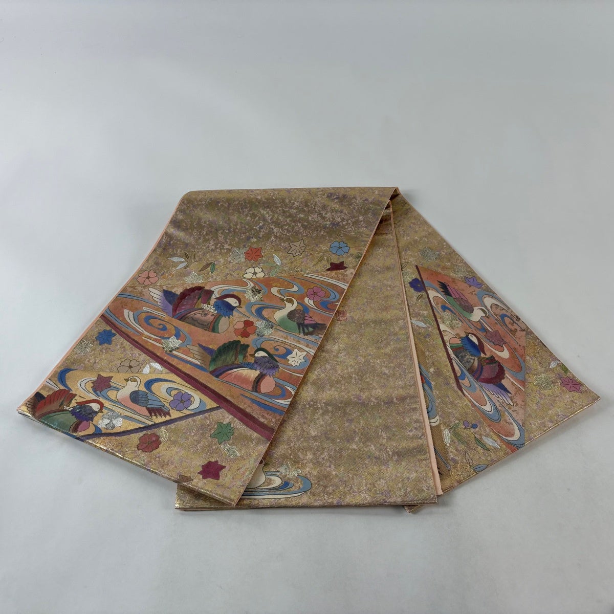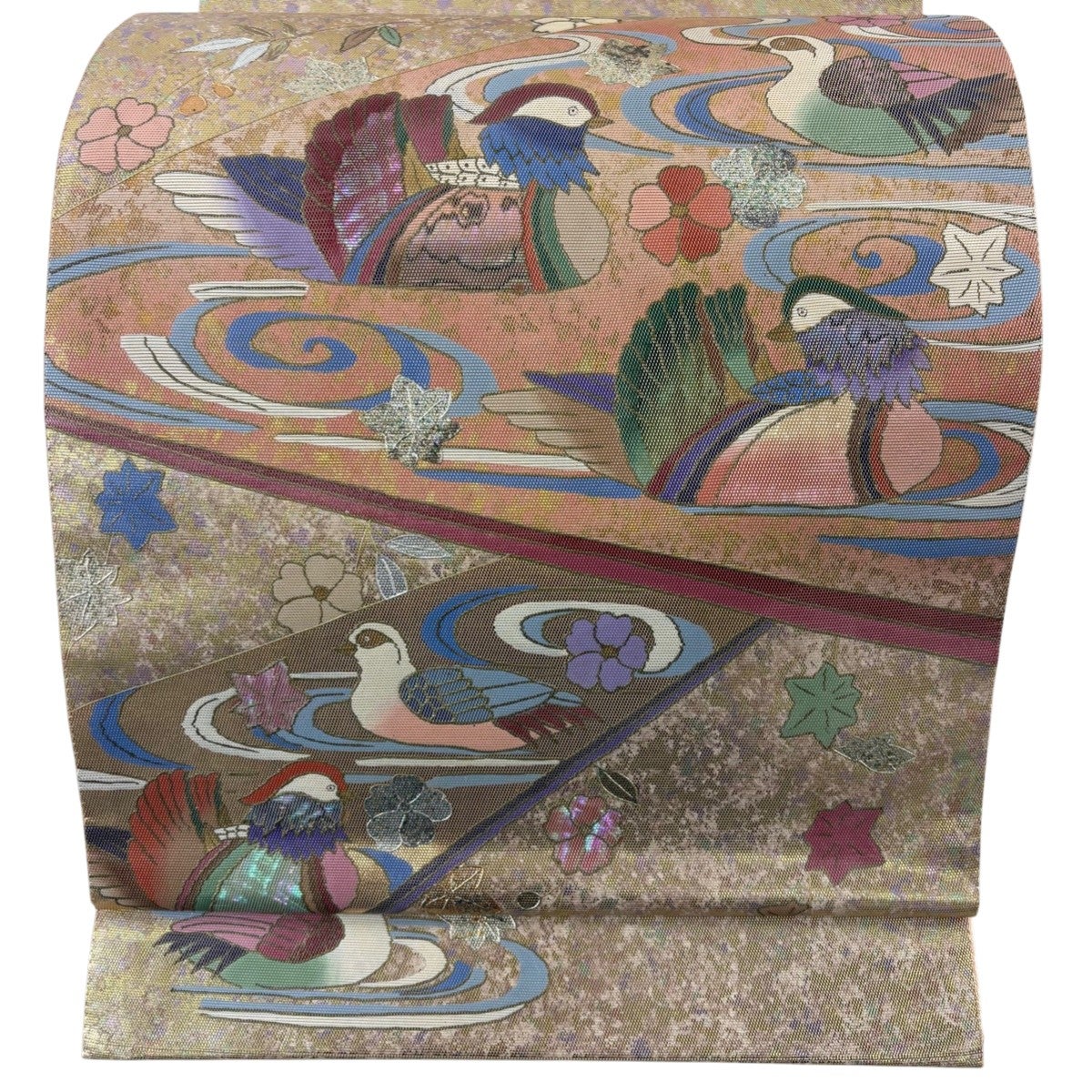袋帯 秀品 落款あり 鴛鴦 桜 螺鈿箔 金銀彩 金色 お太鼓柄 正絹