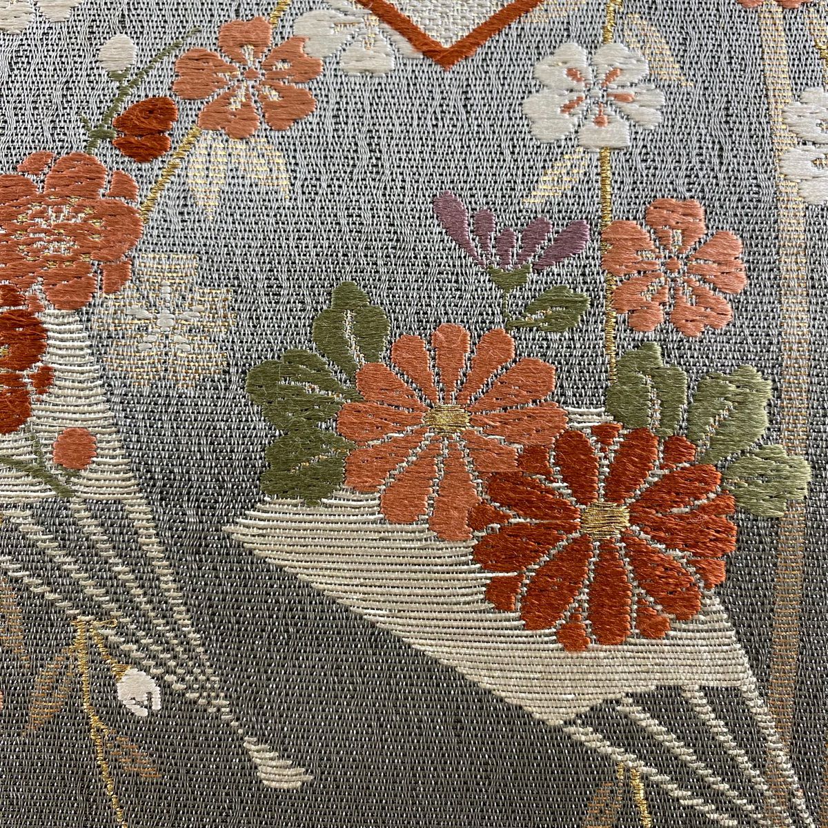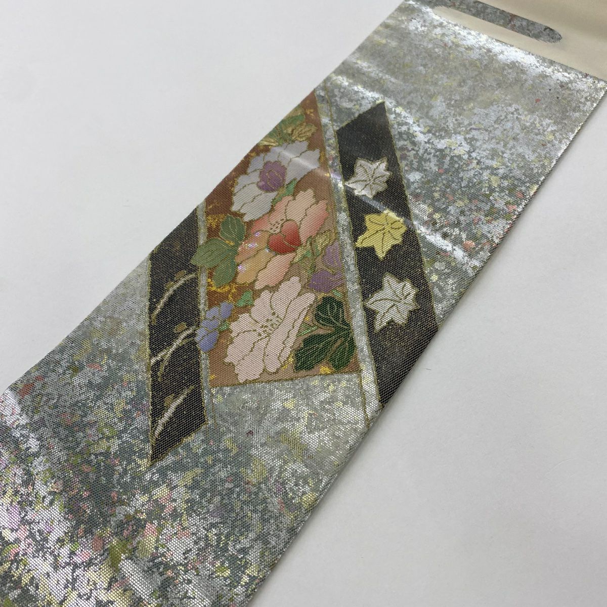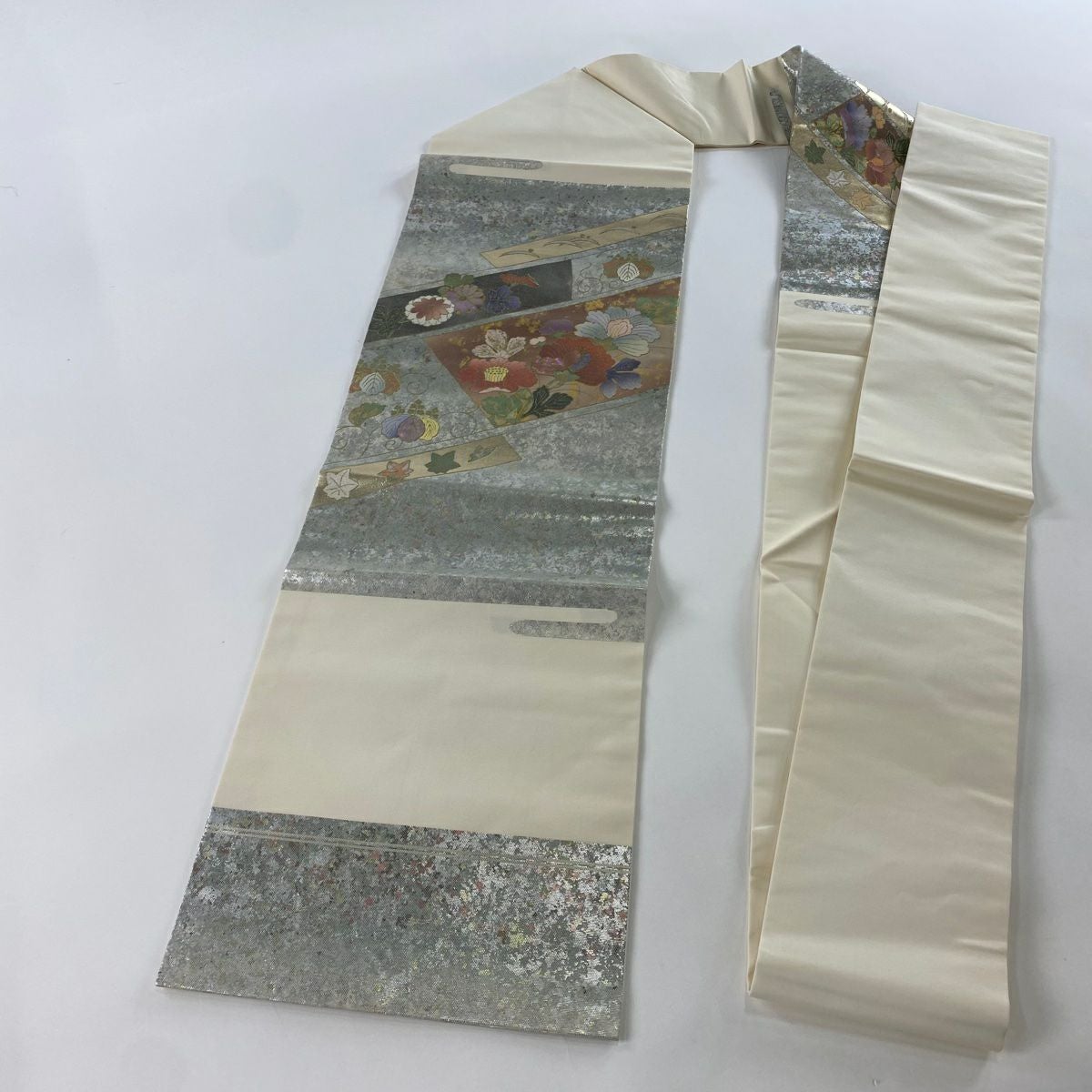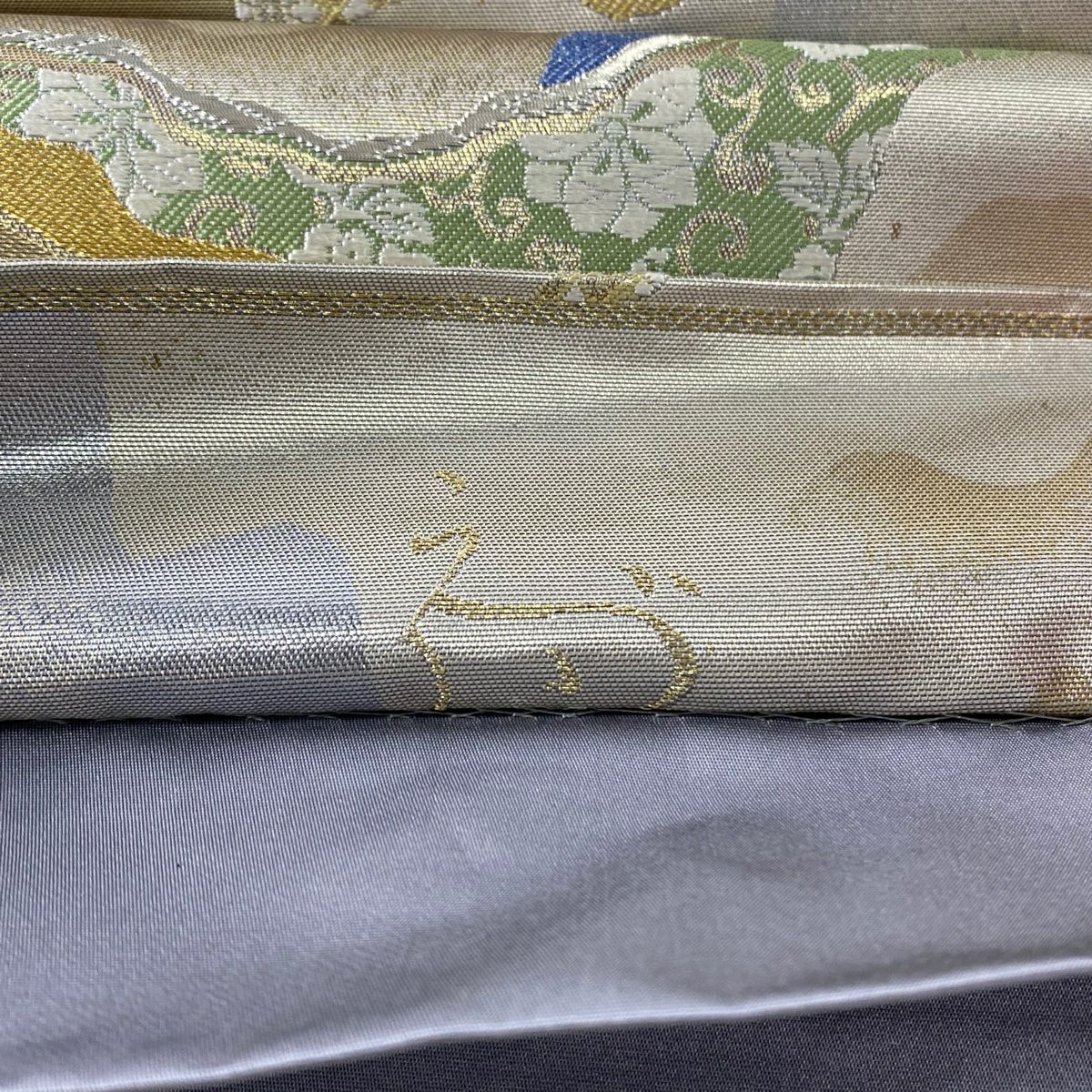 袋帯 秀品 関西仕立て 鳥 草花 金銀彩 箔 銀色 お太鼓柄 正絹