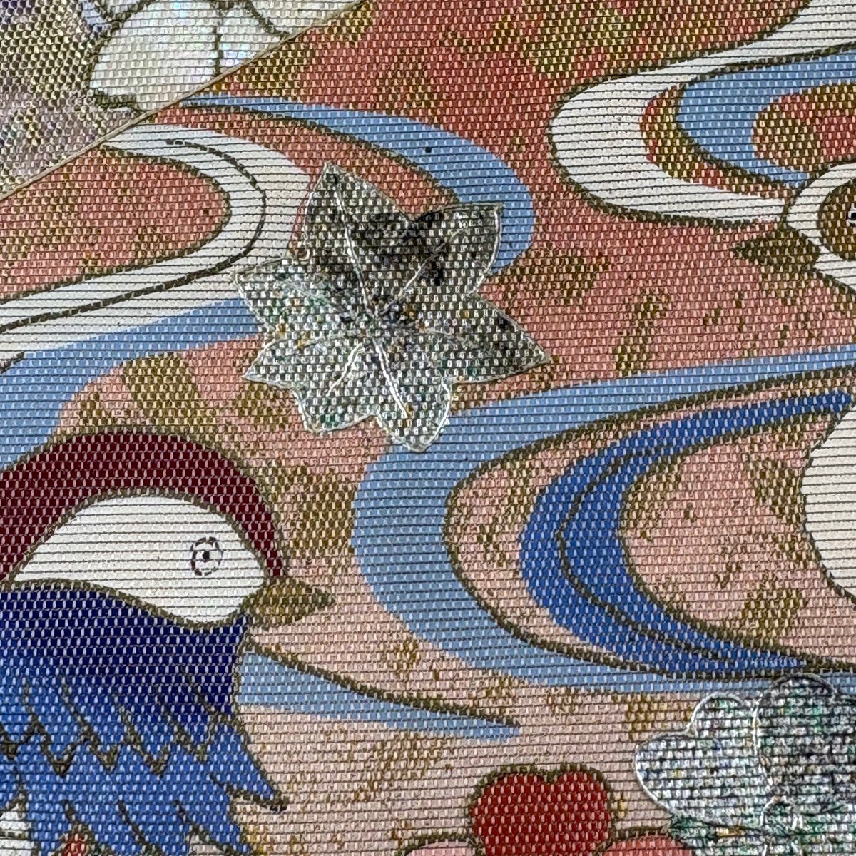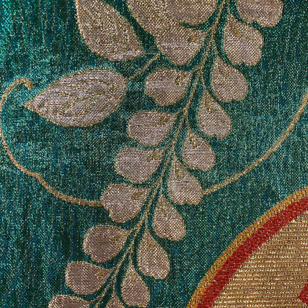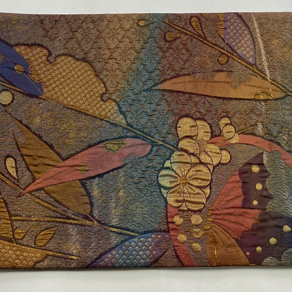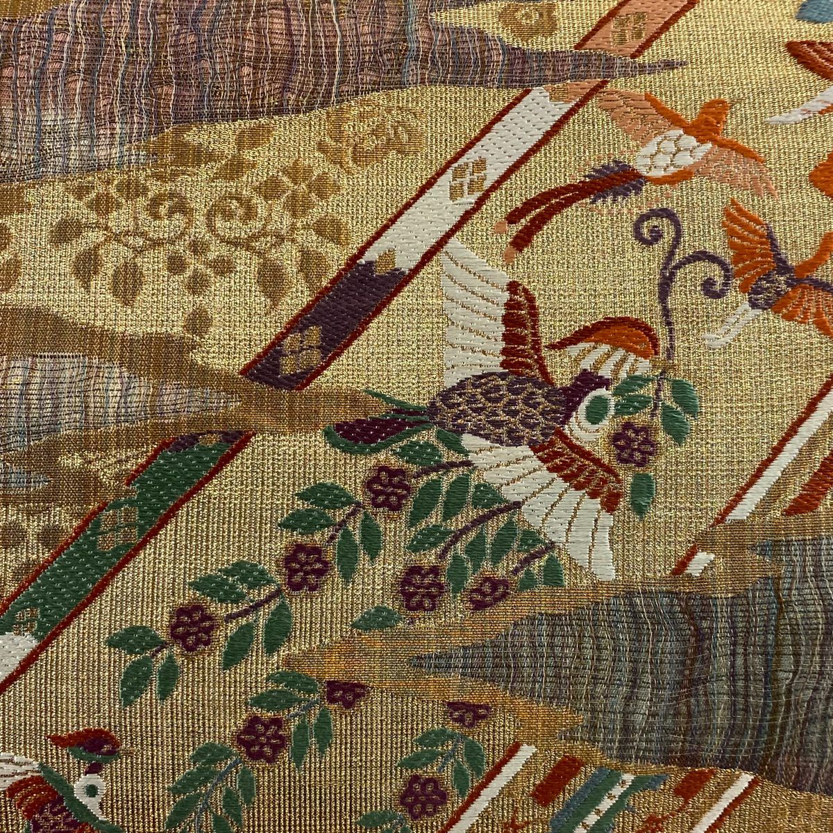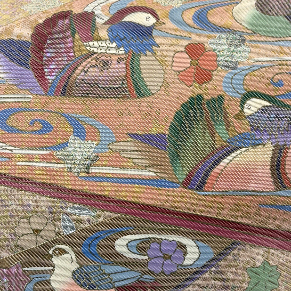 袋帯 秀品 関西仕立て 鳥 草花 金銀彩 箔 銀色 お太鼓柄 正絹