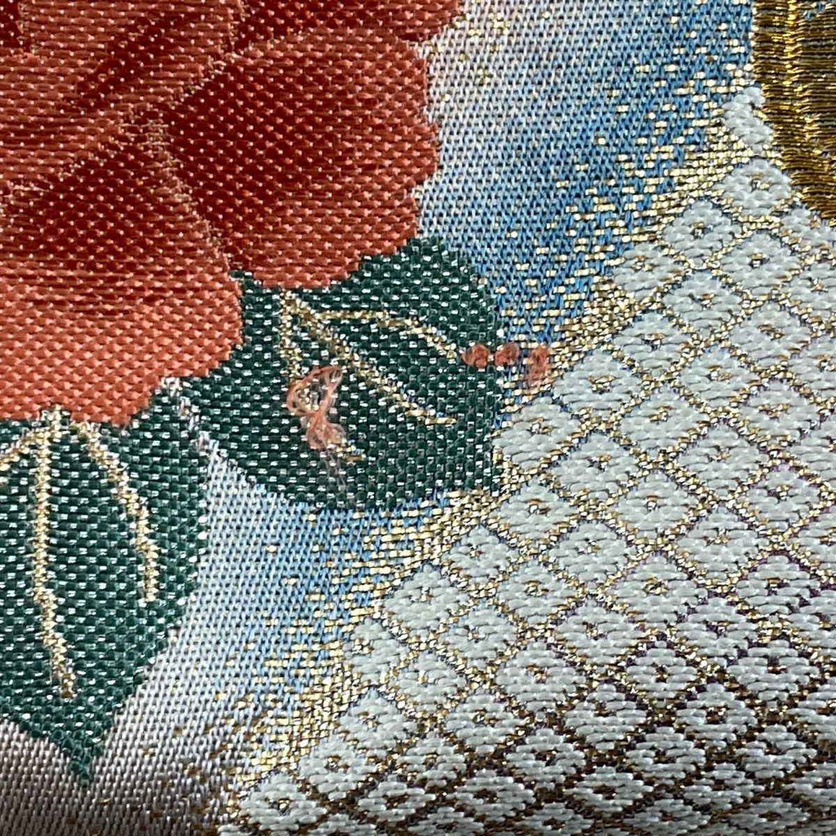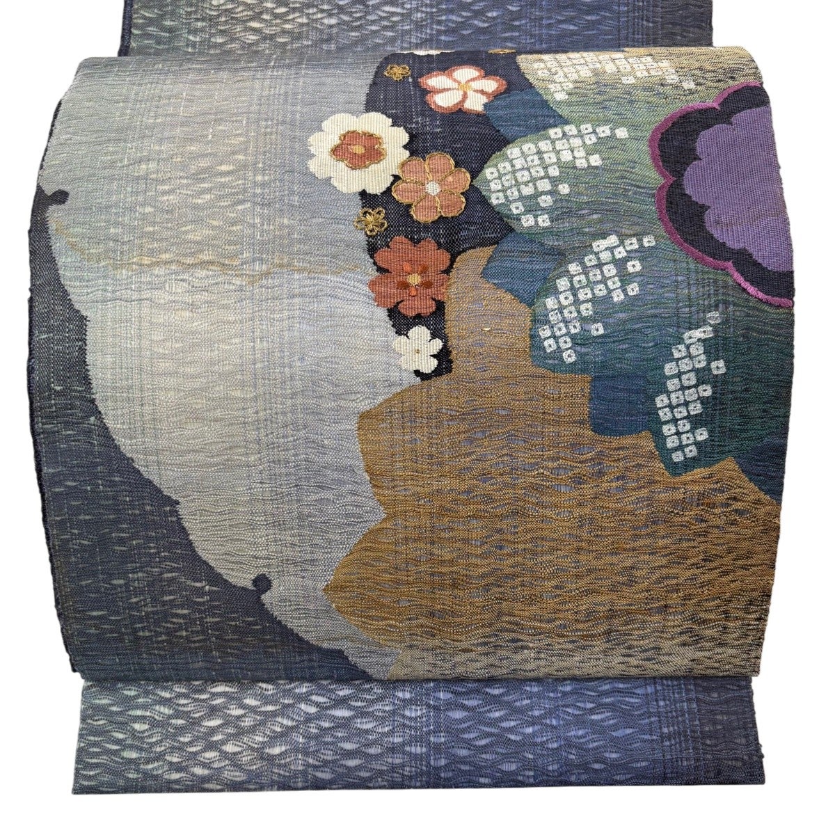 【美品】 袋帯 秀品 花 雪輪 金糸 刺繍 青灰色 お太鼓柄 正絹