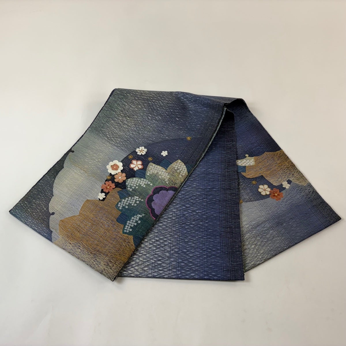 【在庫一掃】 袋帯 秀品 雪輪 草花 金糸 箔 藍色 六通 正絹