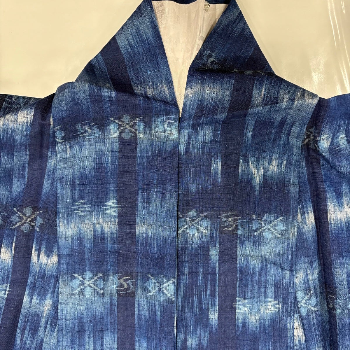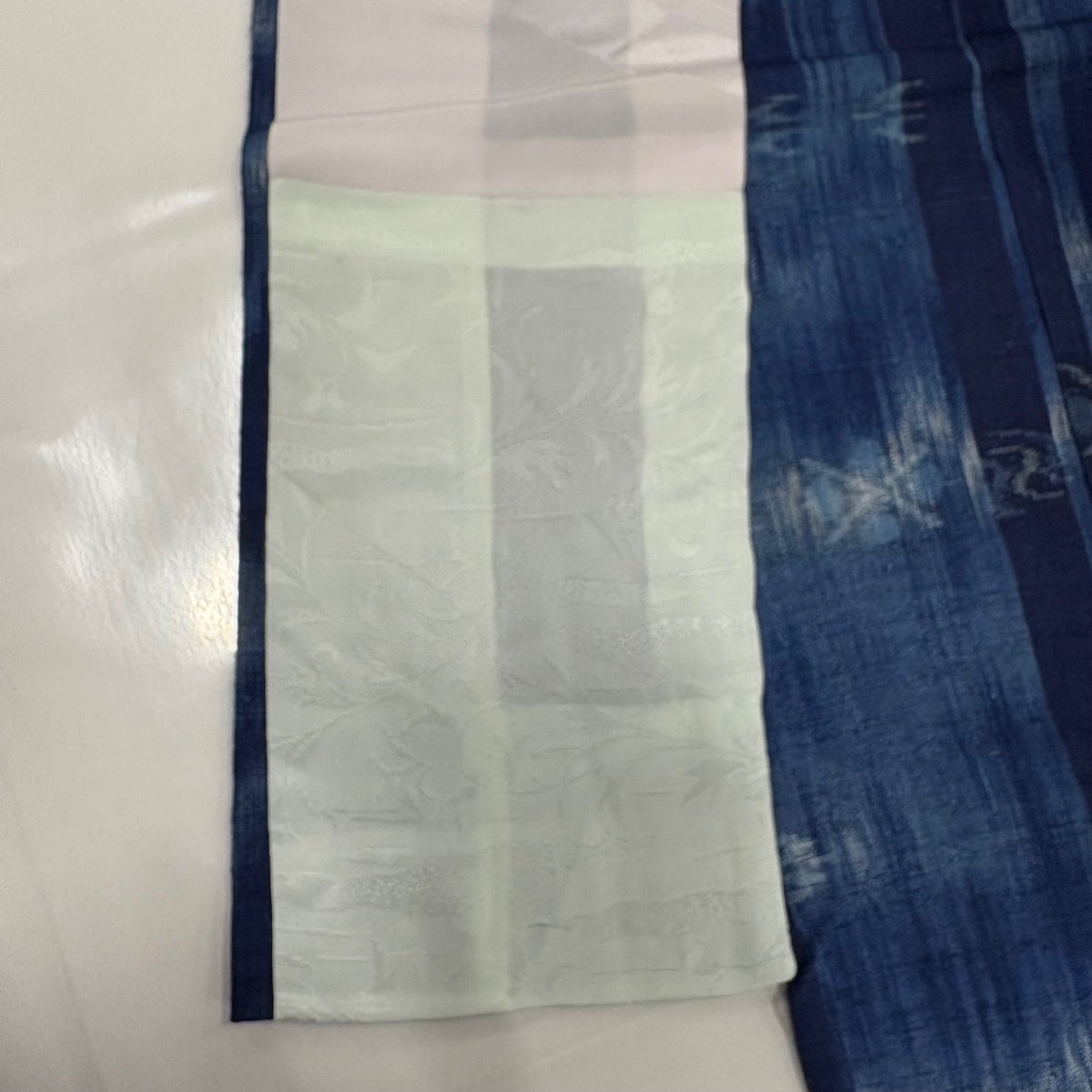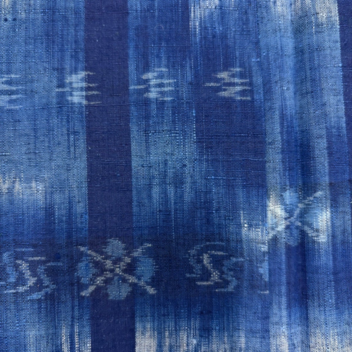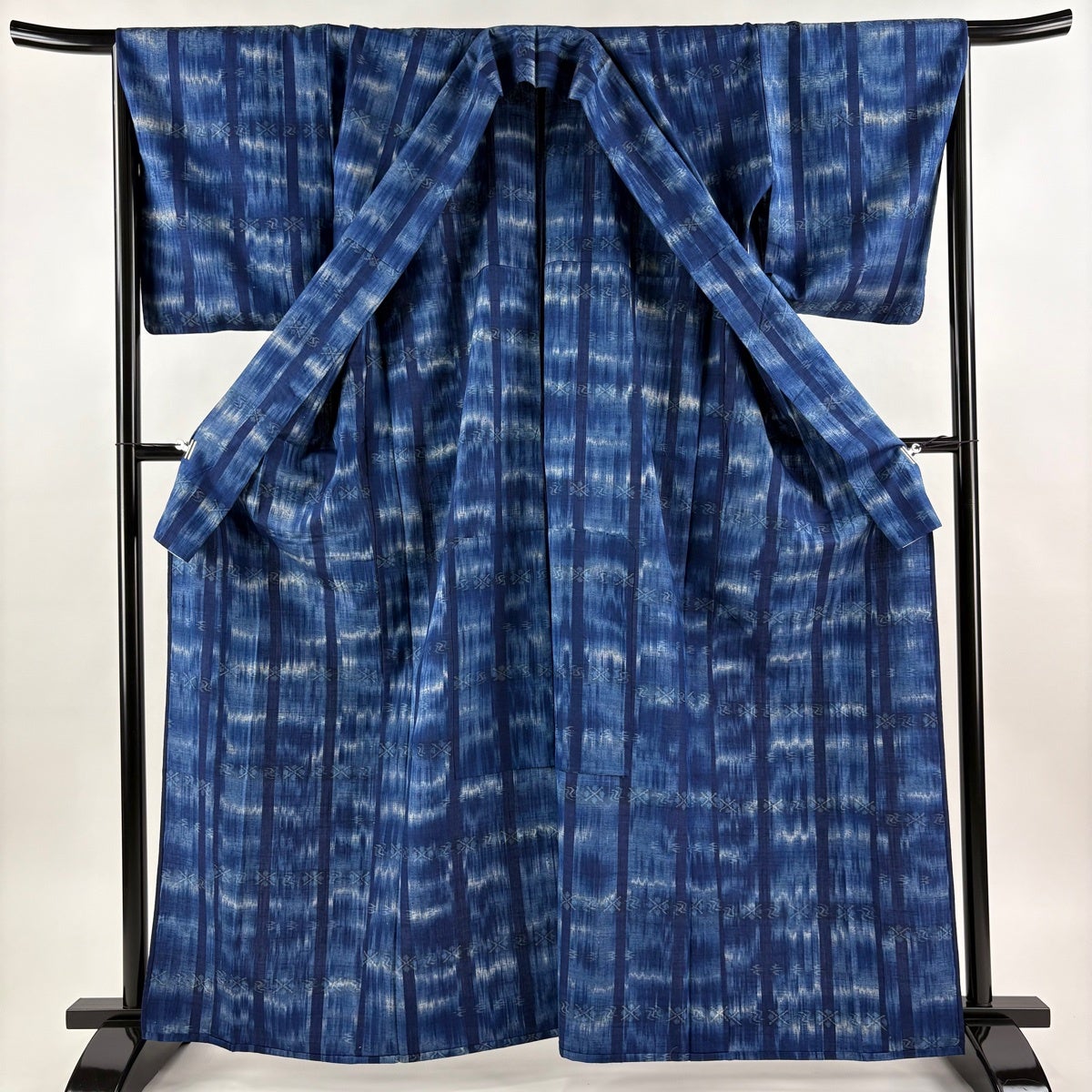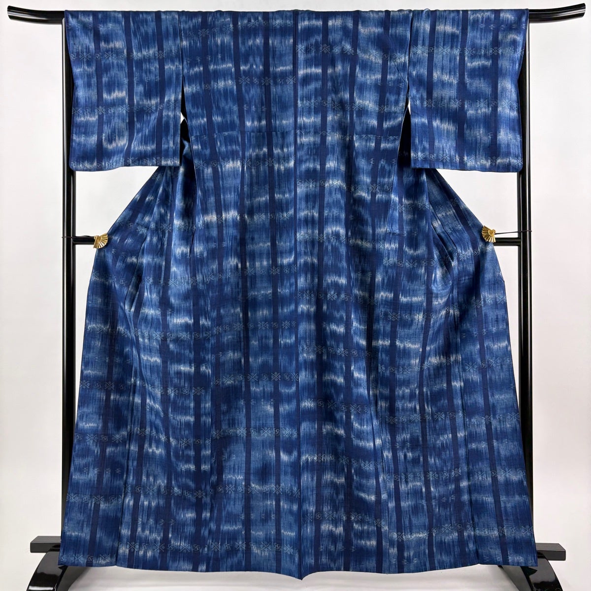 紬 身丈164cm 裄丈66cm M 単衣 燕 縞 藍色 正絹 秀品