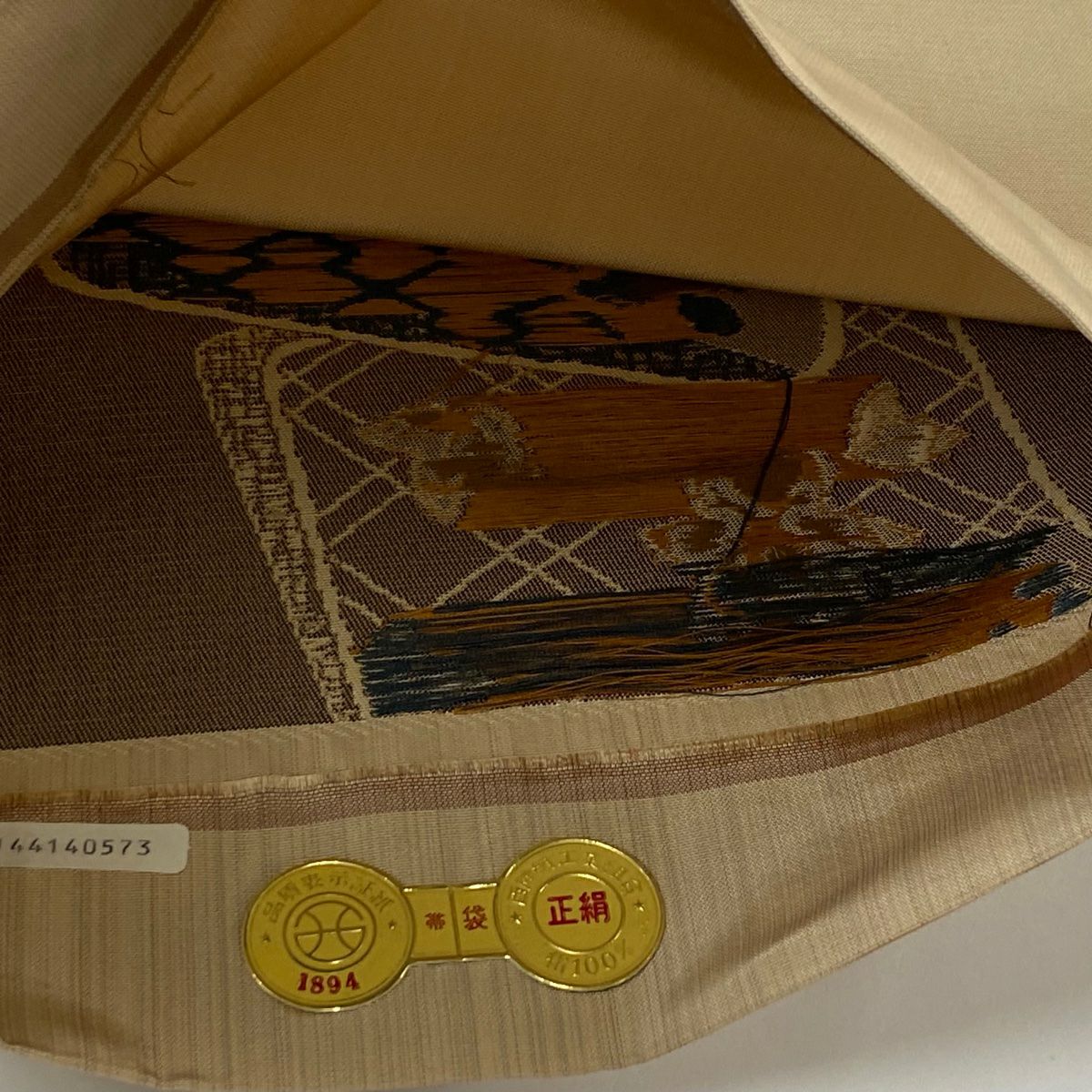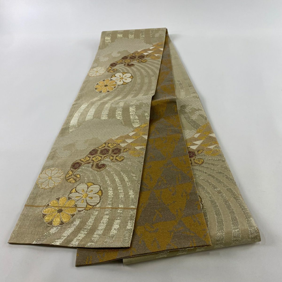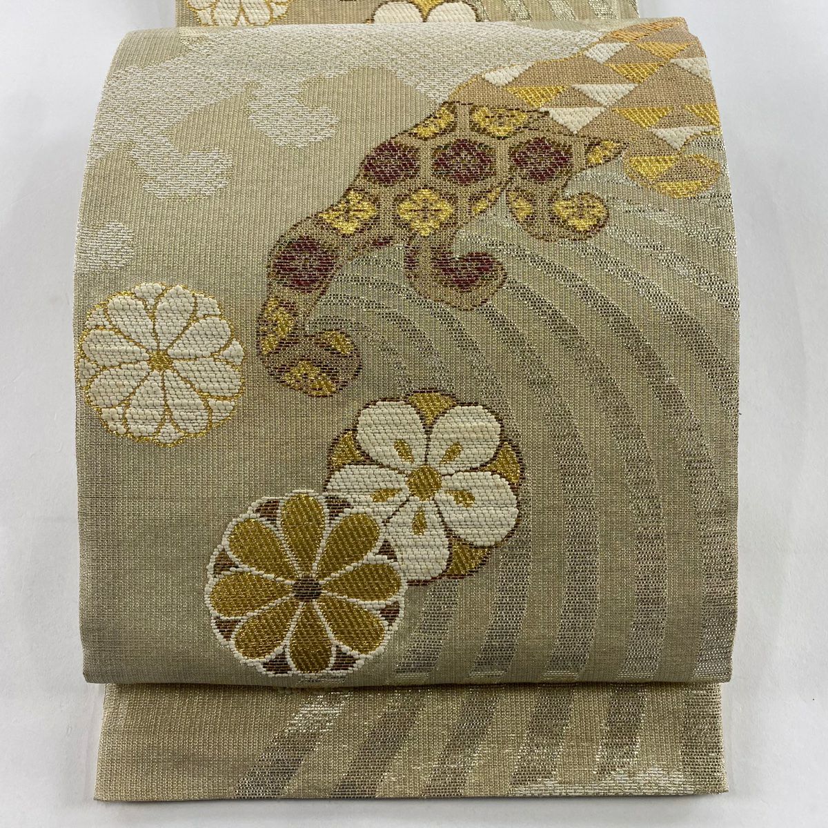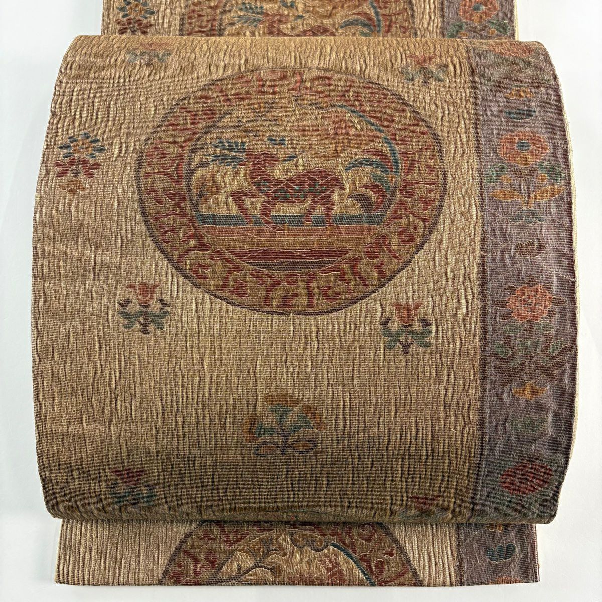 【美品】 袋帯 秀品 華文 唐草 唐織 箔 ベージュ 六通 正絹