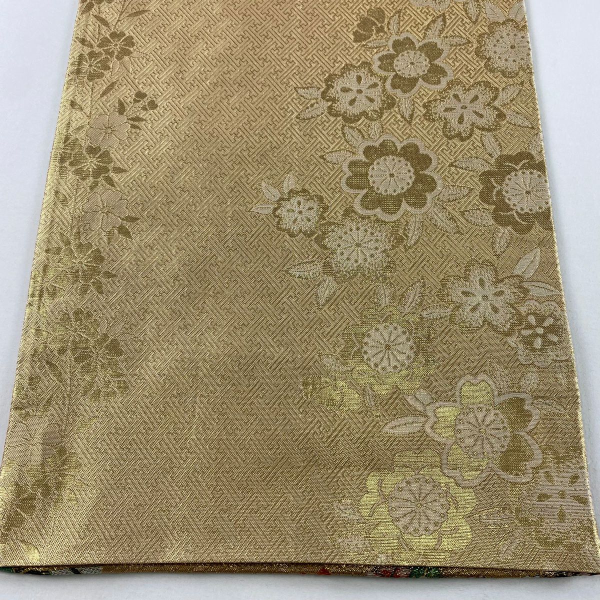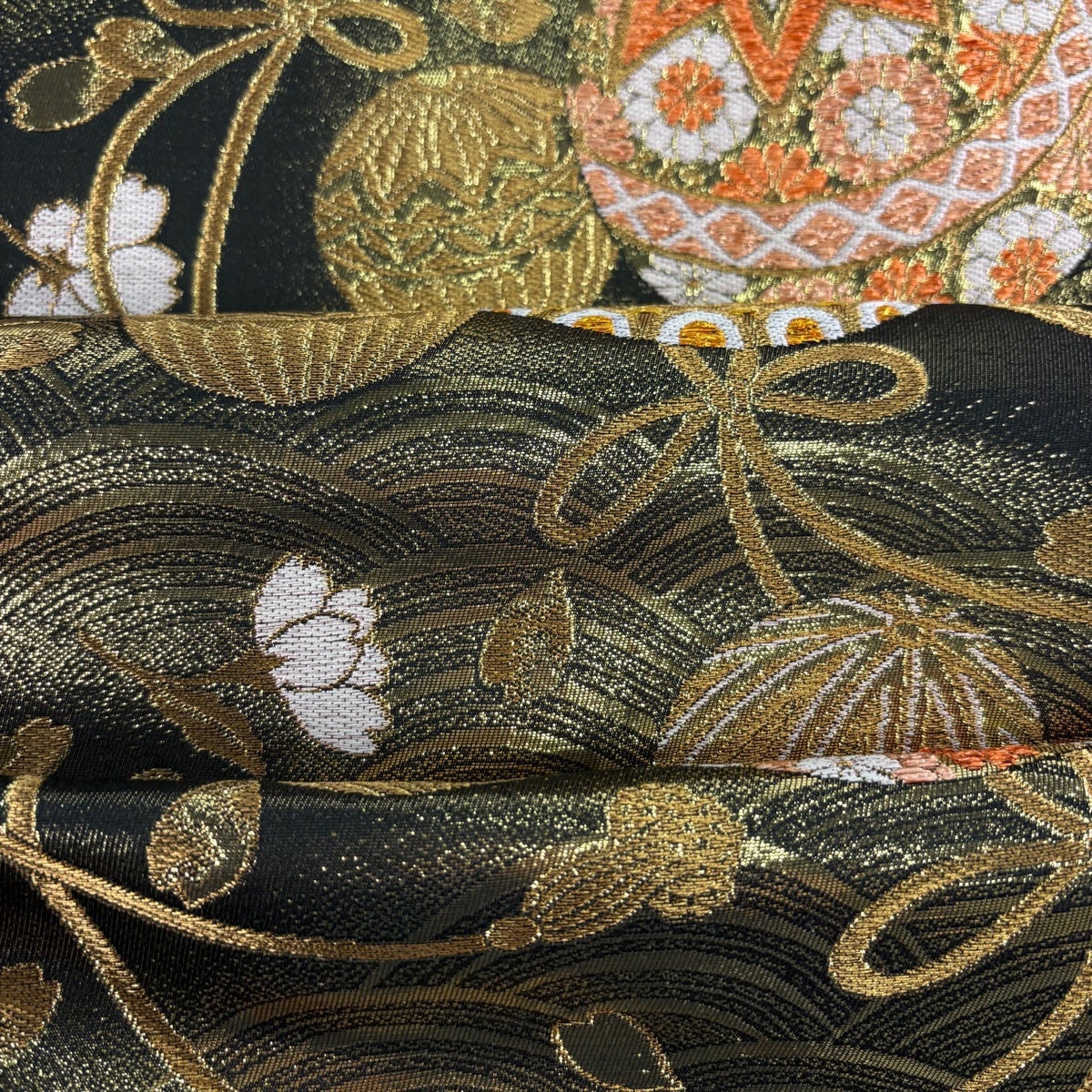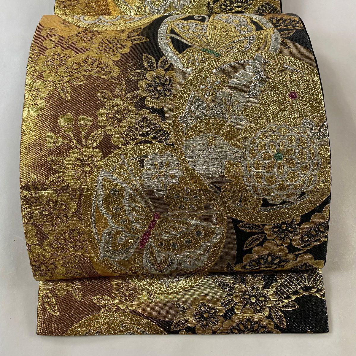 【美品】 袋帯 秀品 振袖向き 薬玉 桜 箔 金糸 金色 全通 正絹