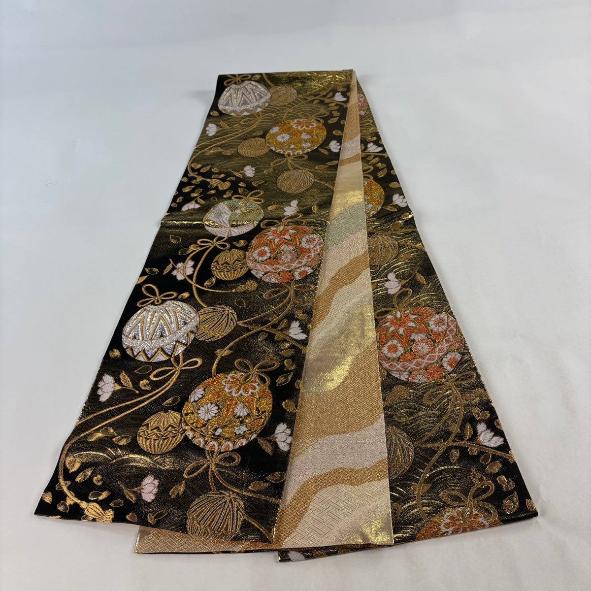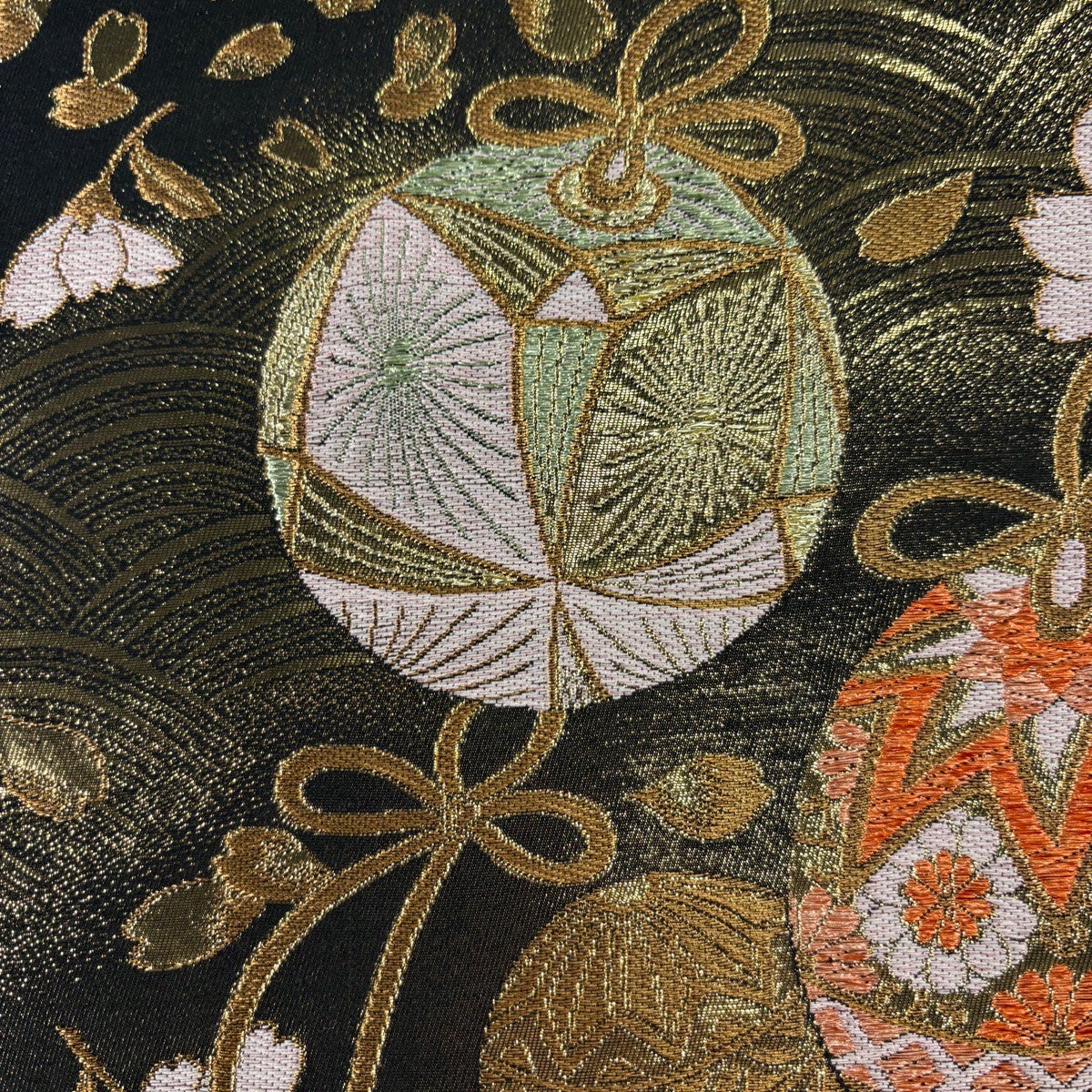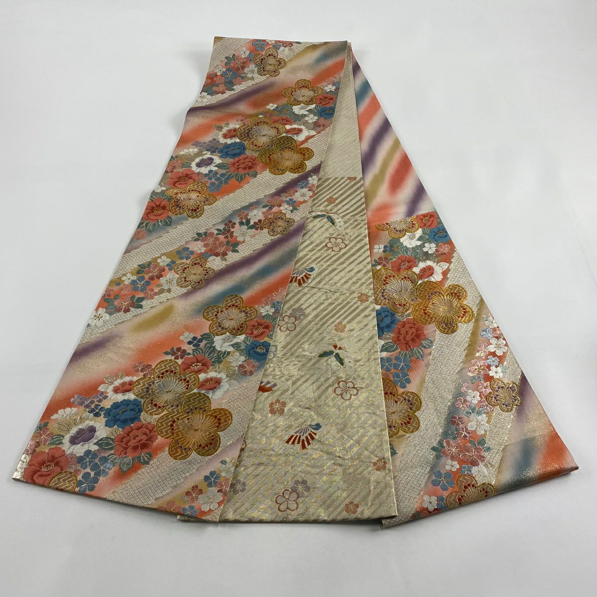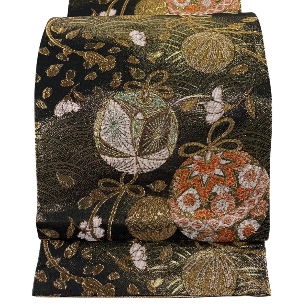 【美品】 袋帯 秀品 振袖向き 薬玉 桜 箔 金糸 金色 全通 正絹