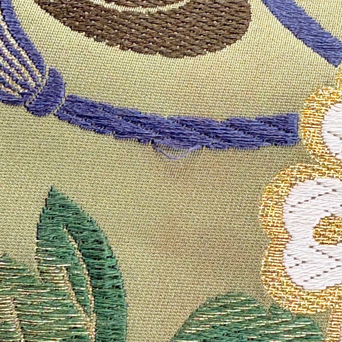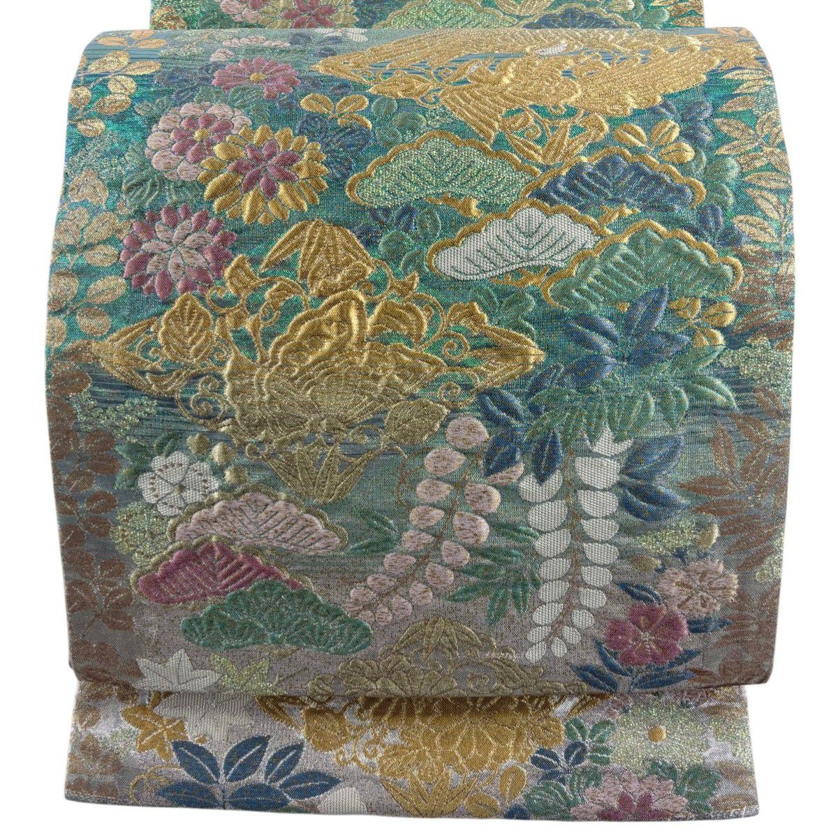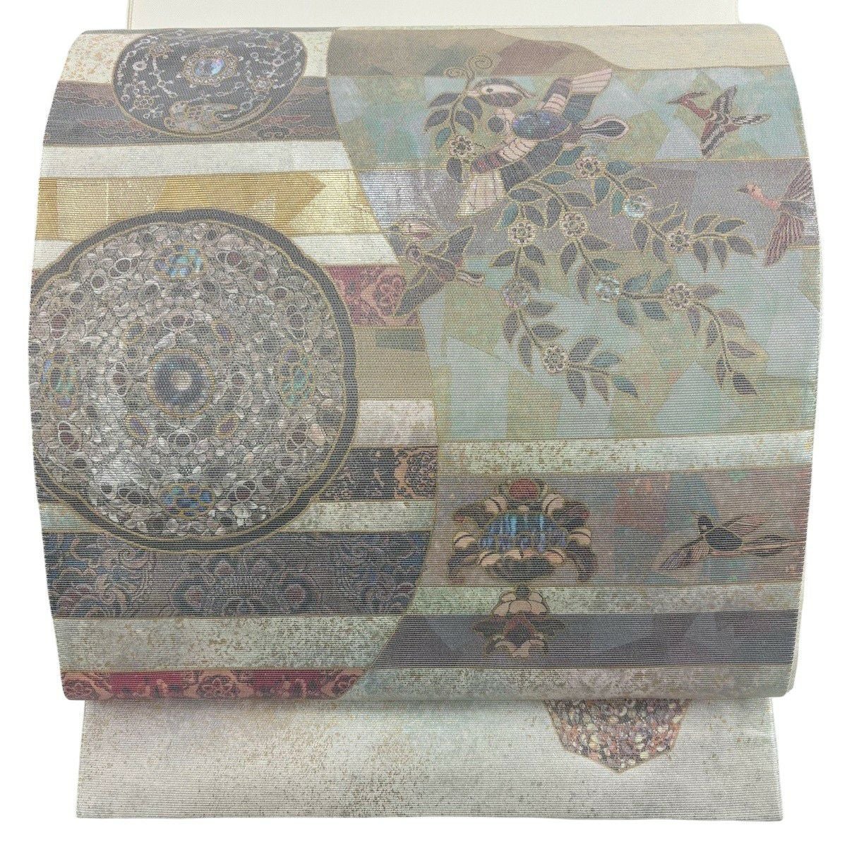 【美品】 袋帯 秀品 華文 花喰い鳥 螺鈿箔 薄緑 お太鼓柄 正絹