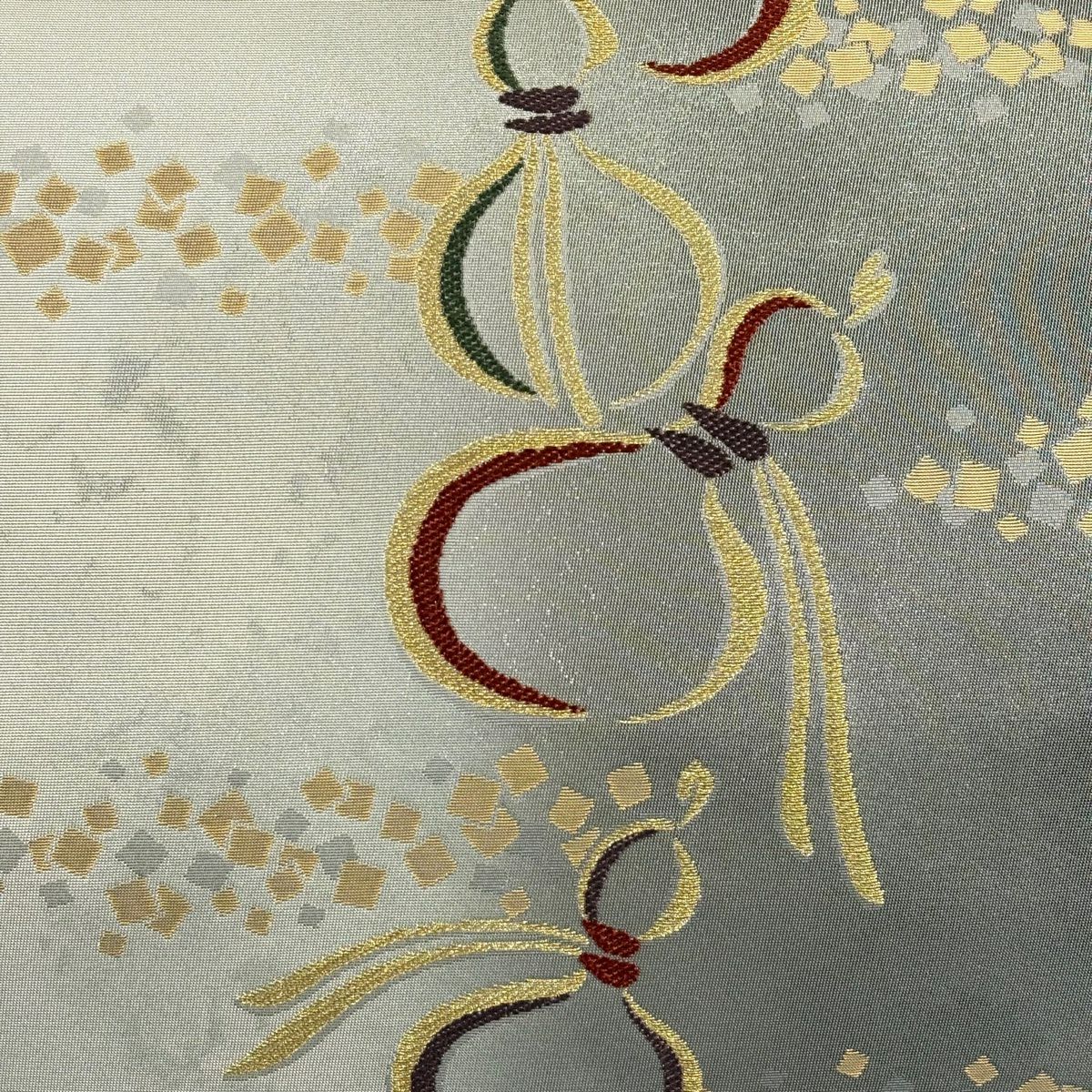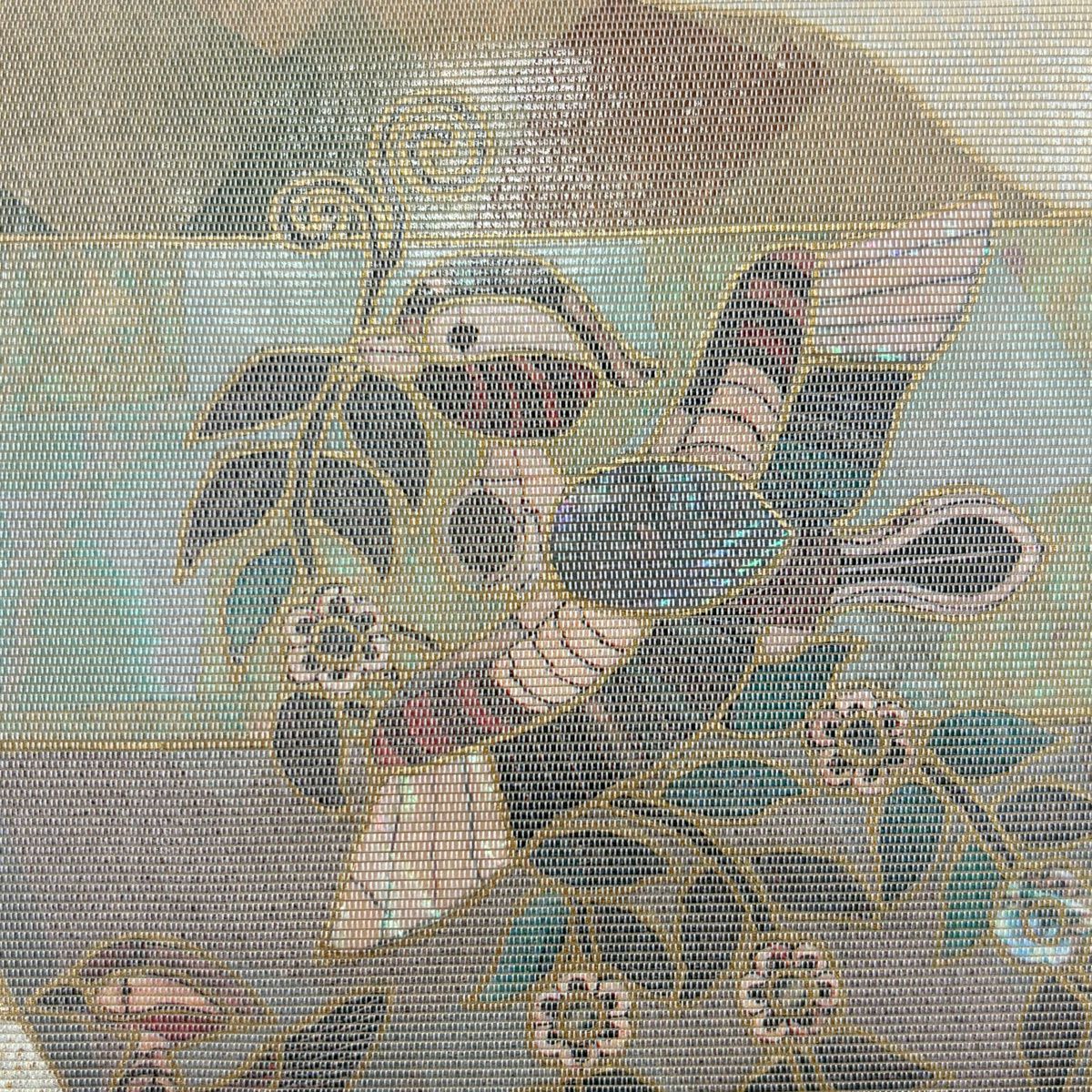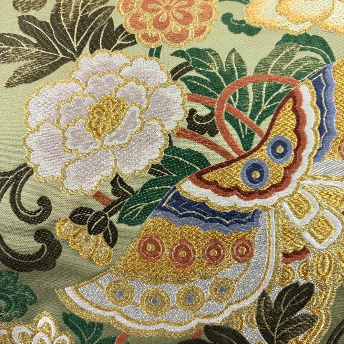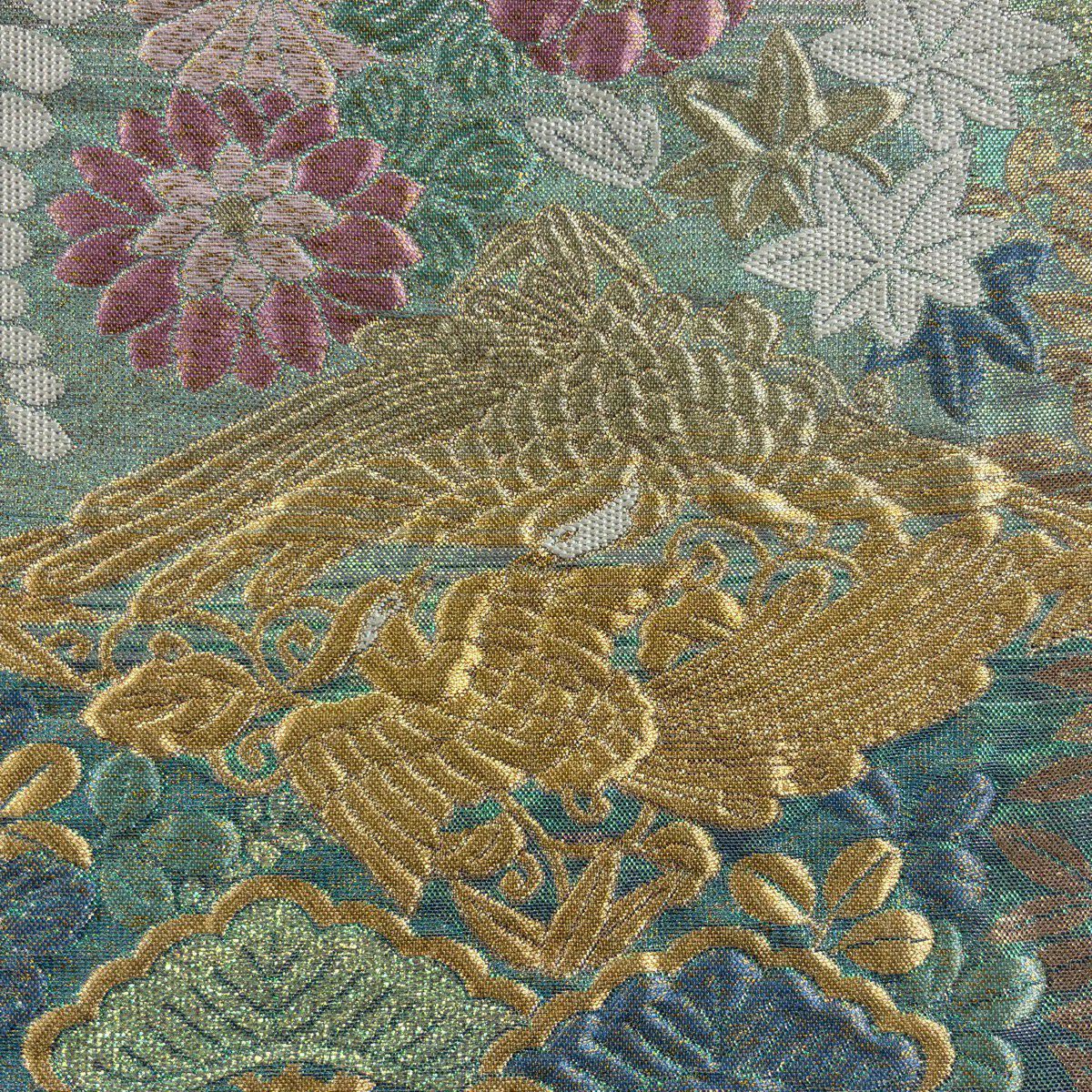 【美品】 袋帯 秀品 華文 花喰い鳥 螺鈿箔 薄緑 お太鼓柄 正絹