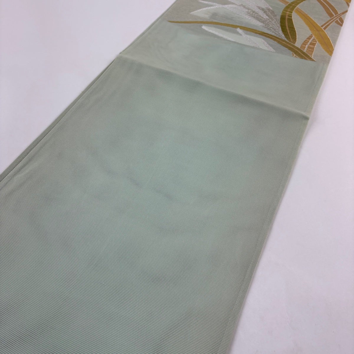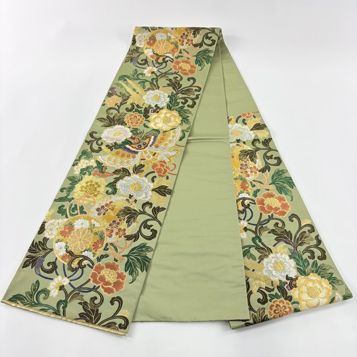 【美品】 袋帯 秀品 向かい鳥 草花 箔 金銀糸 薄緑 六通 正絹
