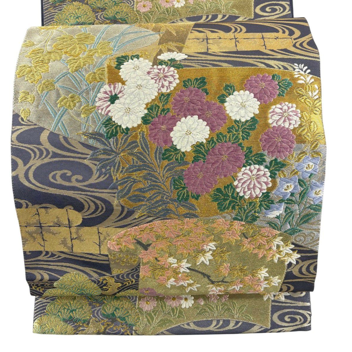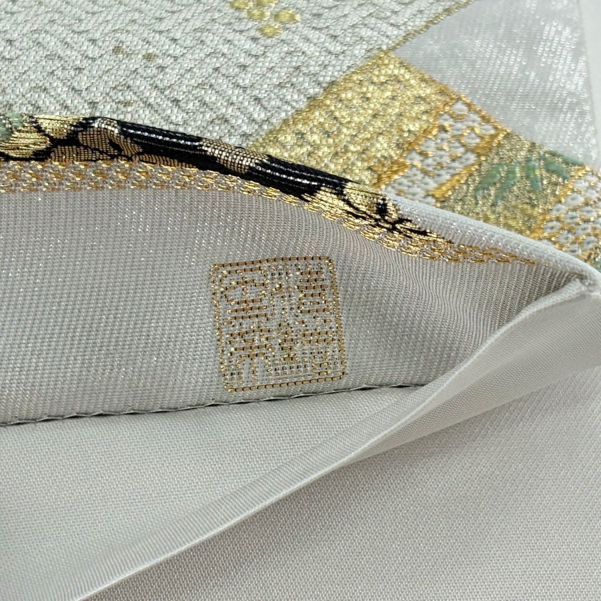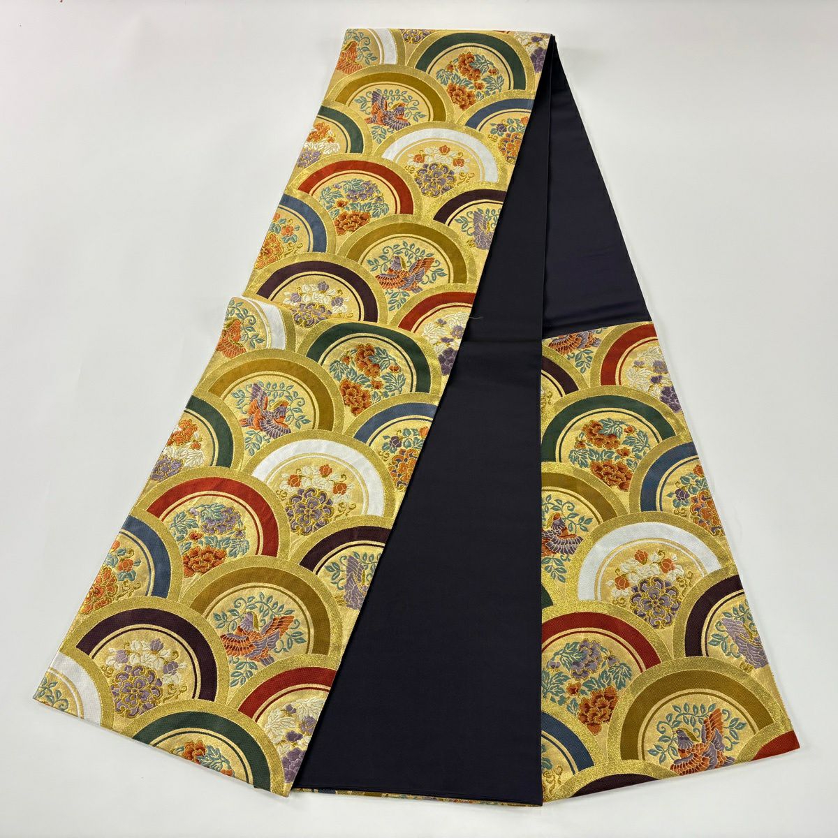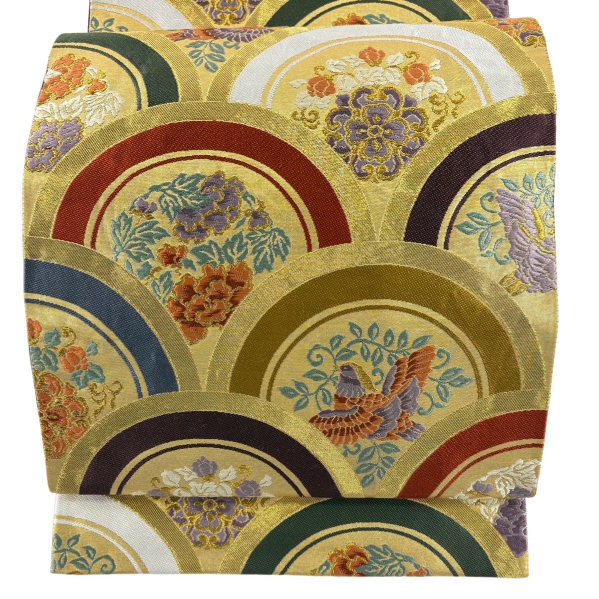 【美品】 袋帯 秀品 有職青海波文 花鳥 金糸 箔 金色 六通 正絹