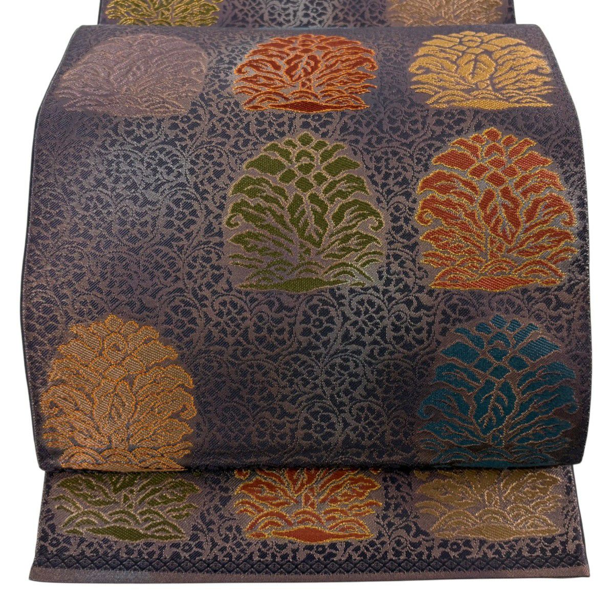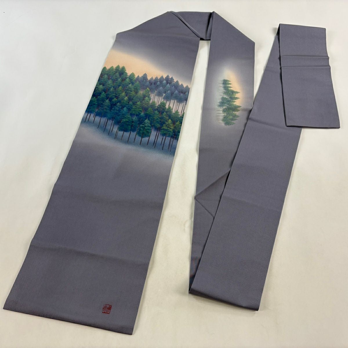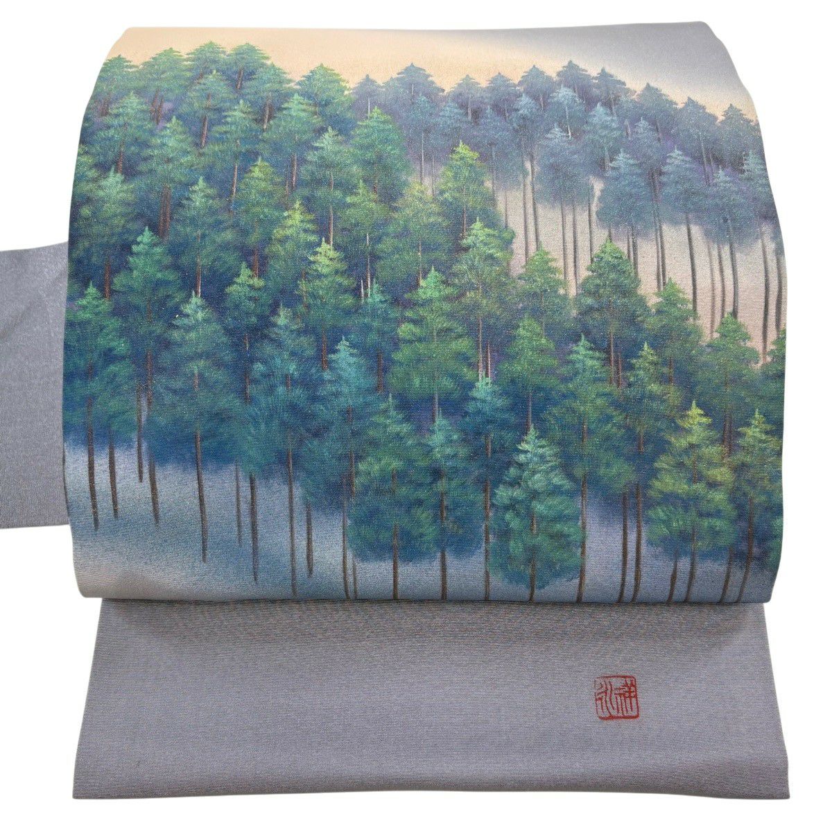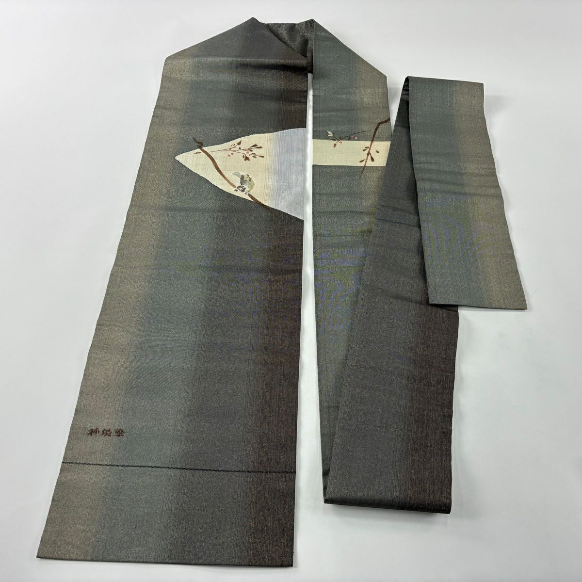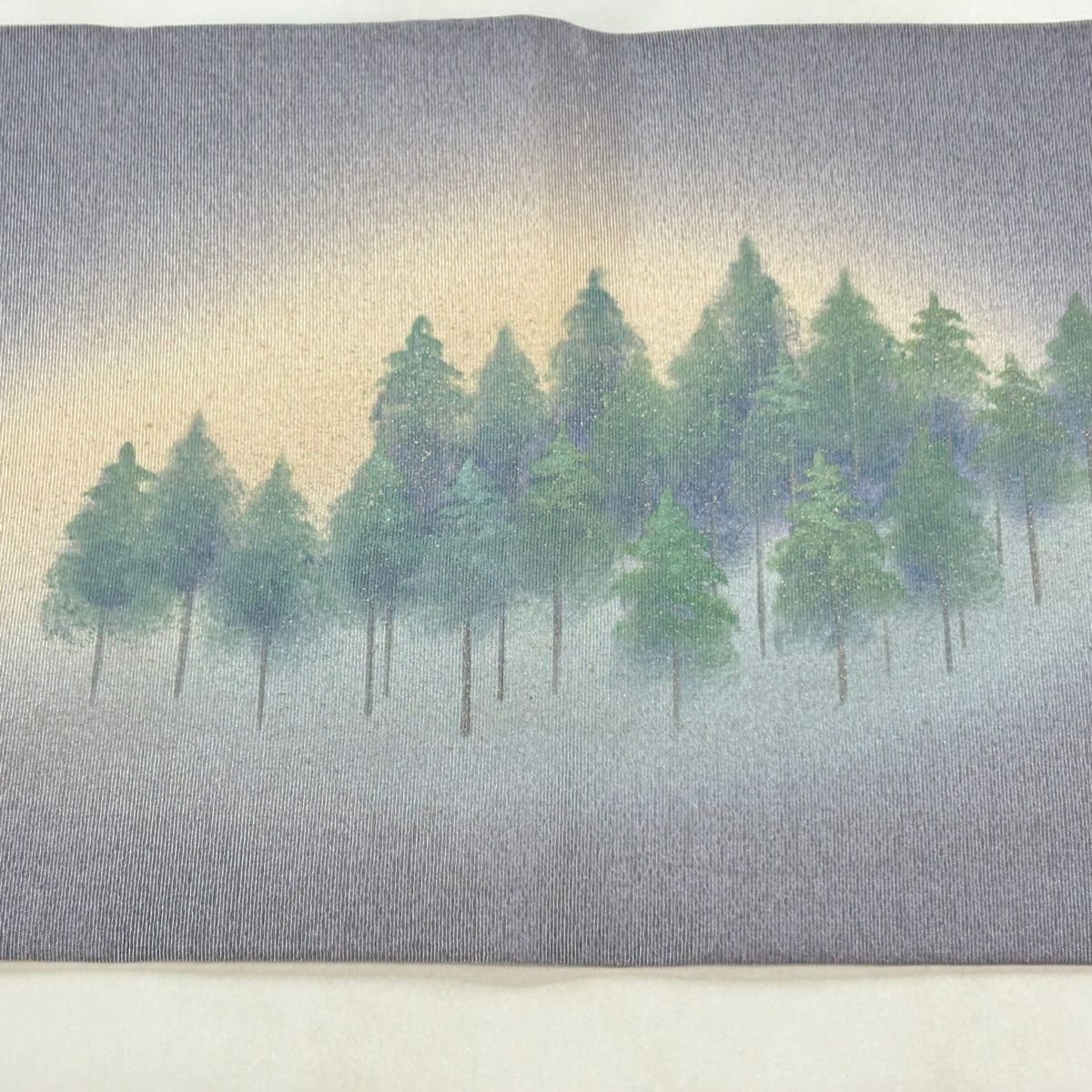 【美品】 名古屋帯 秀品 落款あり 樹木 金彩 ぼかし 灰紫 正絹