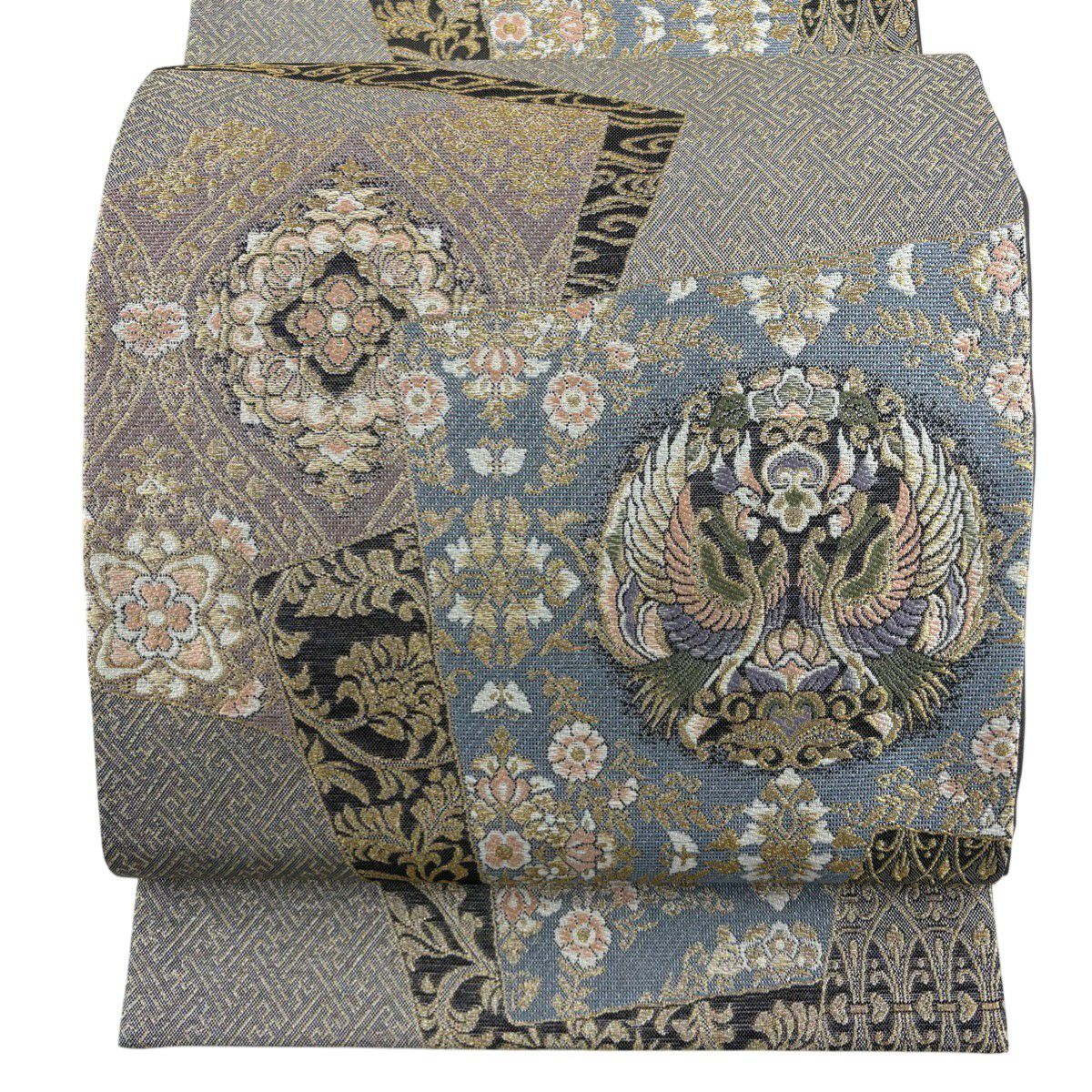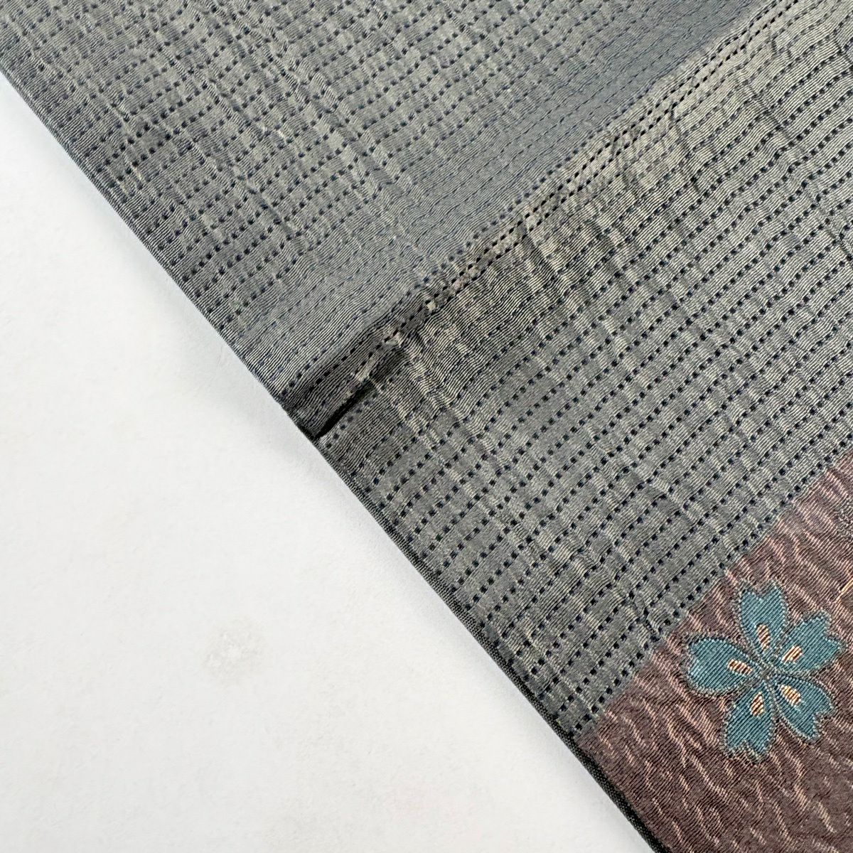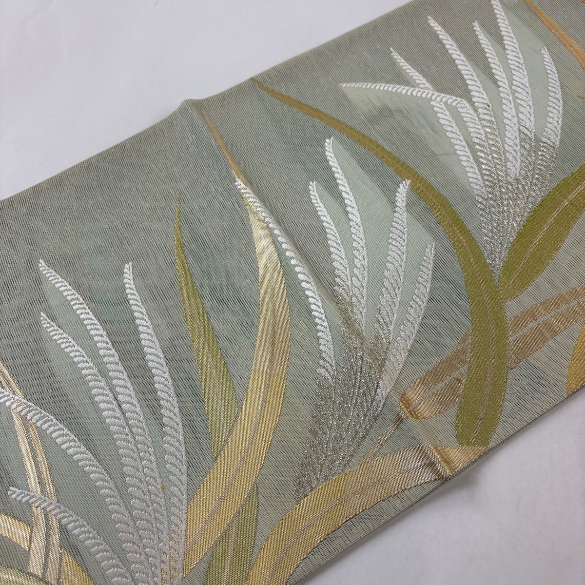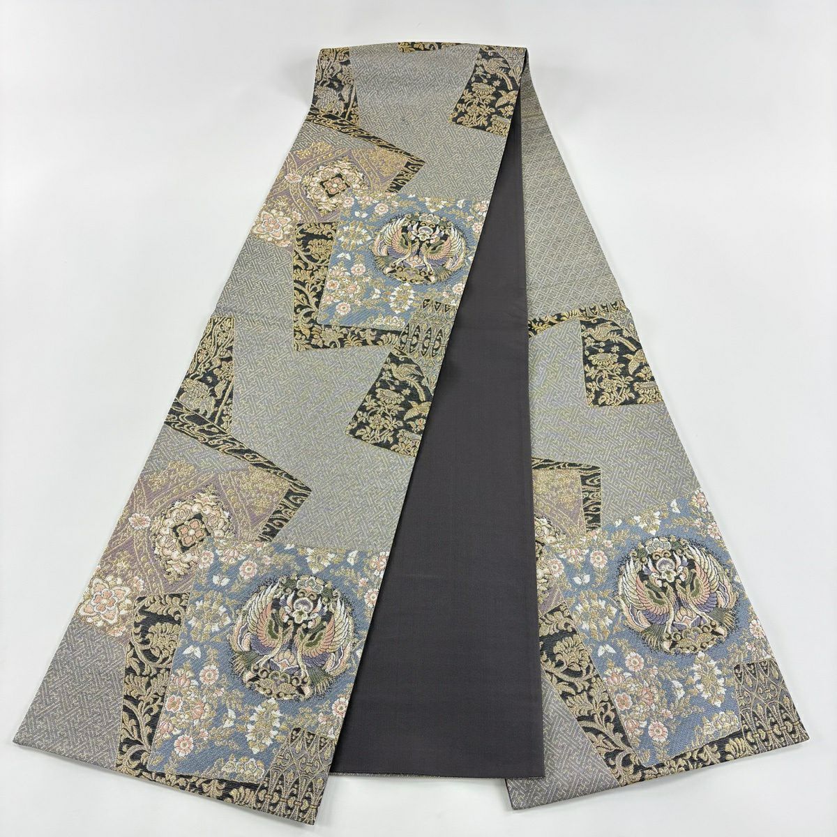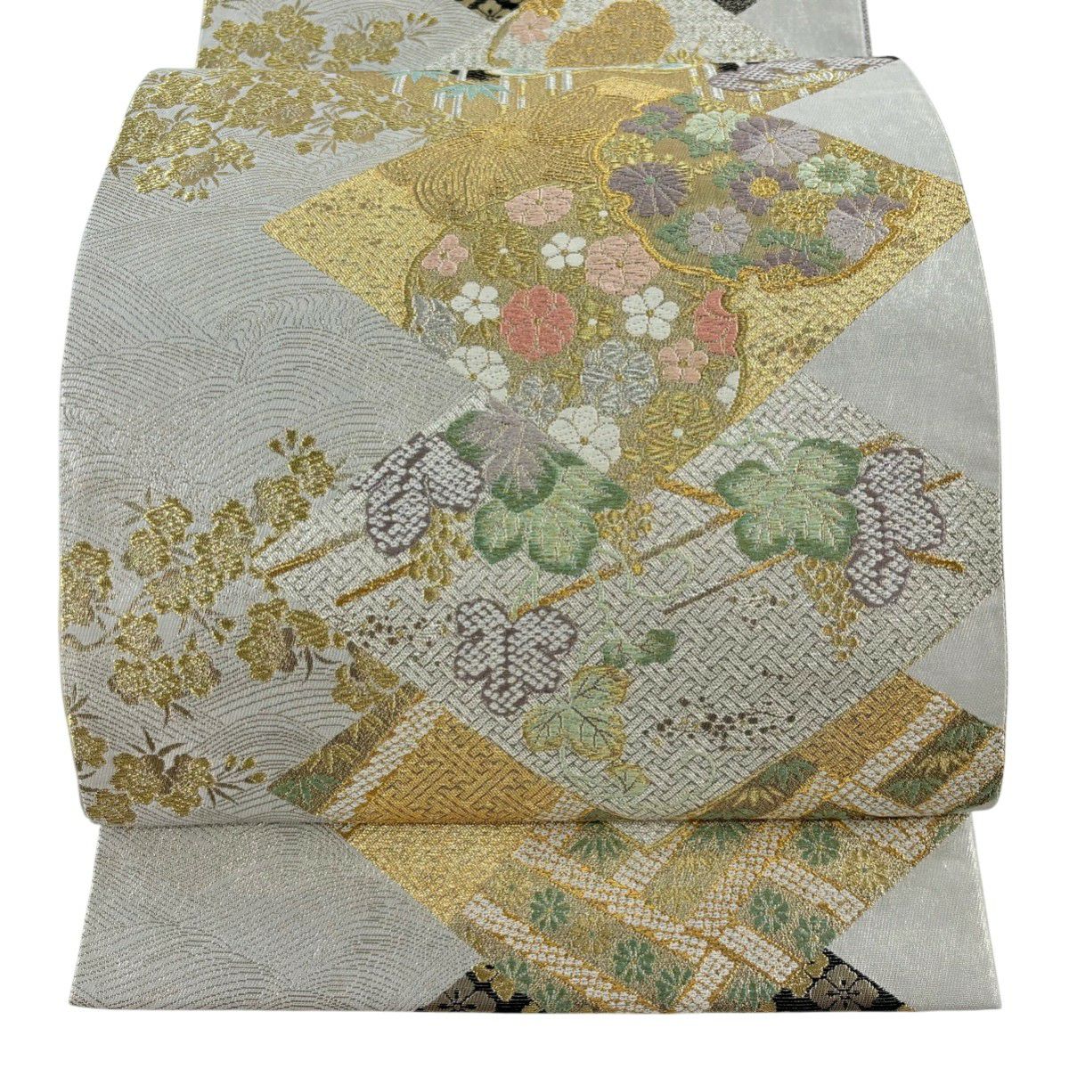 【美品】 袋帯 秀品 草春花 草花 菱 金銀糸 箔 灰色 六通 正絹