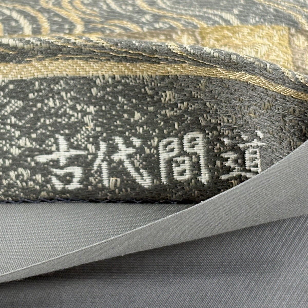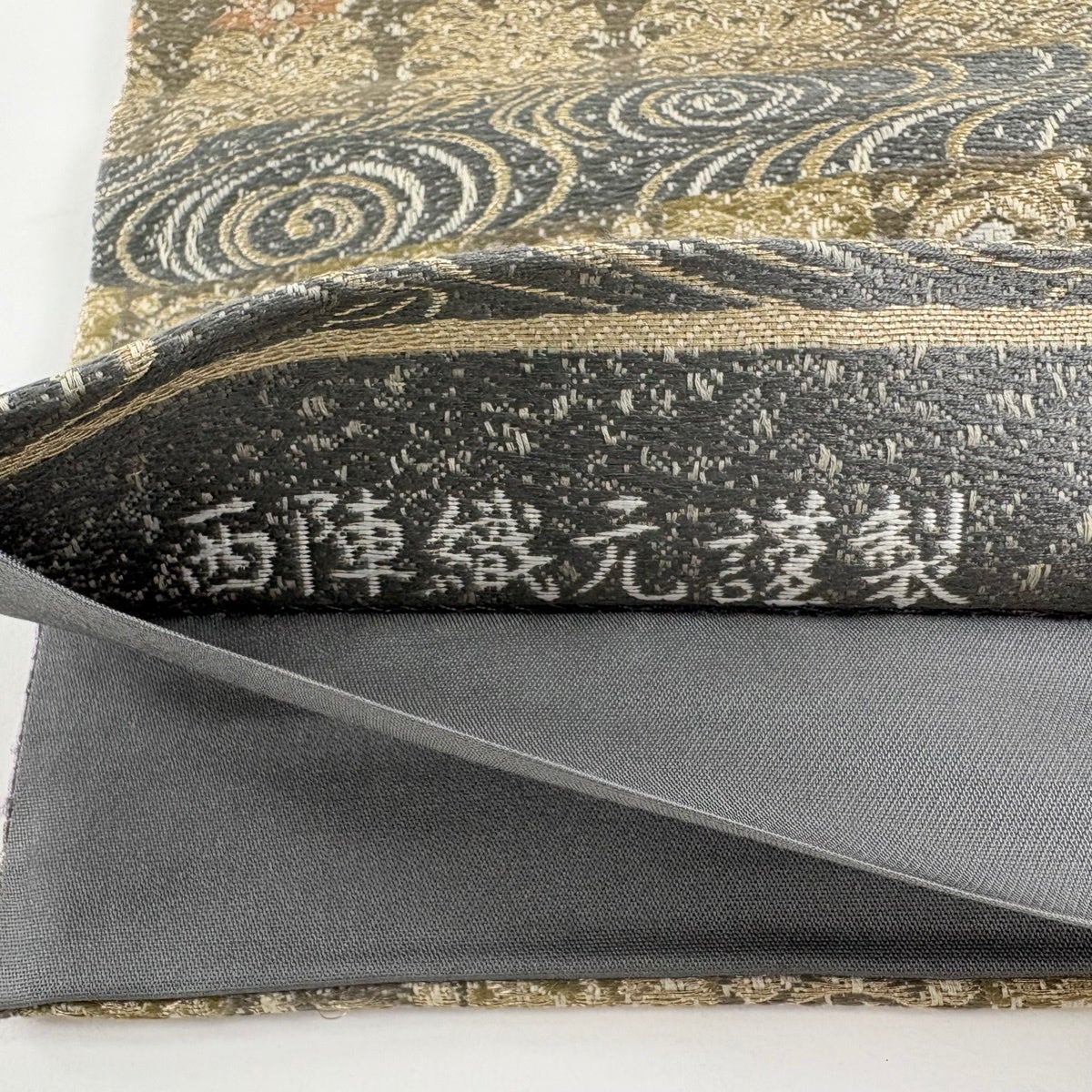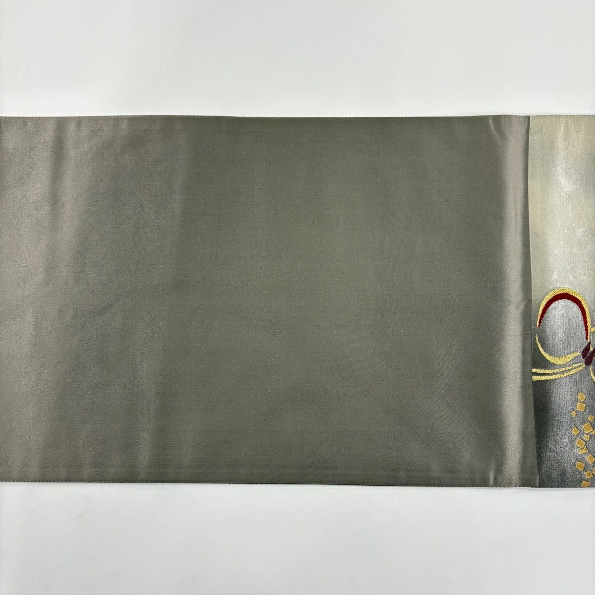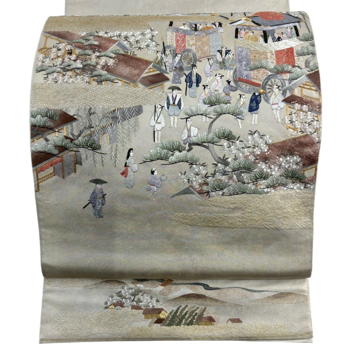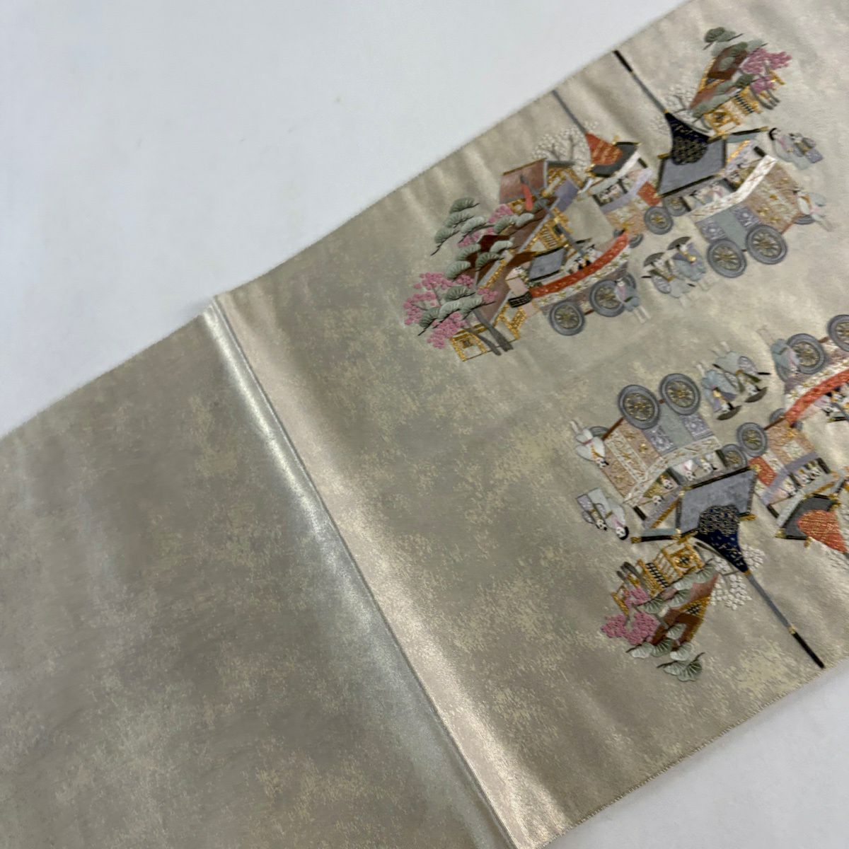 【美品】 袋帯 秀品 山鉾 人物 金糸 刺繍 灰茶 お太鼓柄 正絹