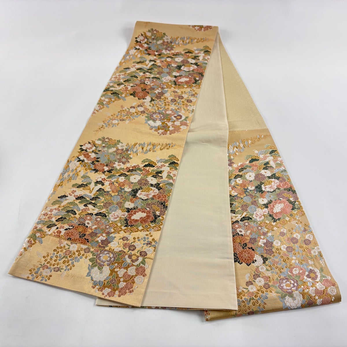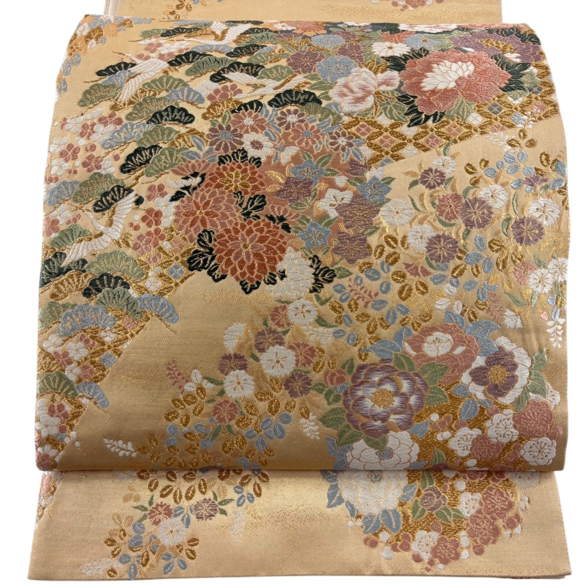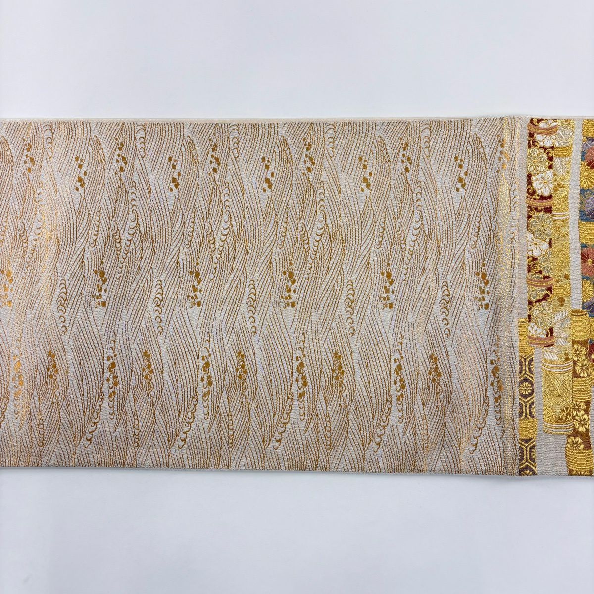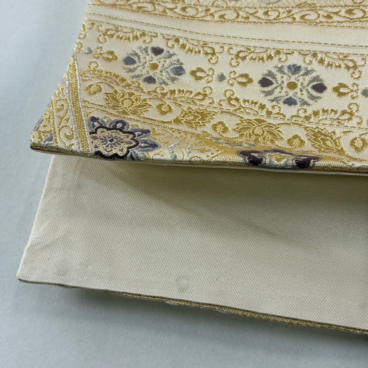 【美品】 袋帯 秀品 笛 草花 金糸 箔 ベージュ 六通 正絹