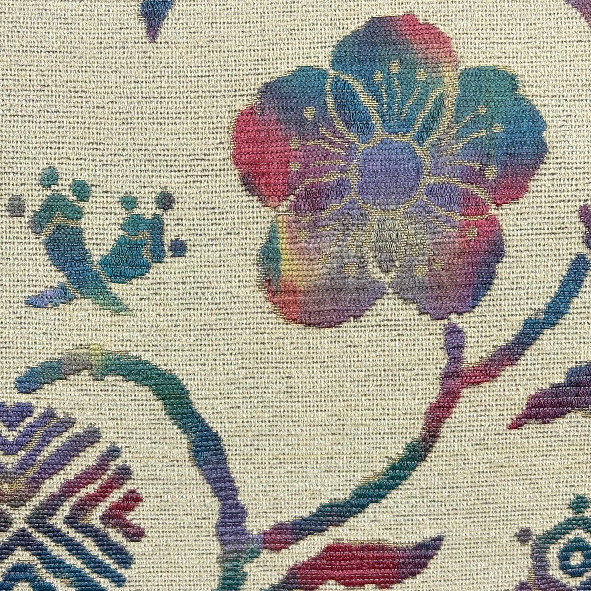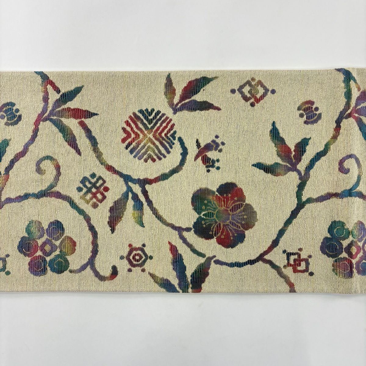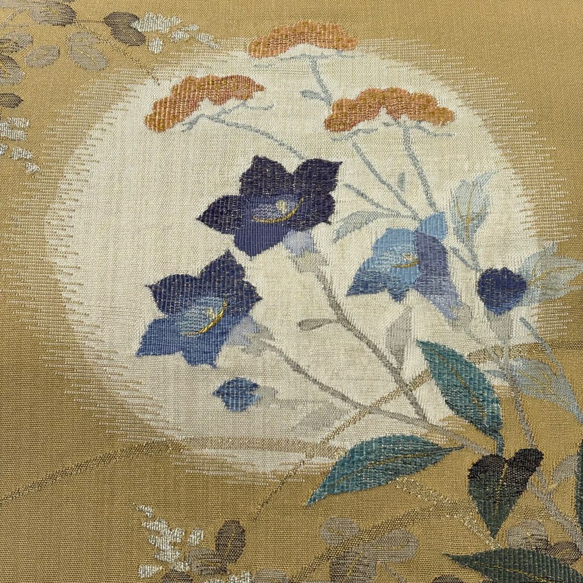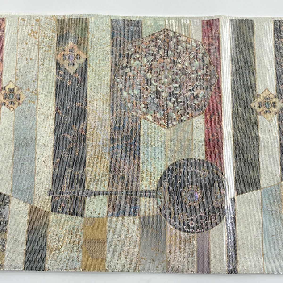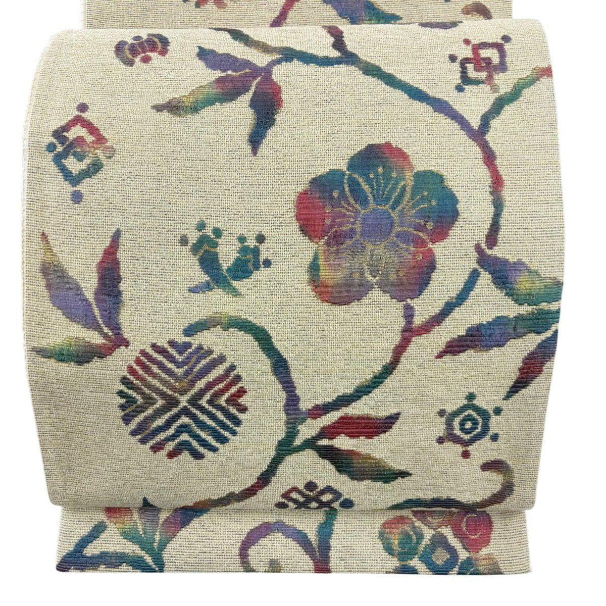 【美品】 袋帯 秀品 笛 草花 金糸 箔 ベージュ 六通 正絹