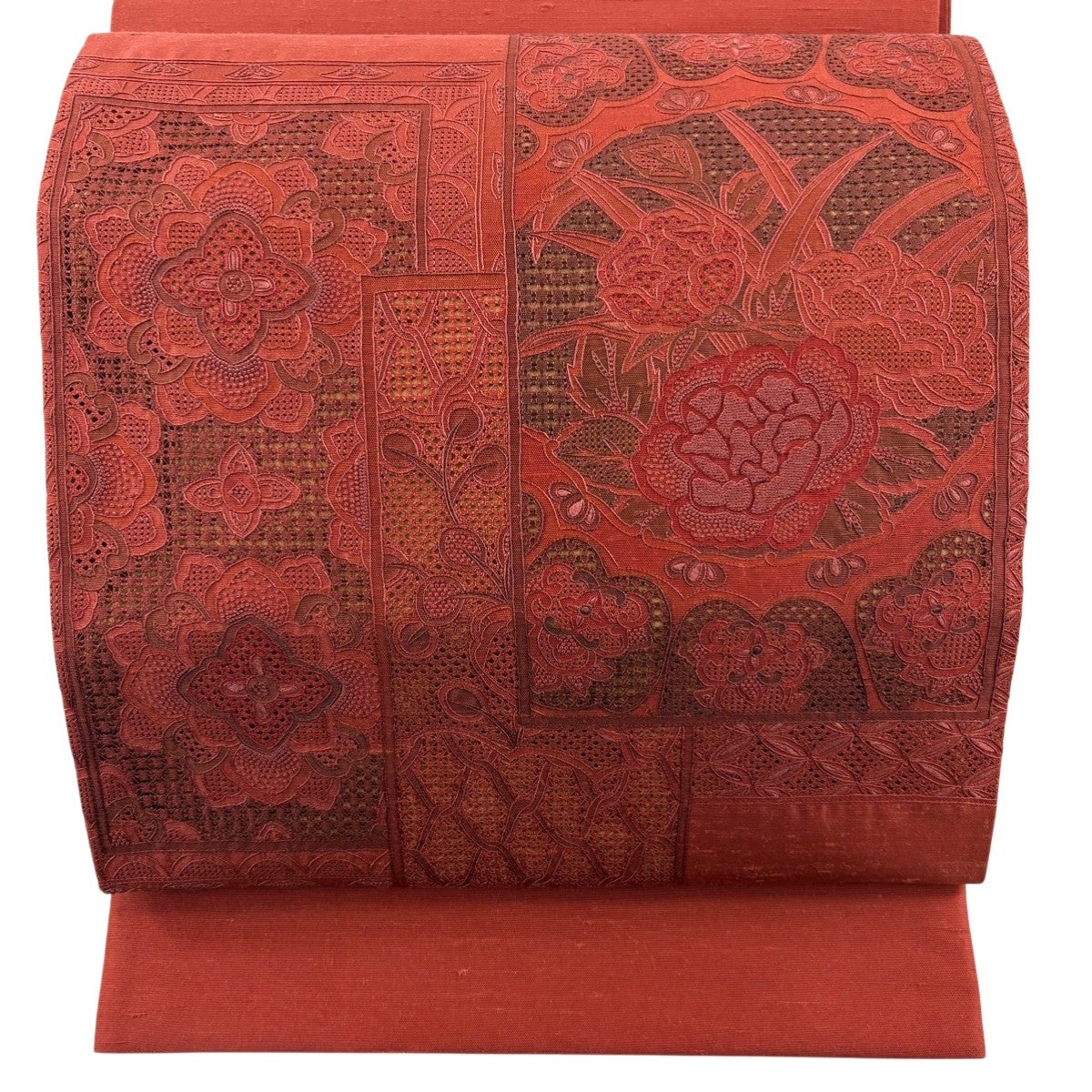 【美品】 袋帯 秀品 扇面 花 銀糸 絞り 小豆色 お太鼓柄 正絹