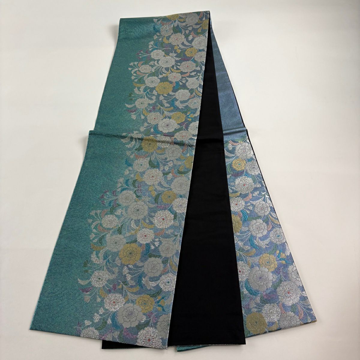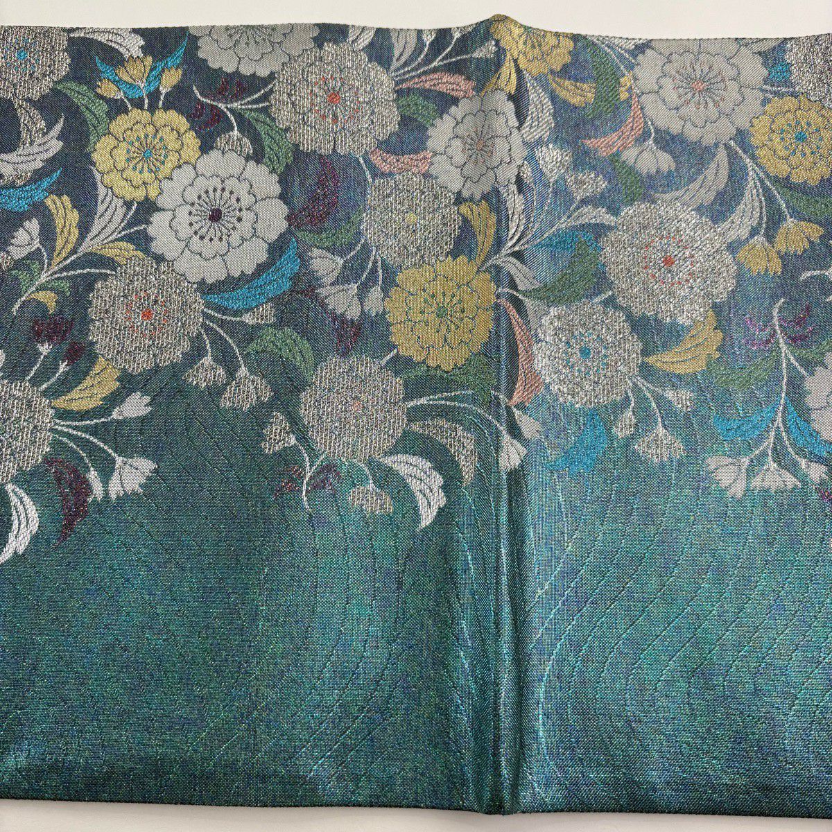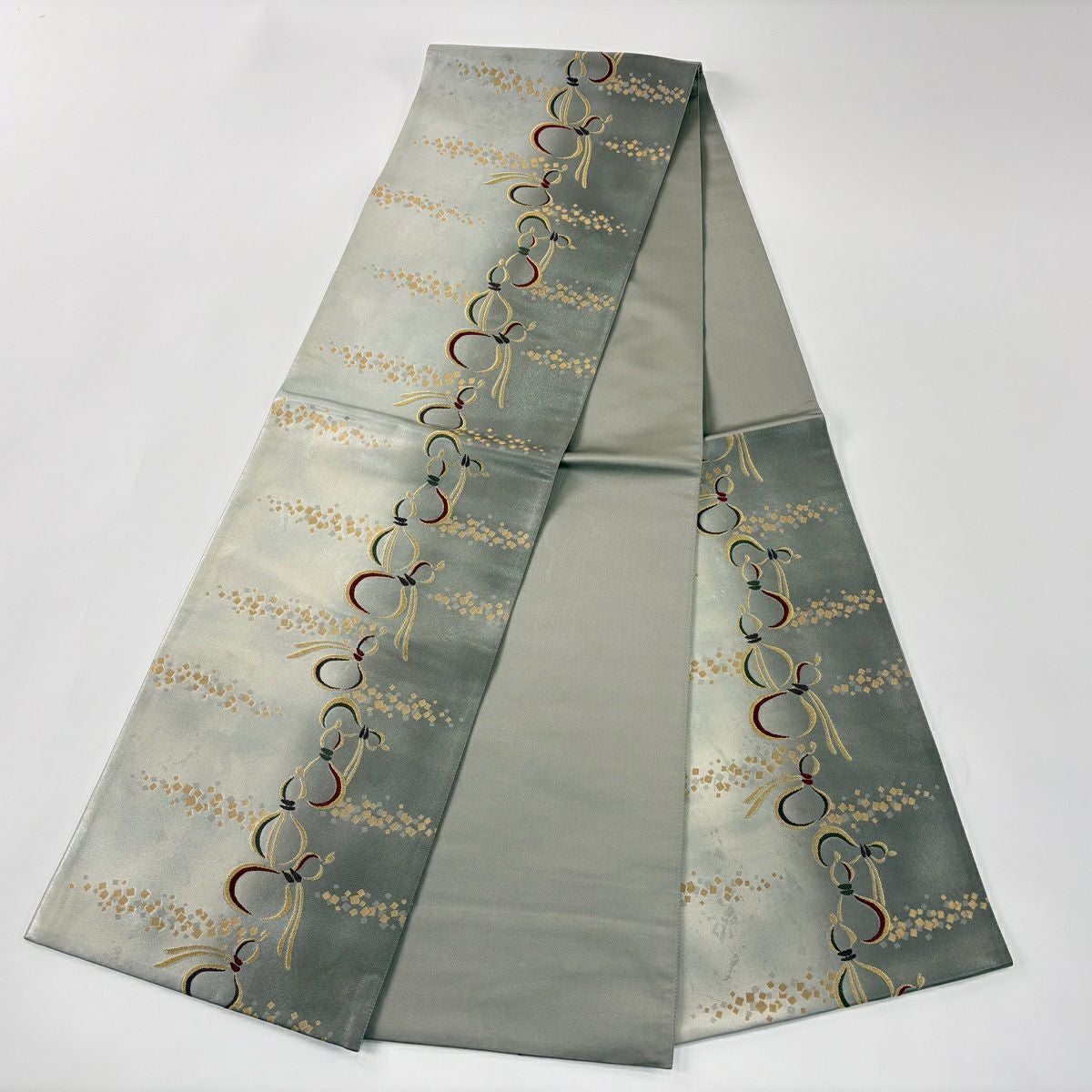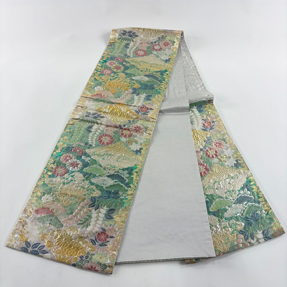 【美品】 袋帯 秀品 招宴吉兆花 波 金銀糸 箔 水色 六通 正絹
