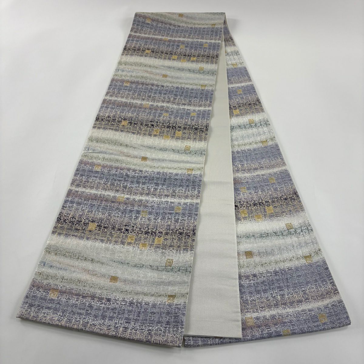 【美品】 袋帯 秀品 吉祥萬寿文 段縞模様 金糸 薄紫 全通 正絹