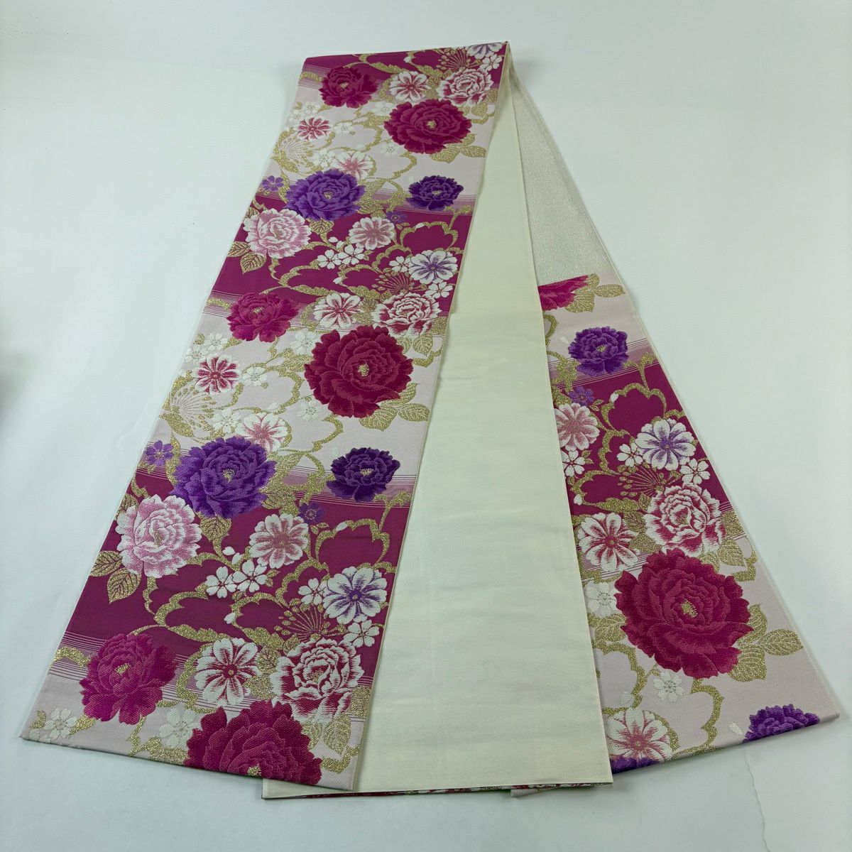 【美品】 袋帯 秀品 振袖向き 牡丹 桜 箔 ピンク 六通 正絹