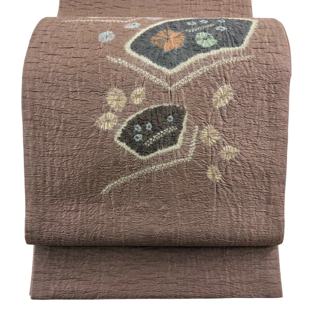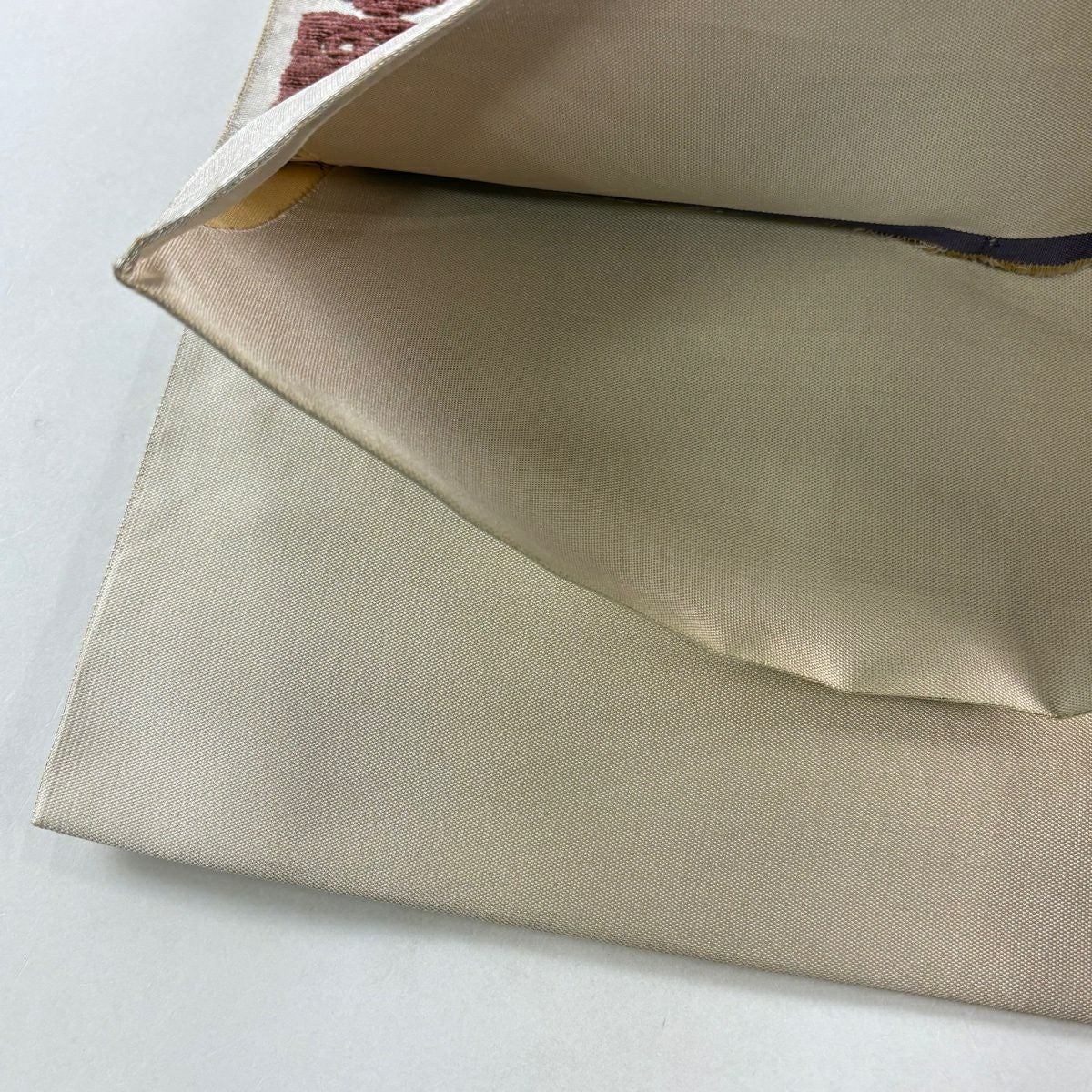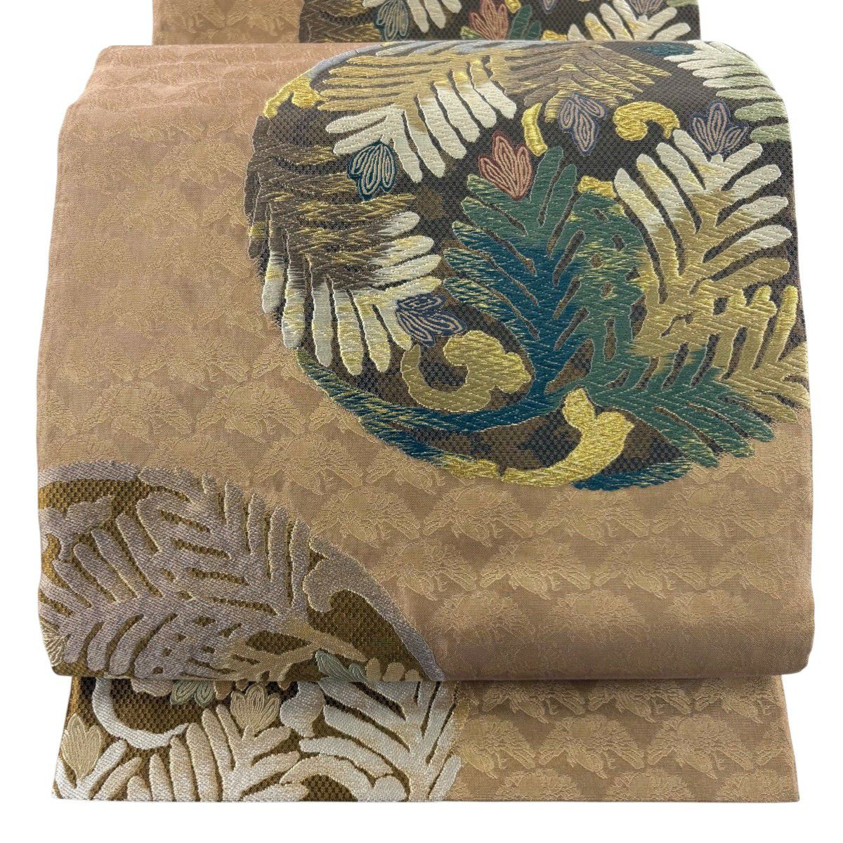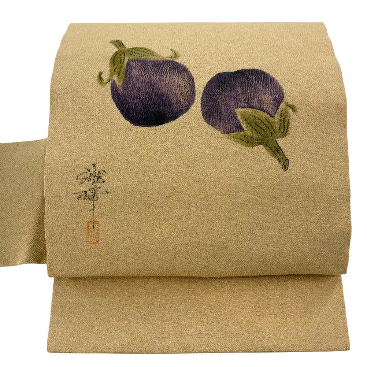 【美品】 名古屋帯 秀品 落款あり 茄子 縮緬 ベージュ 正絹