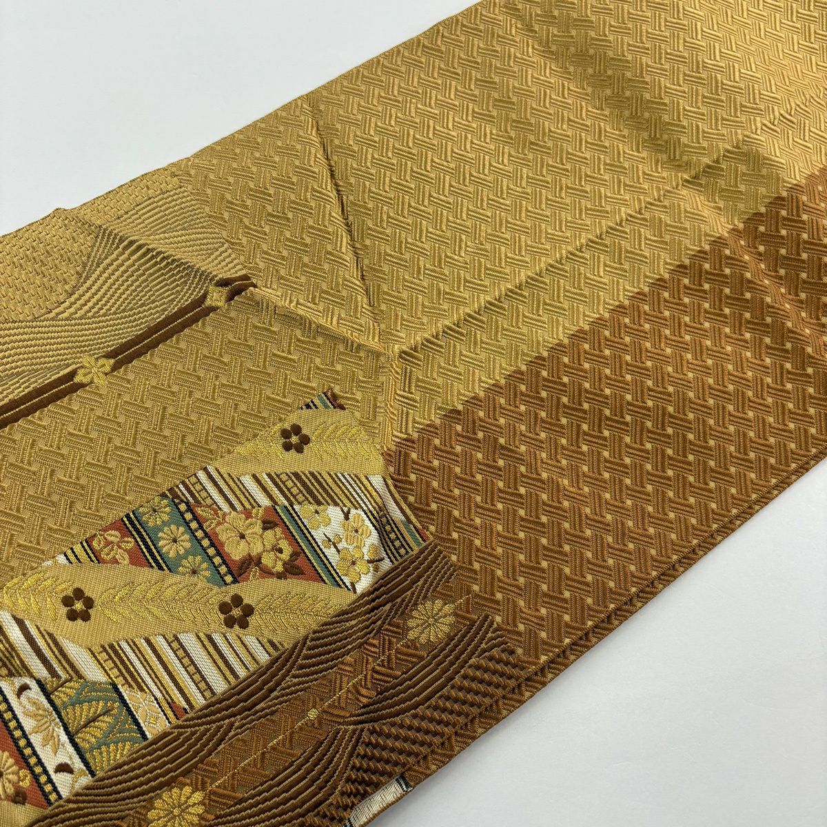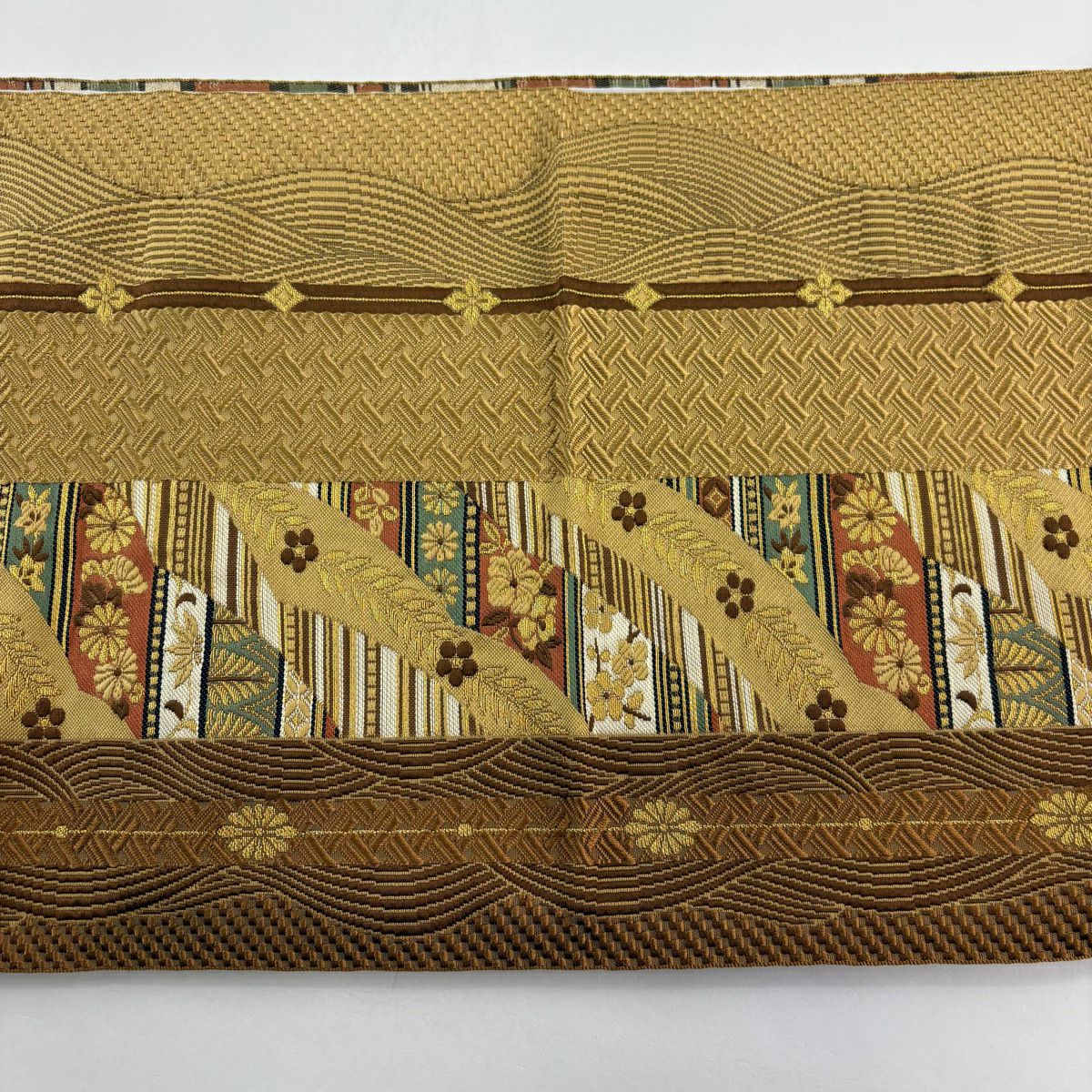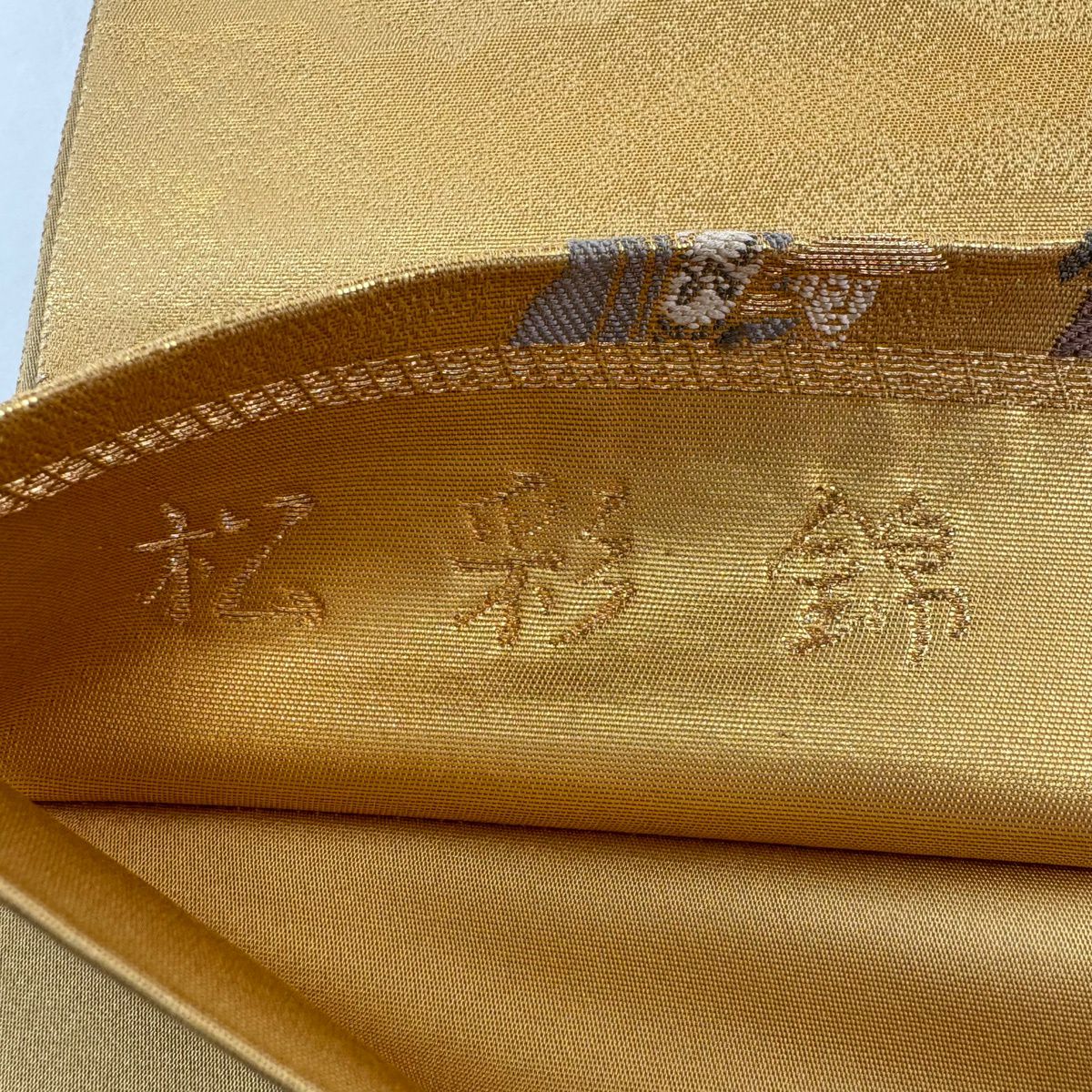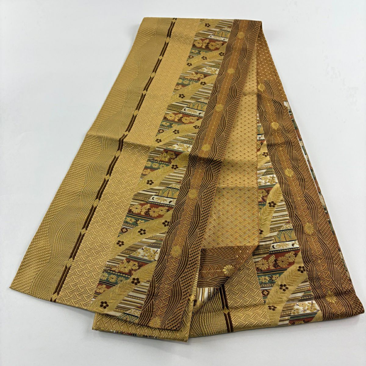 名古屋帯 秀品 八寸名古屋帯 松葉仕立て 縞 草花 金糸 山吹茶色 正絹