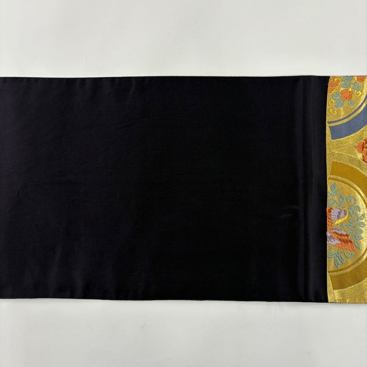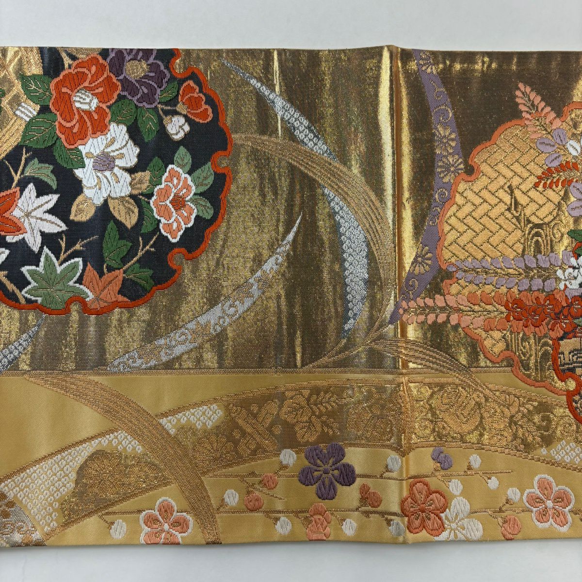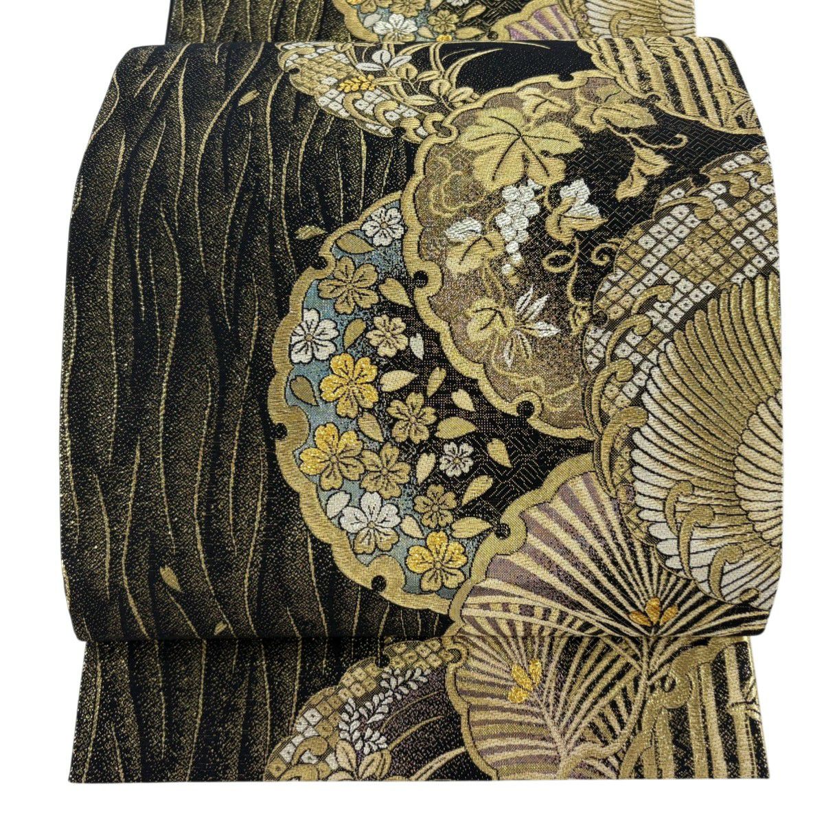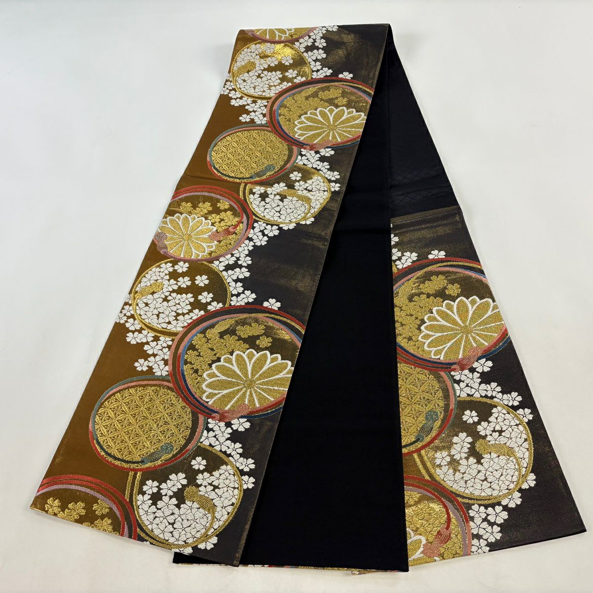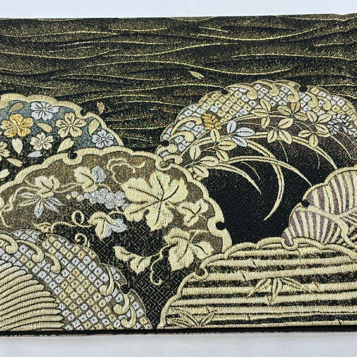 【美品】 袋帯 秀品 輝金錦 雪輪 草花 金糸 箔 黒 六通 正絹