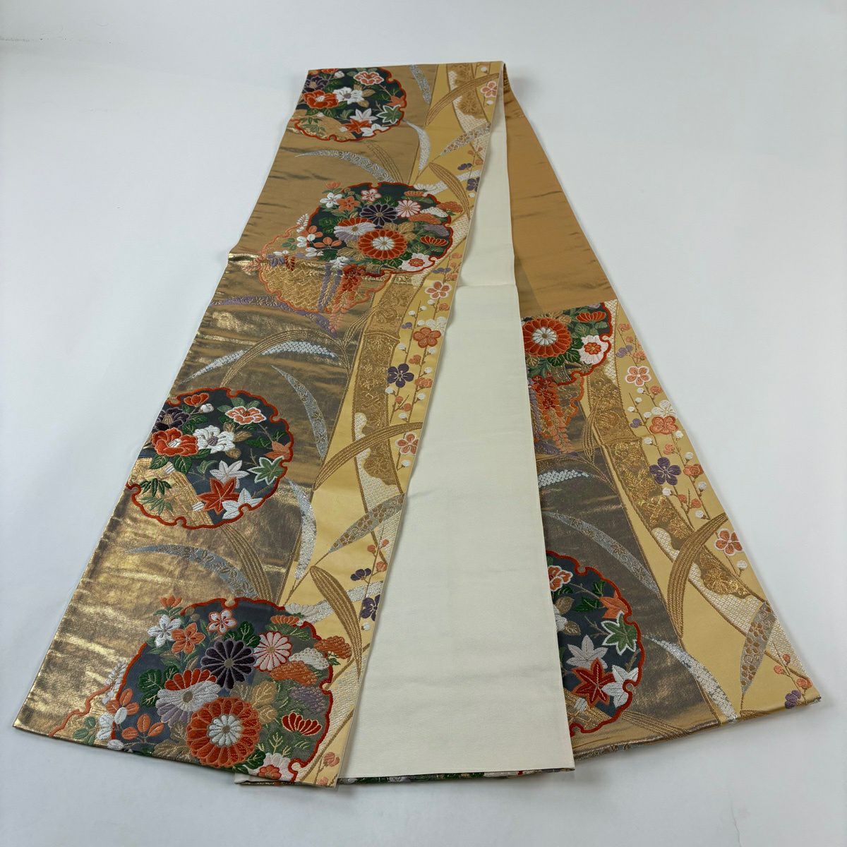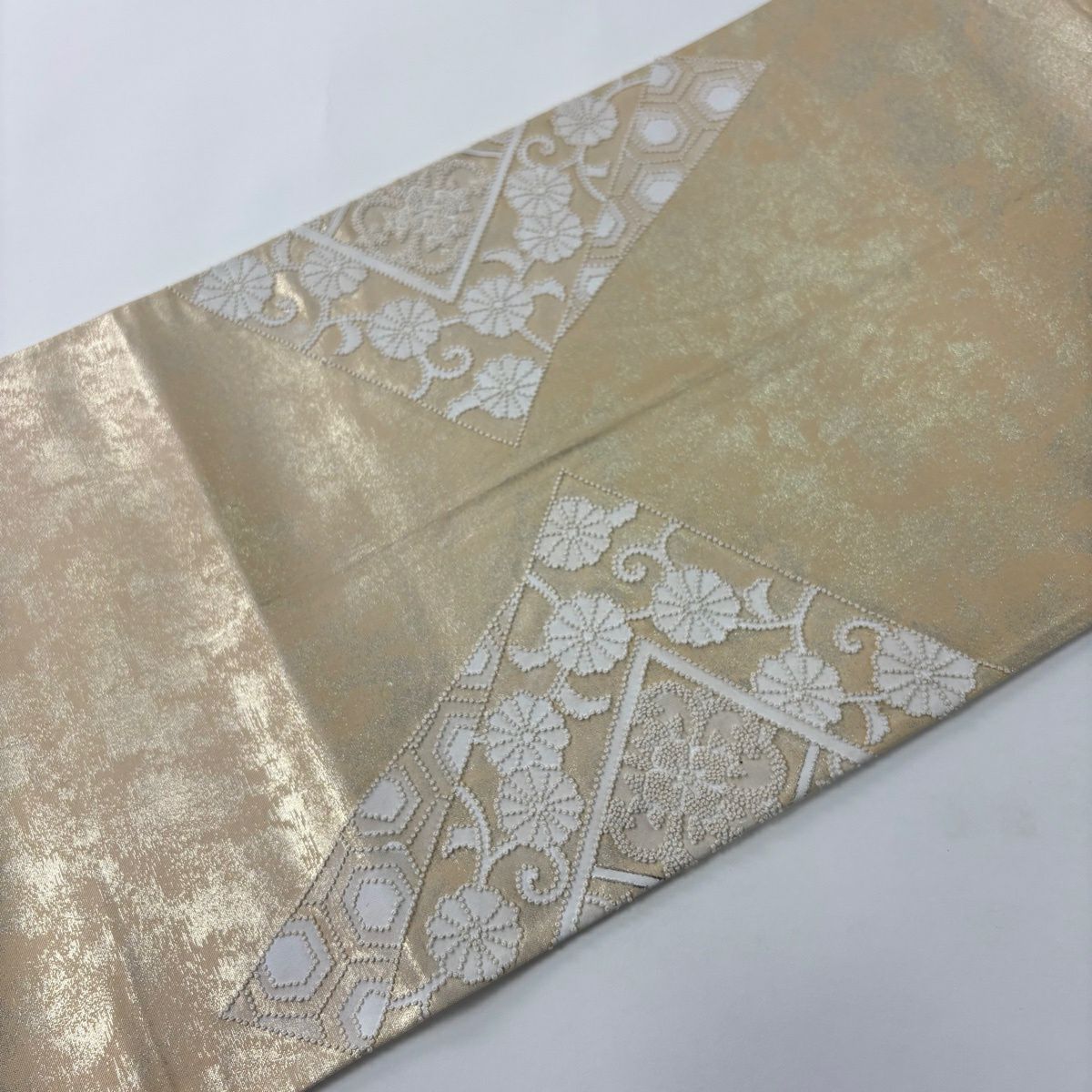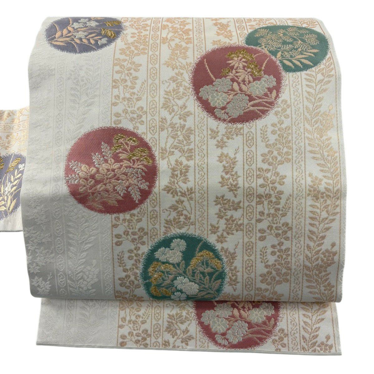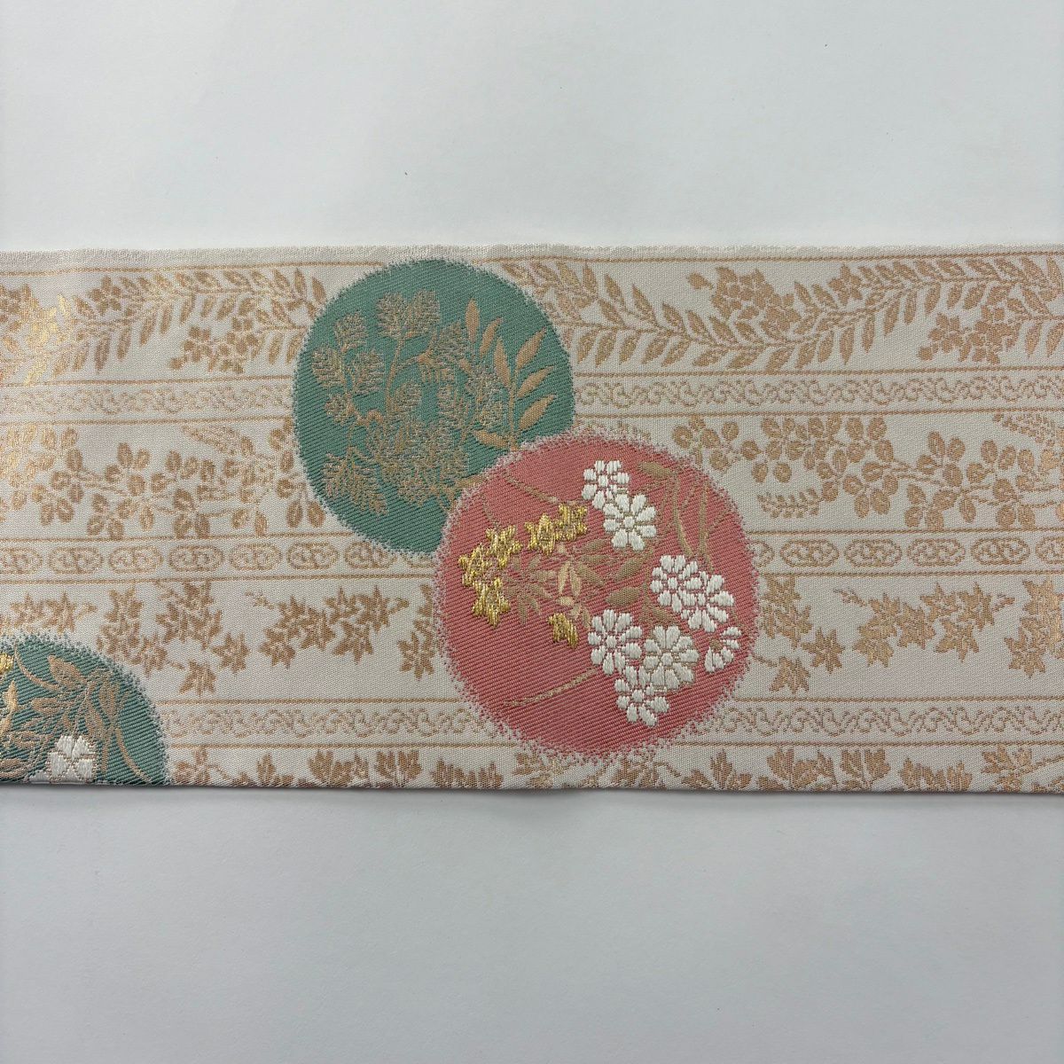 【美品】 袋帯 秀品 雪輪 菊 唐織 箔 ベージュ 六通 正絹