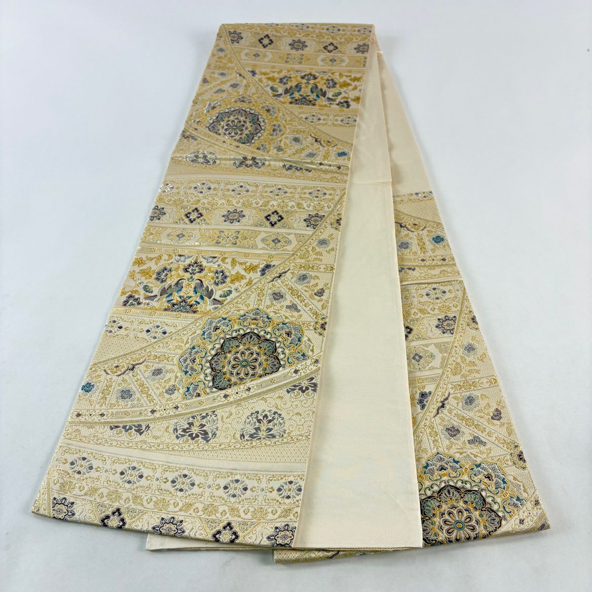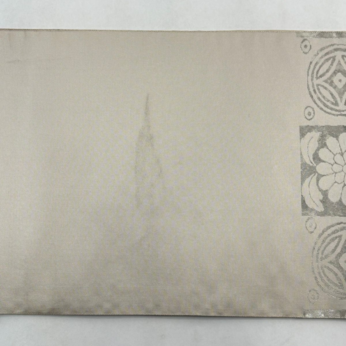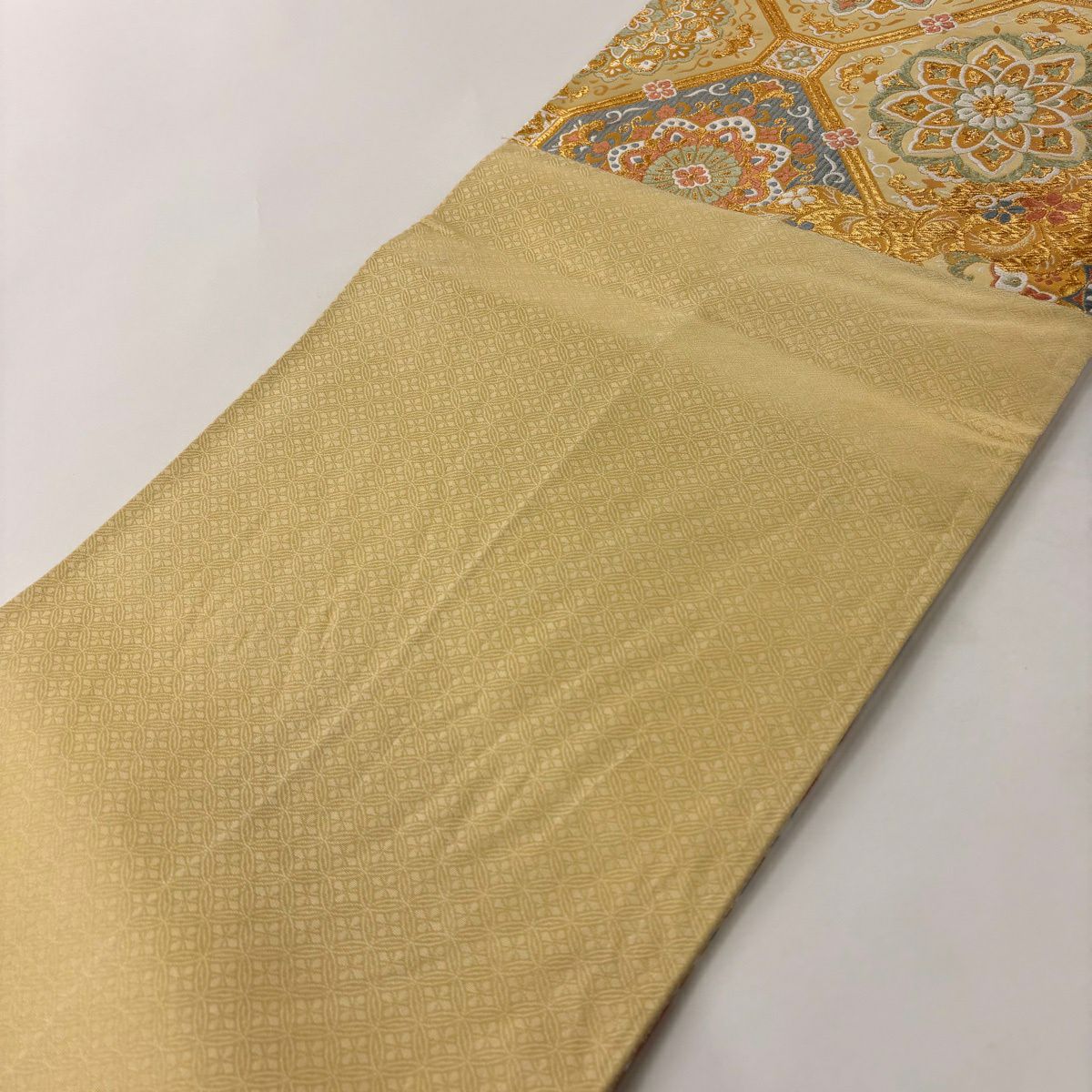 【美品】 袋帯 秀品 雪輪 菊 唐織 箔 ベージュ 六通 正絹