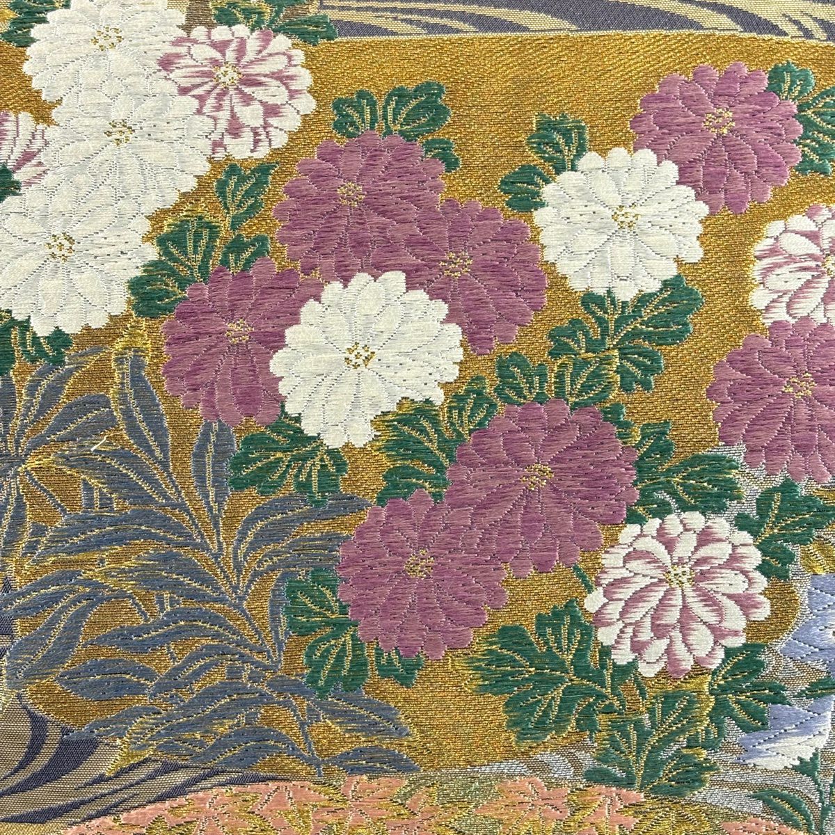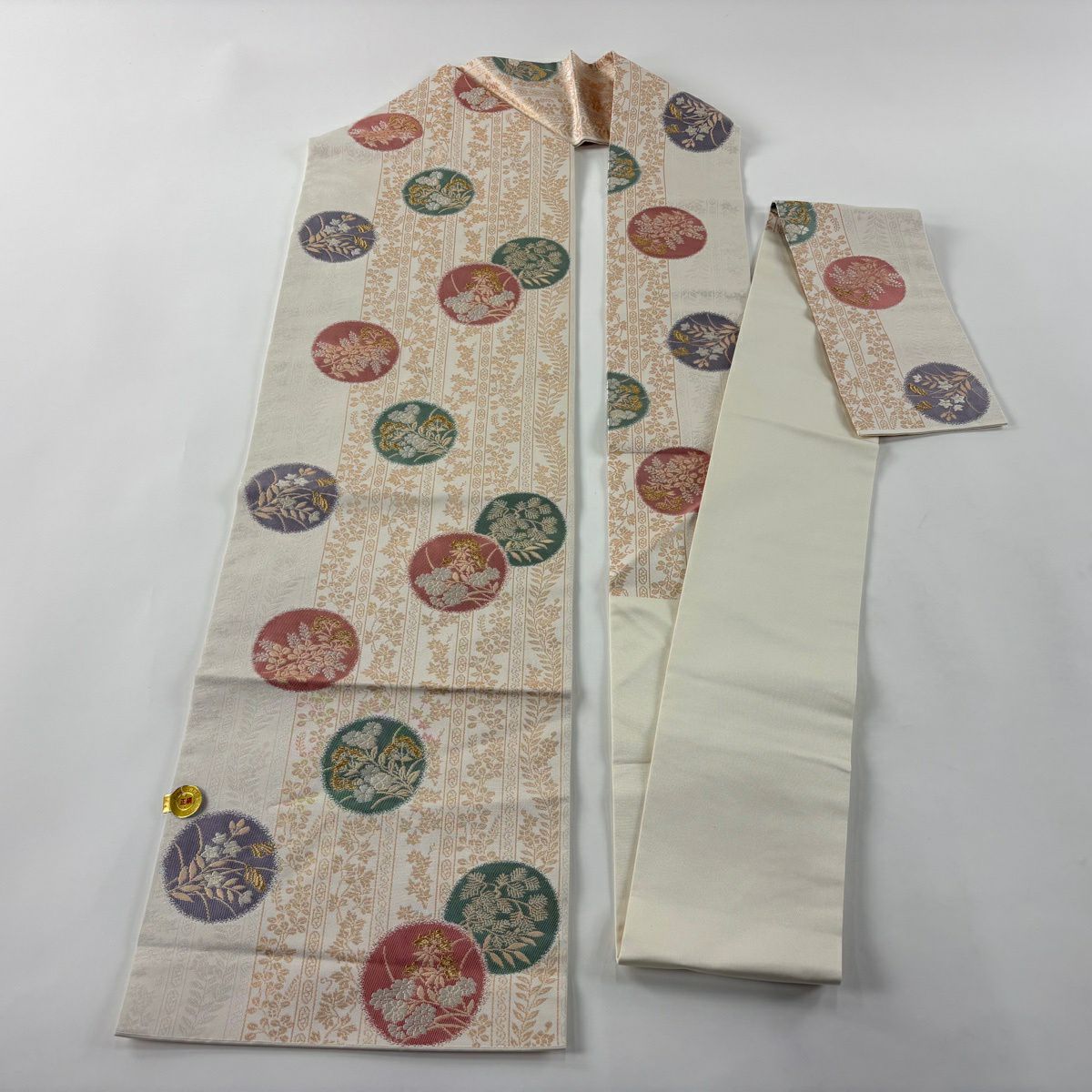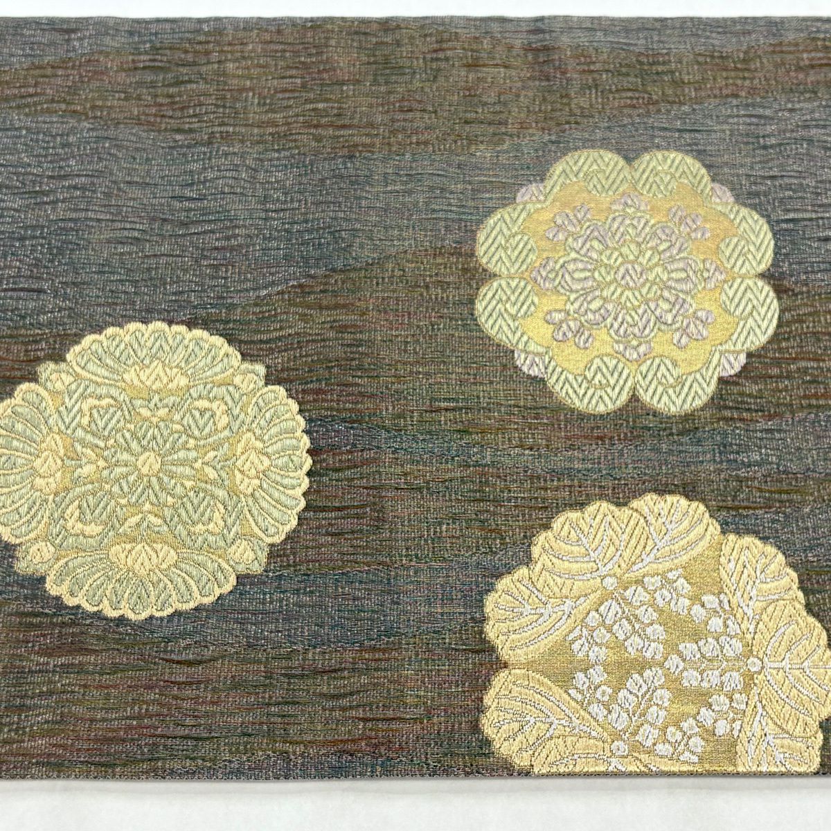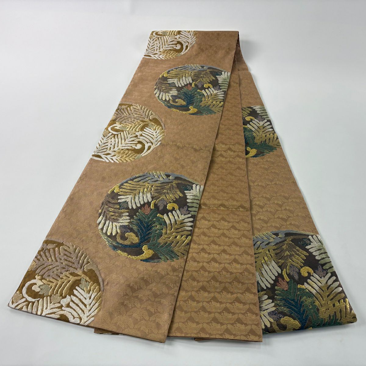 【美品】 袋帯 秀品 雪輪 菊 唐織 箔 ベージュ 六通 正絹