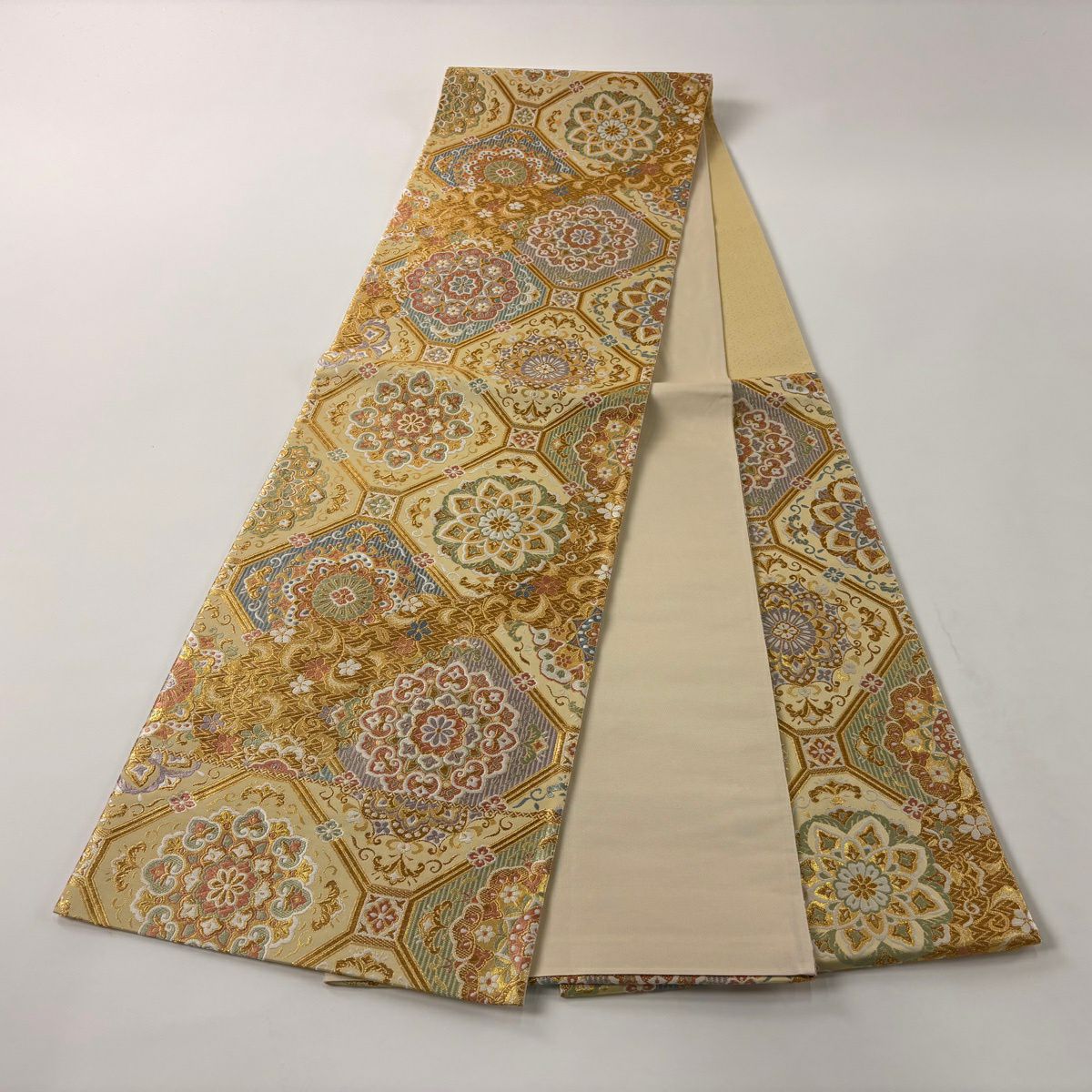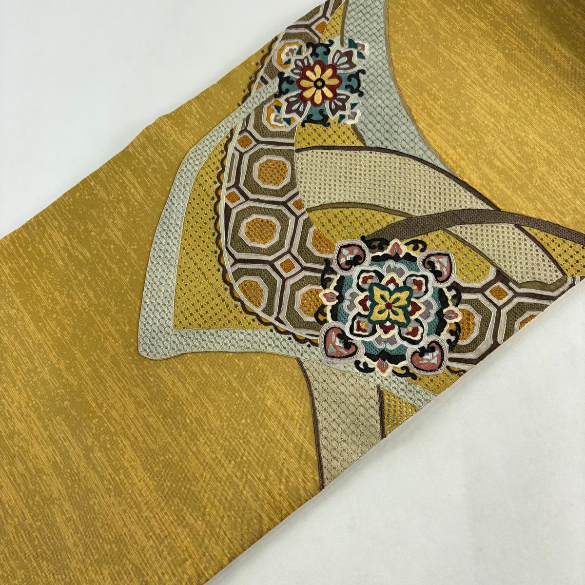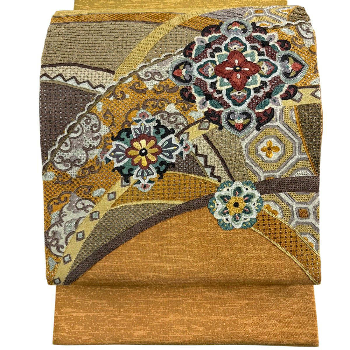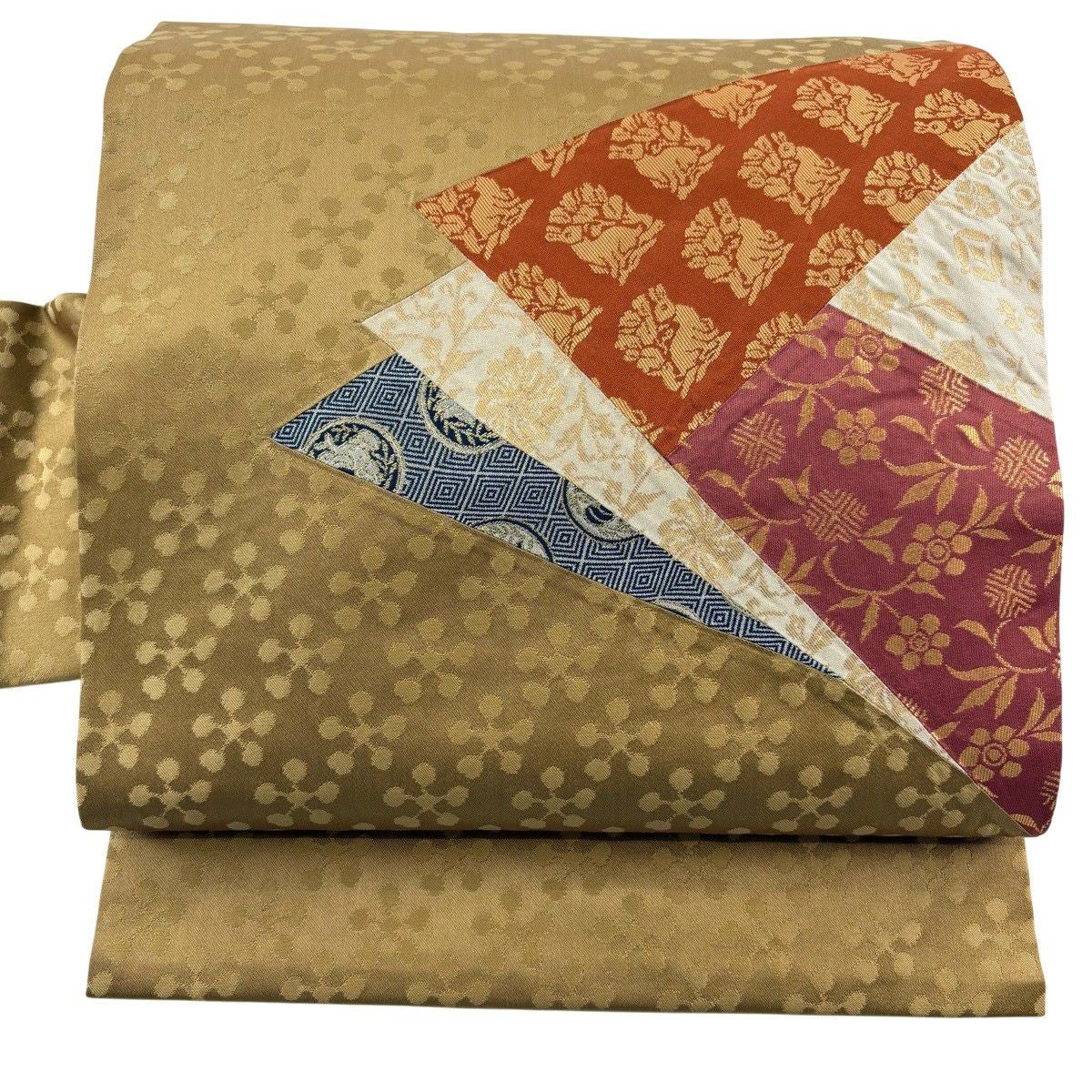 【美品】 名古屋帯 秀品 名物裂文様 梅鉢 切嵌め 箔 黄土色 正絹