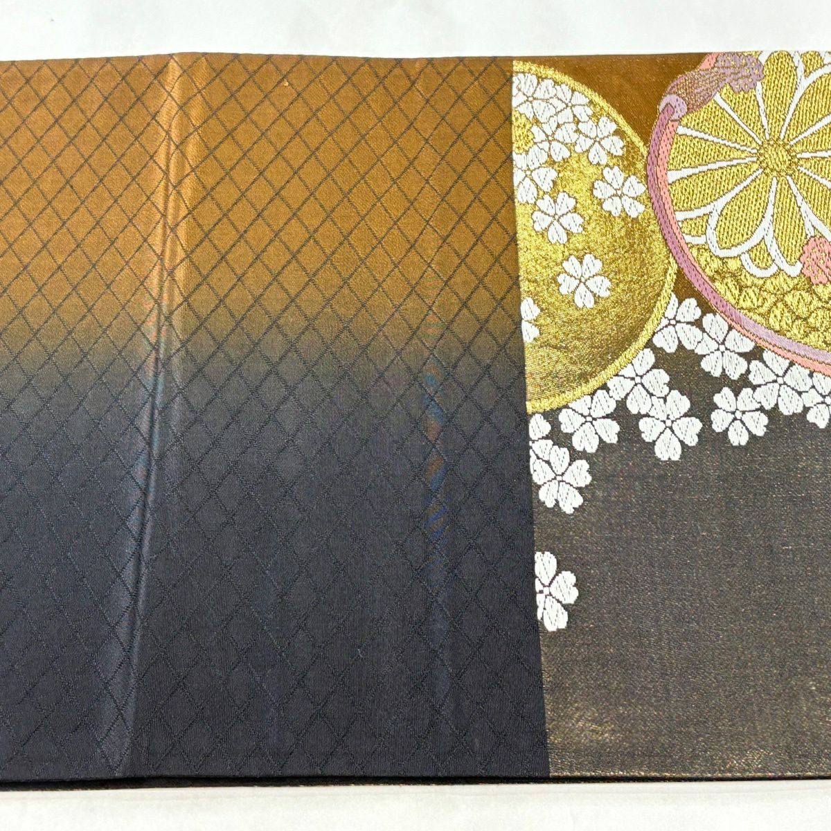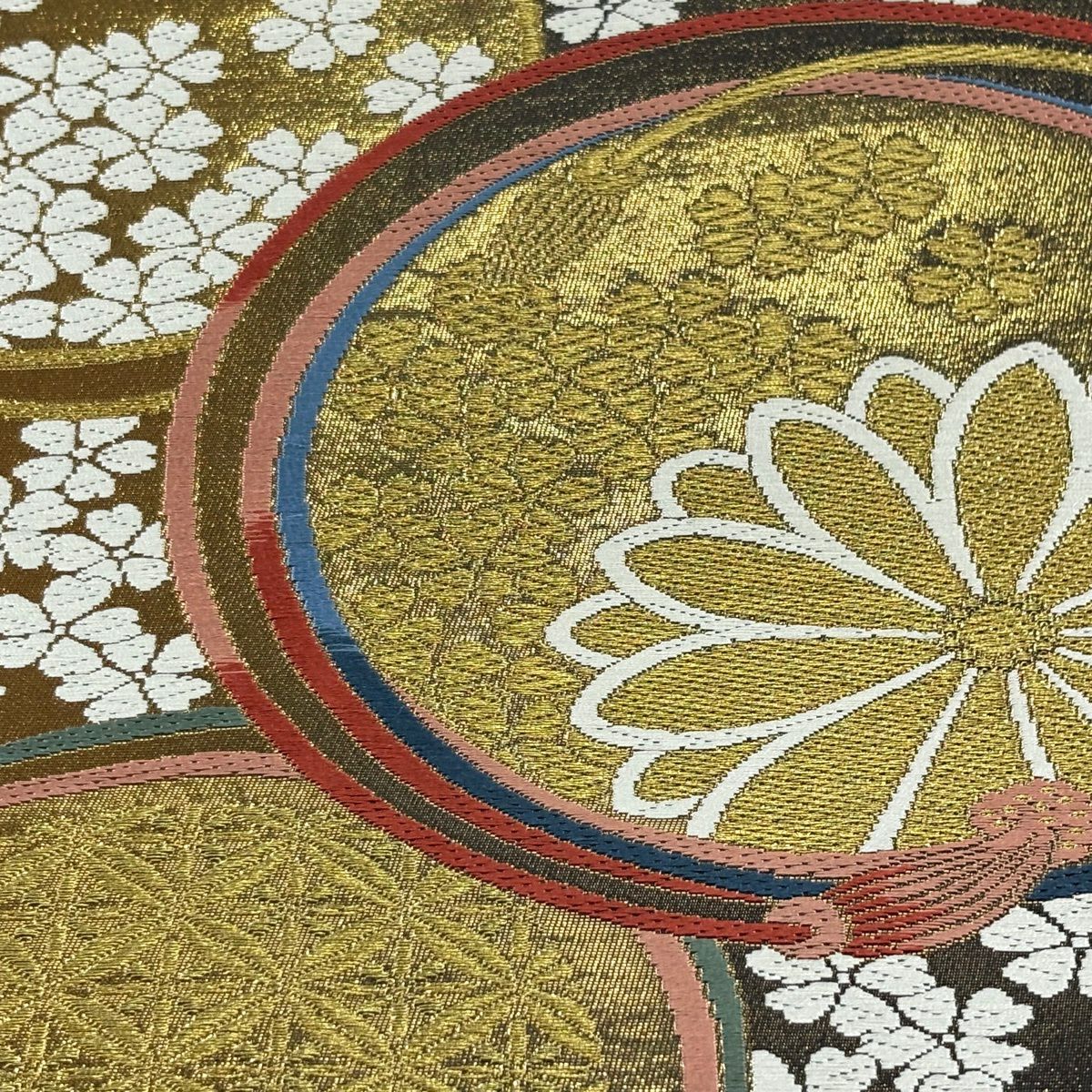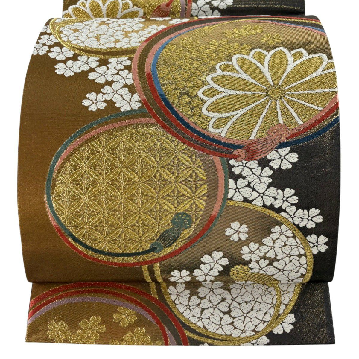 【美品】 袋帯 秀品 振袖向き 桜 七宝 箔 金糸 金茶 六通 正絹