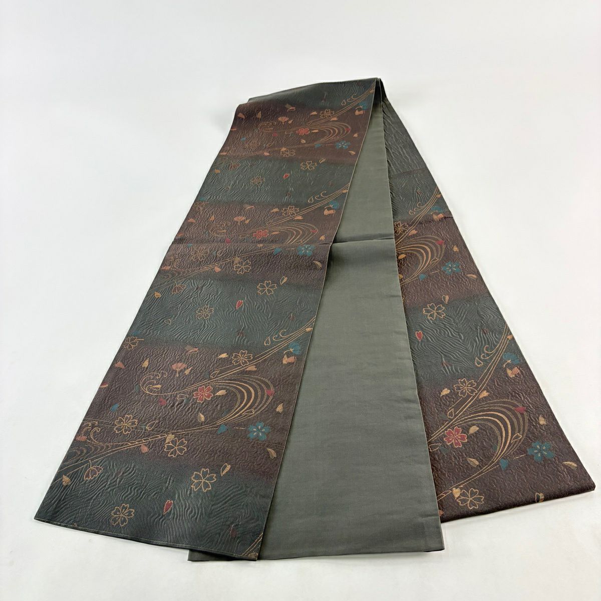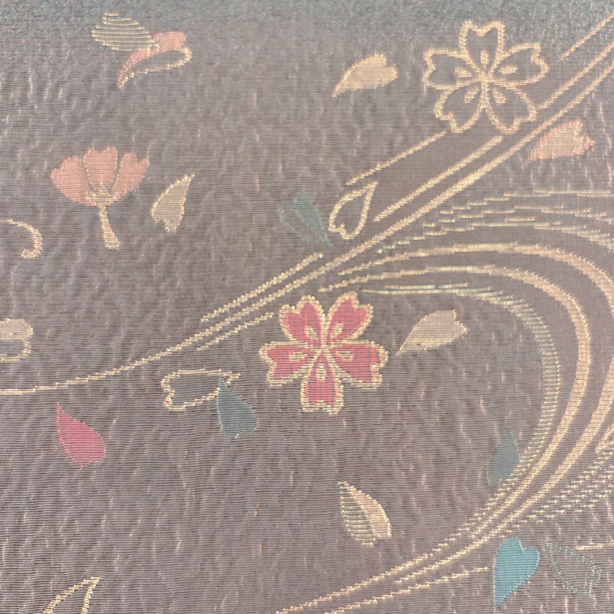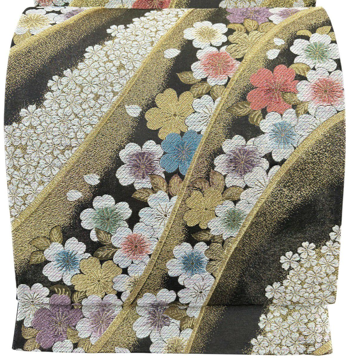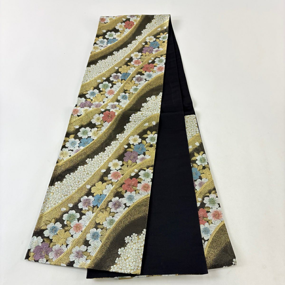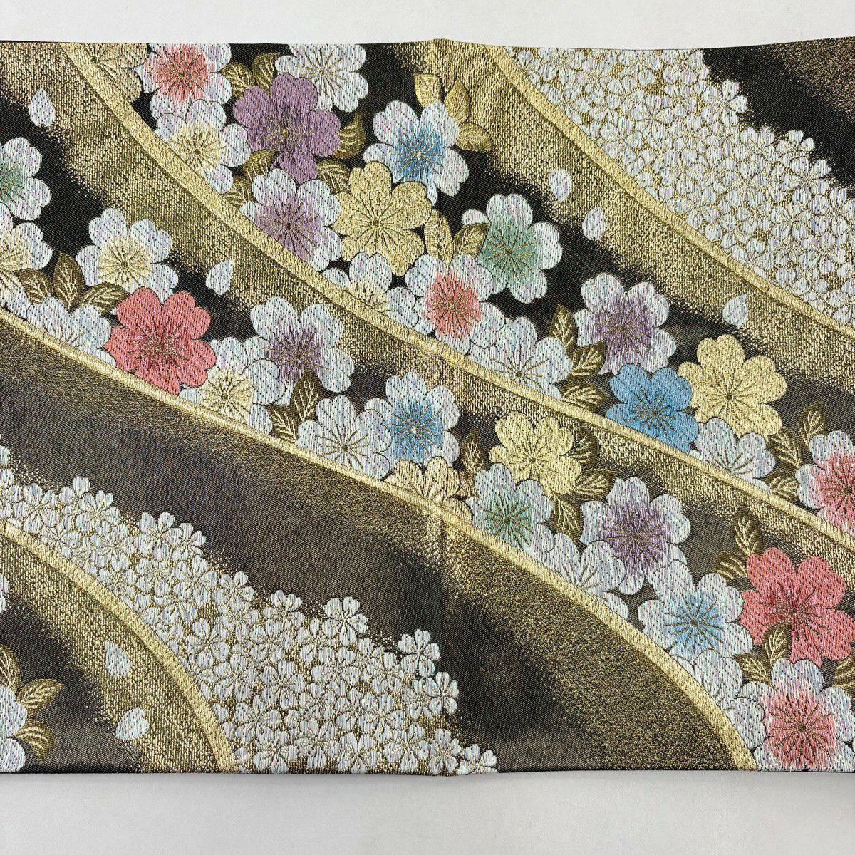 【美品】 袋帯 秀品 振袖向き 桜 流水 金糸 箔 金色 六通 正絹