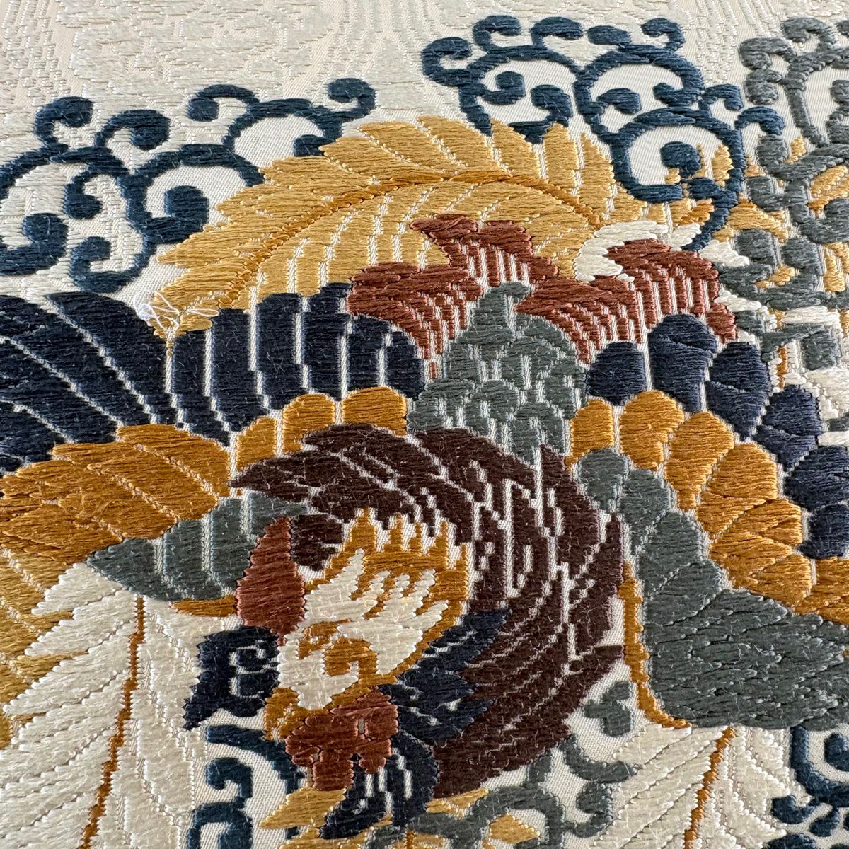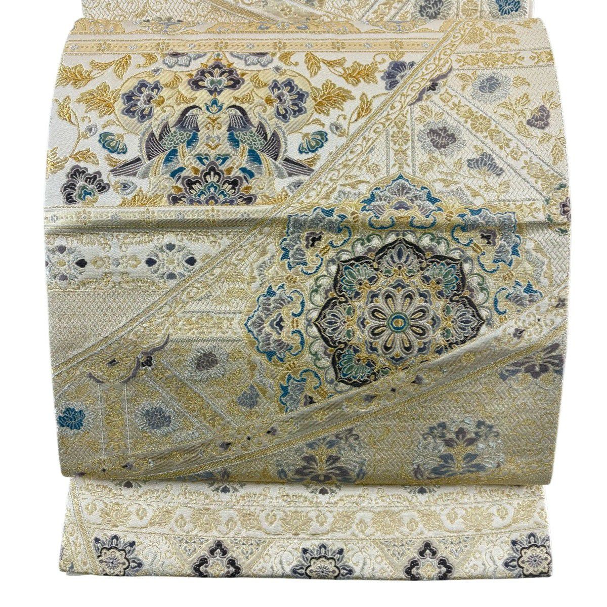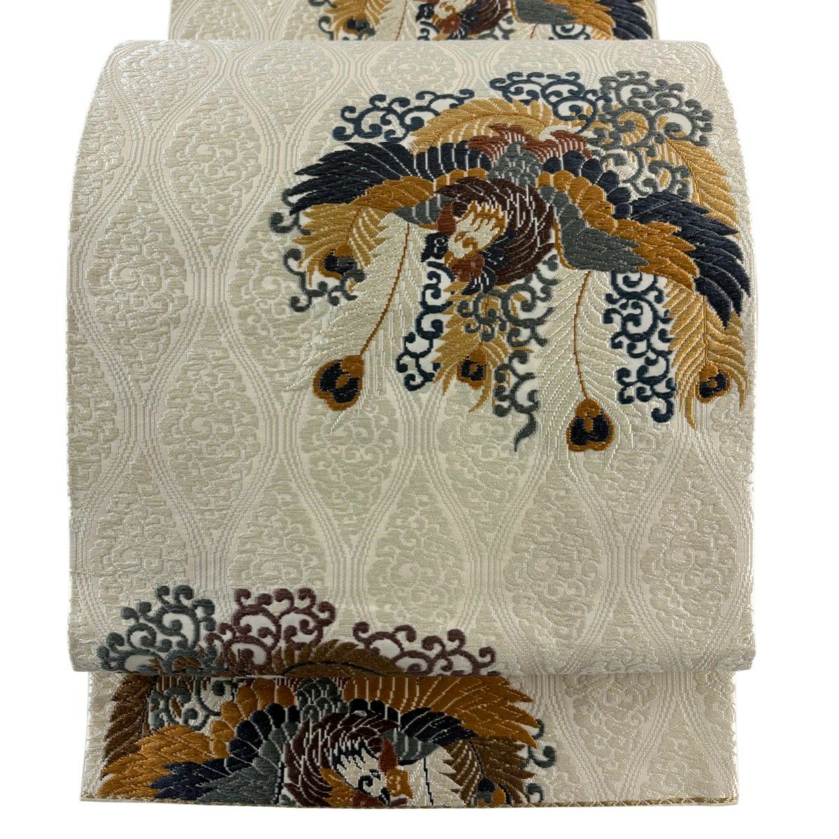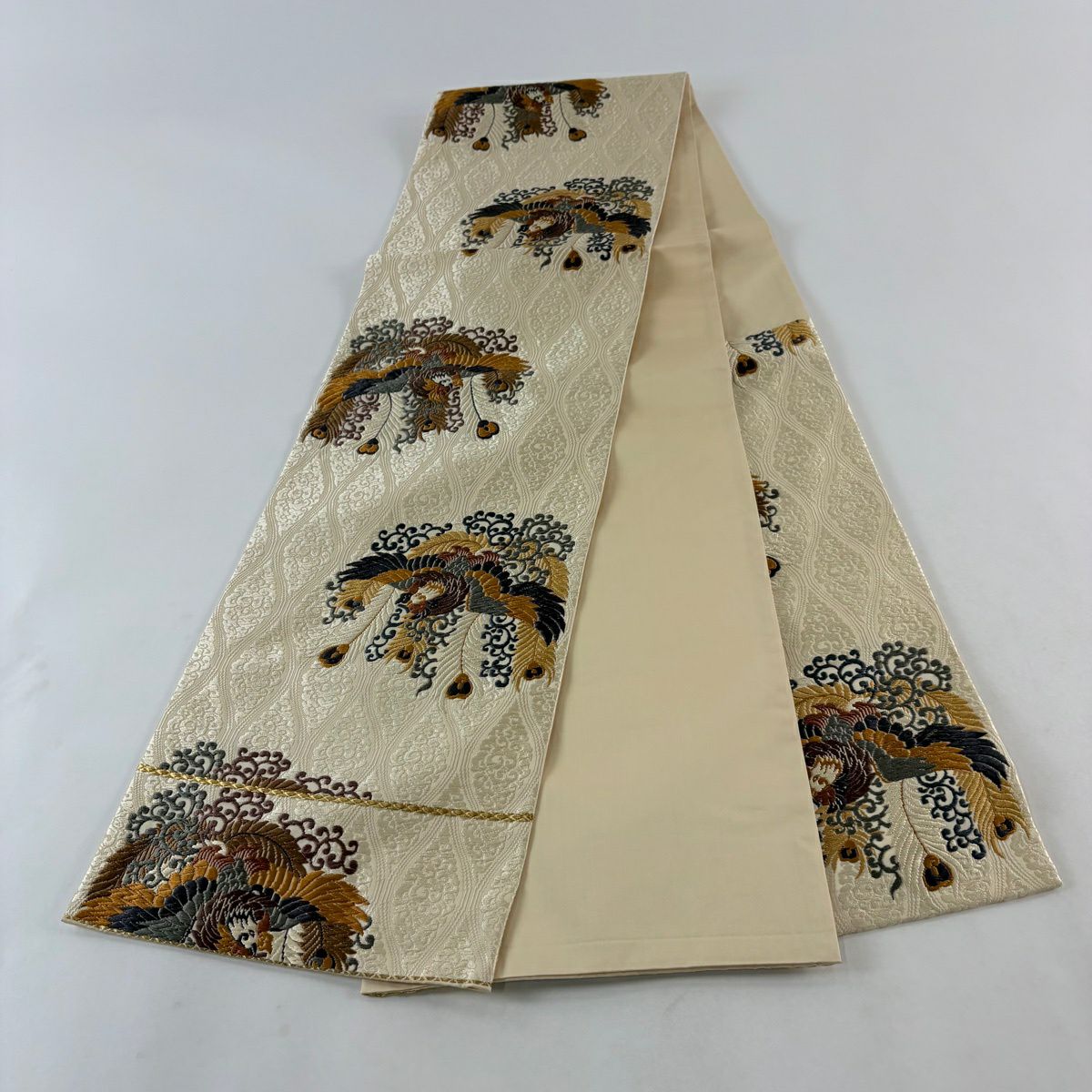 袋帯 秀品 華文 向かい鳥 金銀糸 刺繍 ベージュ 六通 正絹