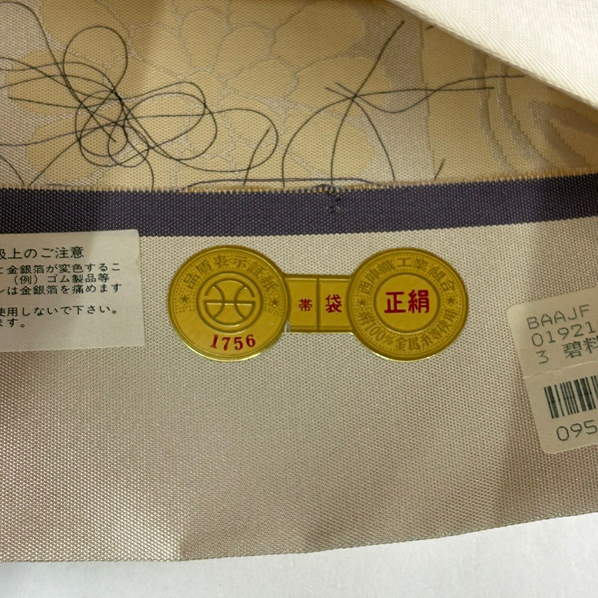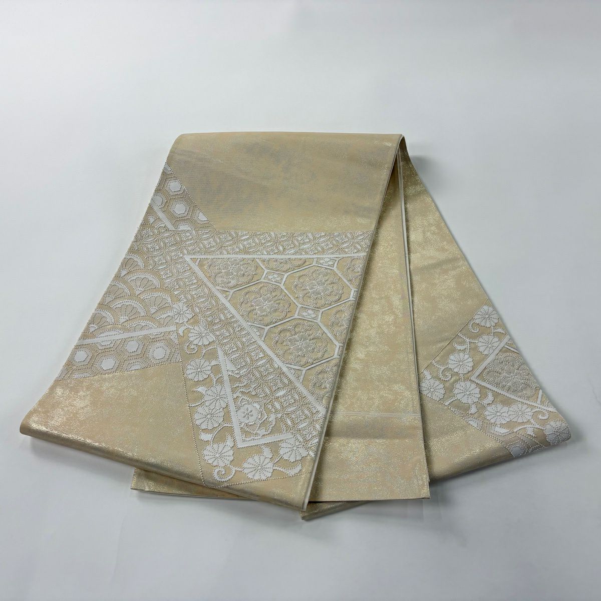 袋帯 秀品 証紙あり 七宝 菊 刺繍 箔 ベージュ 六通 正絹