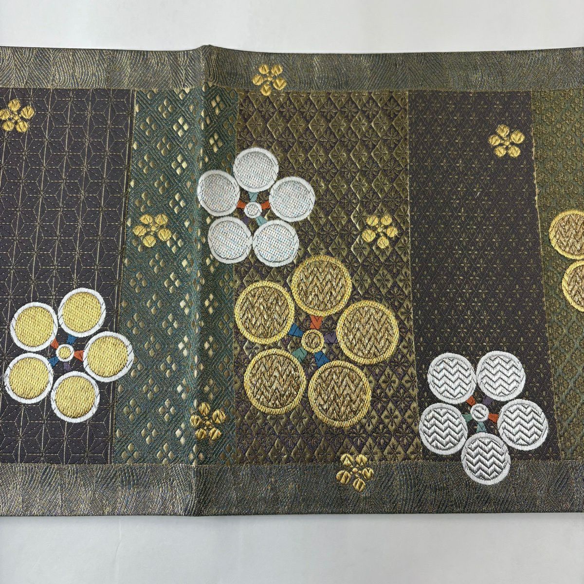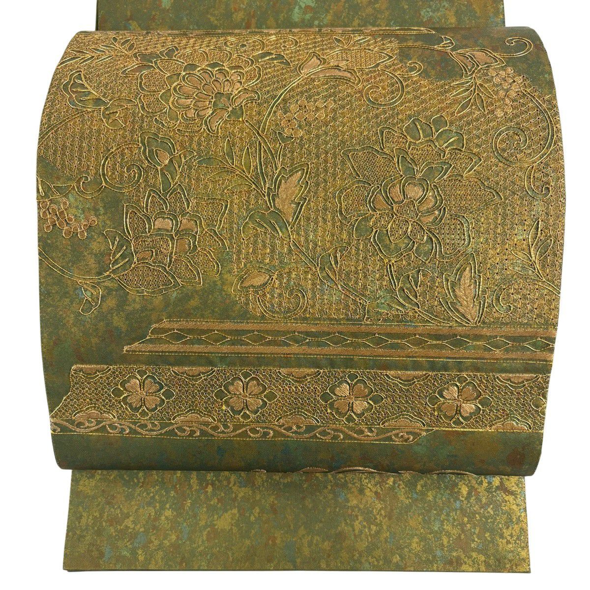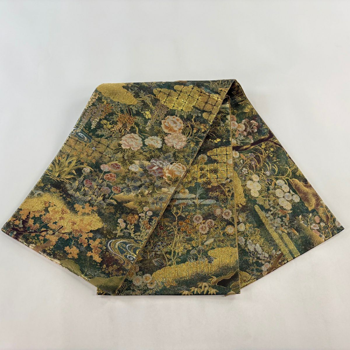 30%OFF 袋帯 秀品 幾何学 箔 深緑 お太鼓柄 正絹 K30