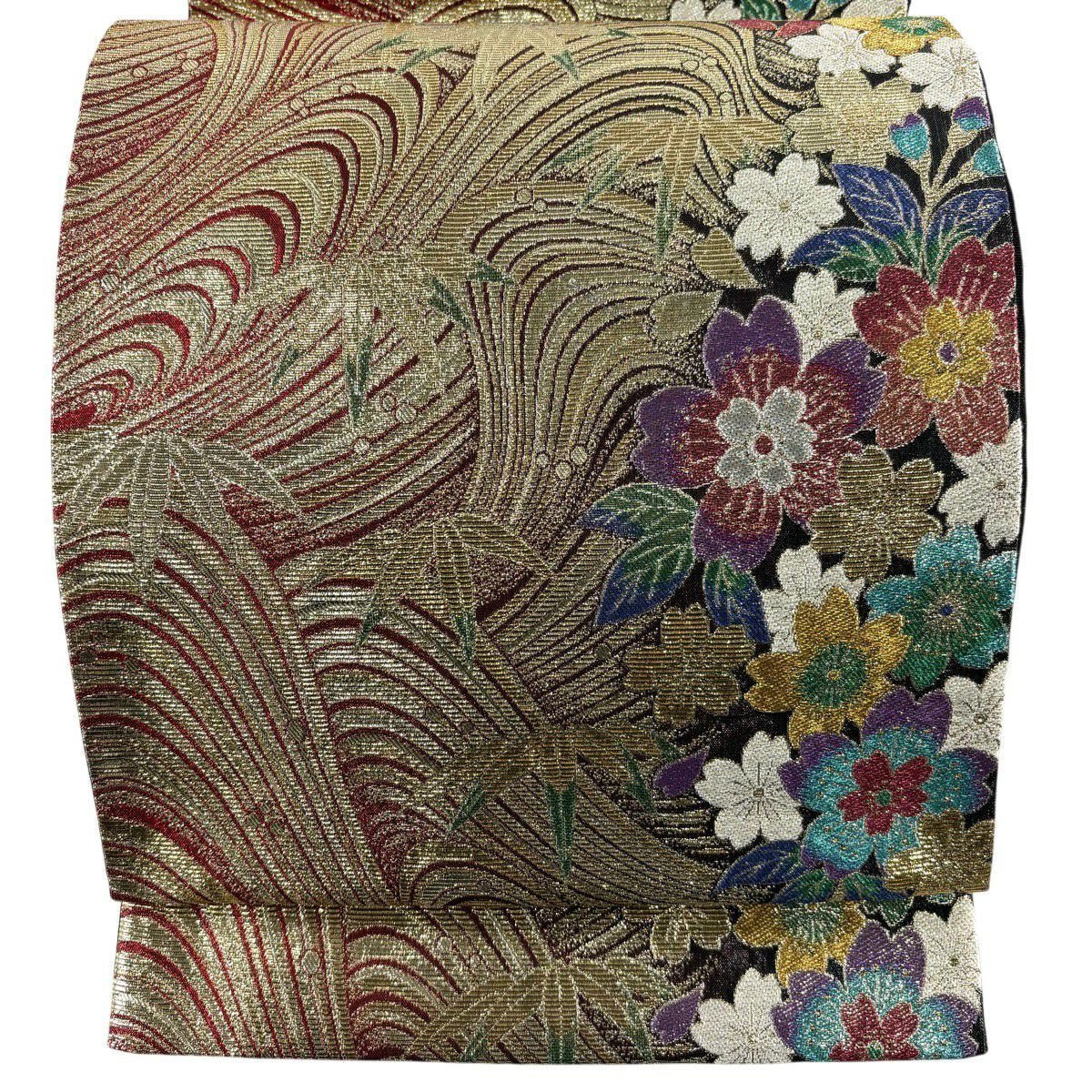 30%OFF 袋帯 秀品 草花 波 金彩 朱色 全通 正絹 K30