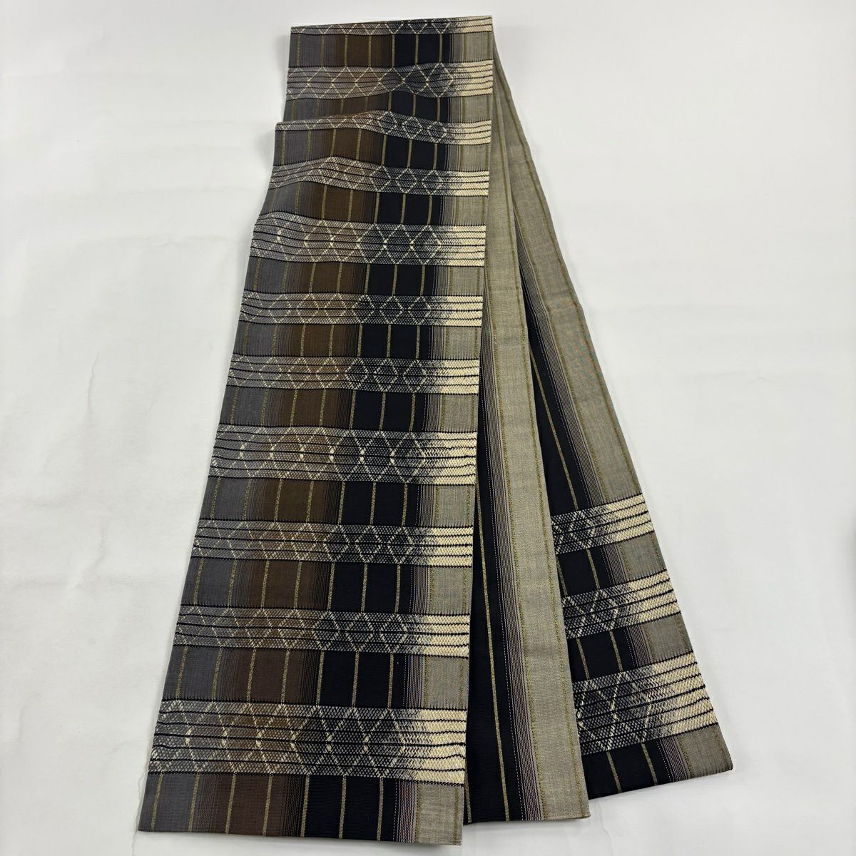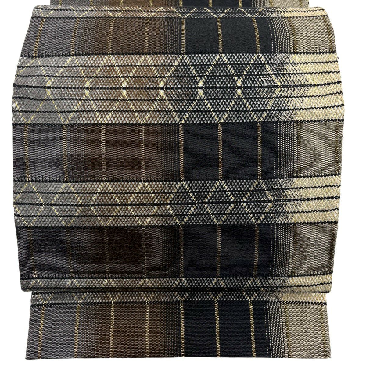 30%OFF 袋帯 秀品 幾何学模様 縞 茶色 六通 正絹 K30