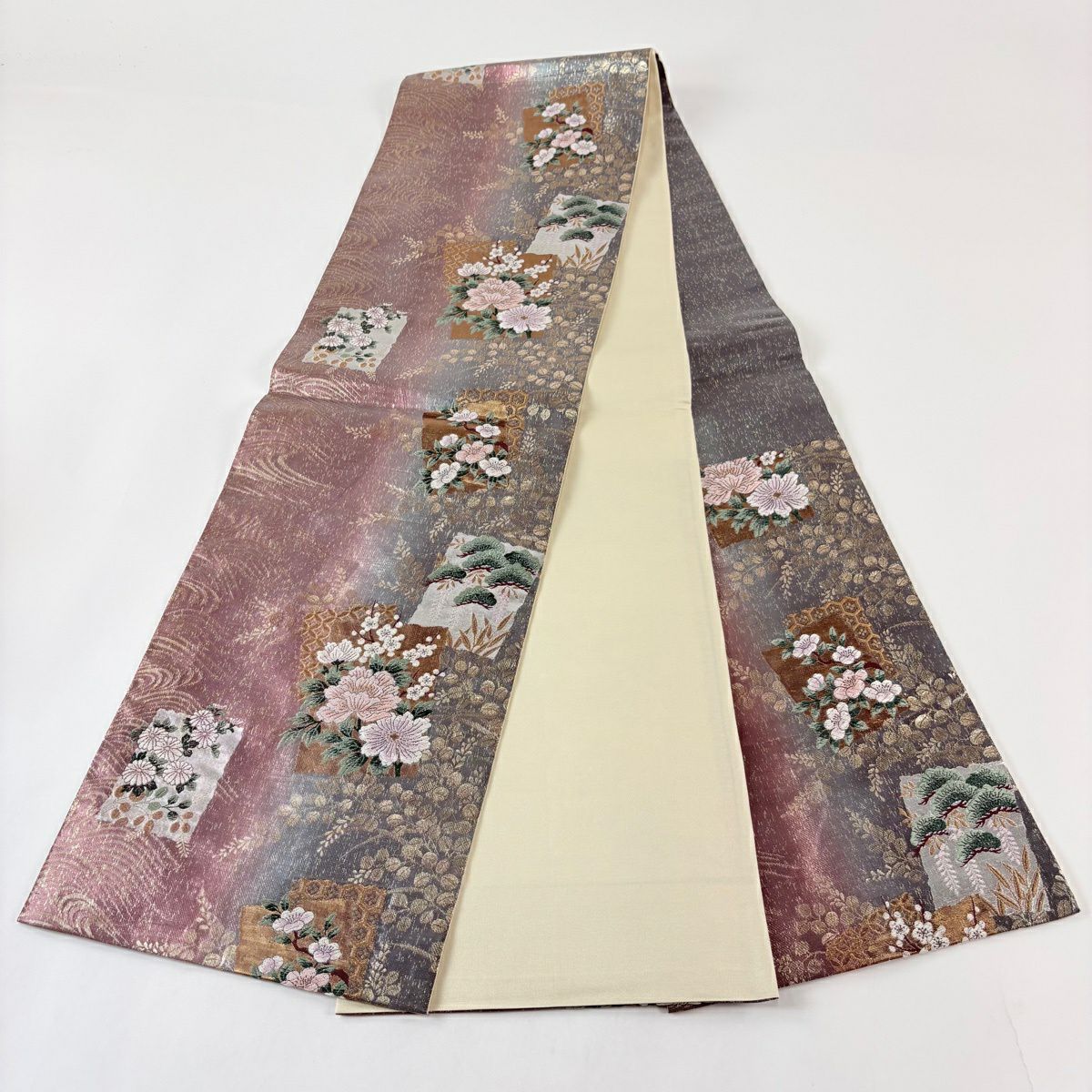 30%OFF 袋帯 秀品 平絹錦 霞 クリーム 六通 正絹 K30